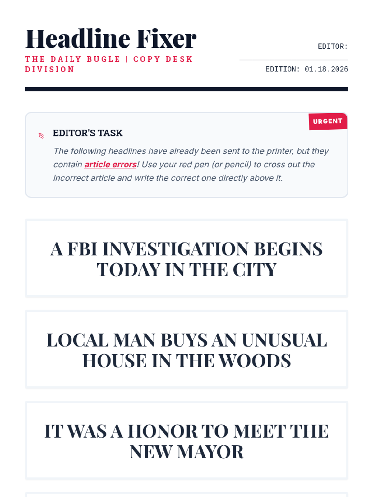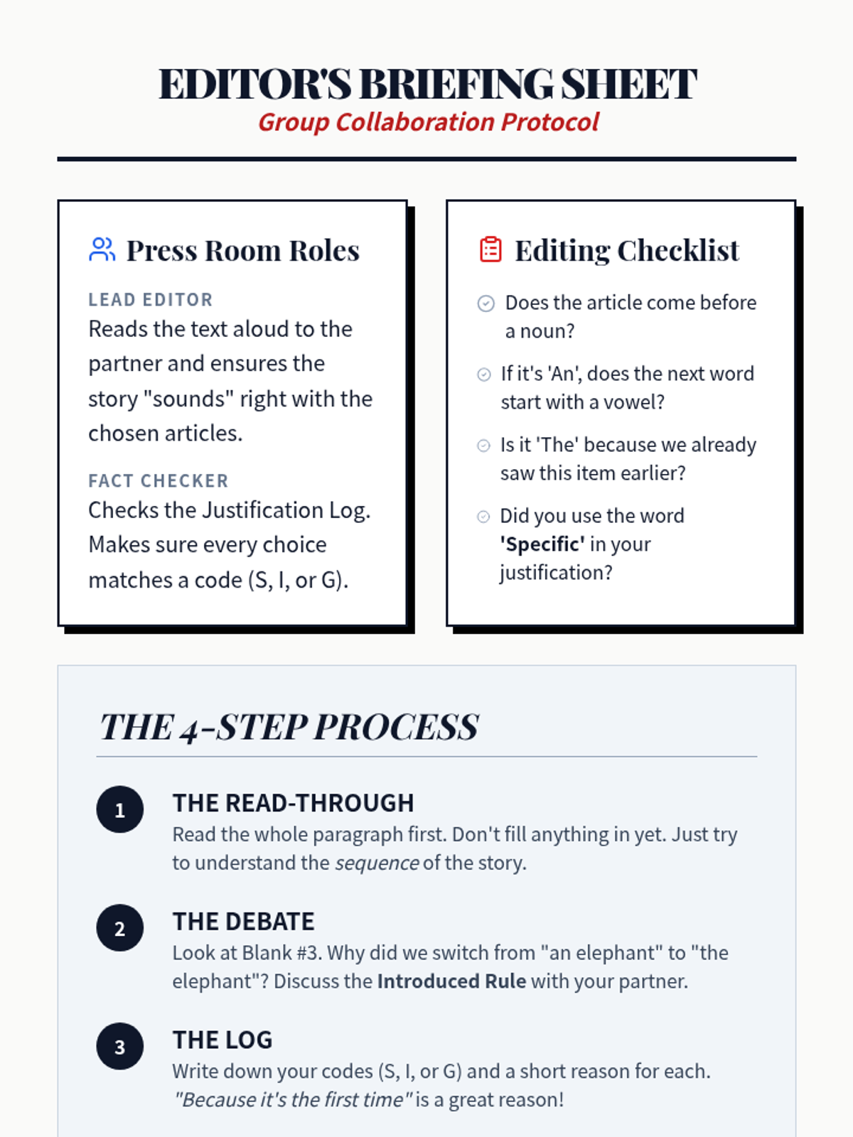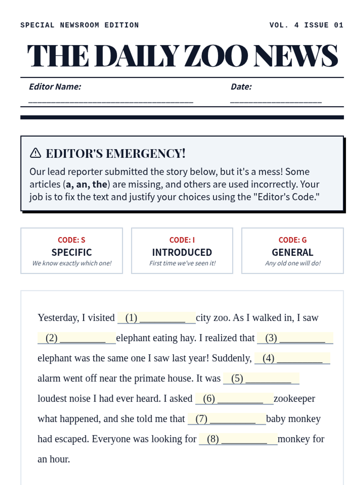 A journalism-themed lesson where students become editors to master the use of definite and indefinite articles through a zoo-themed editing challenge.