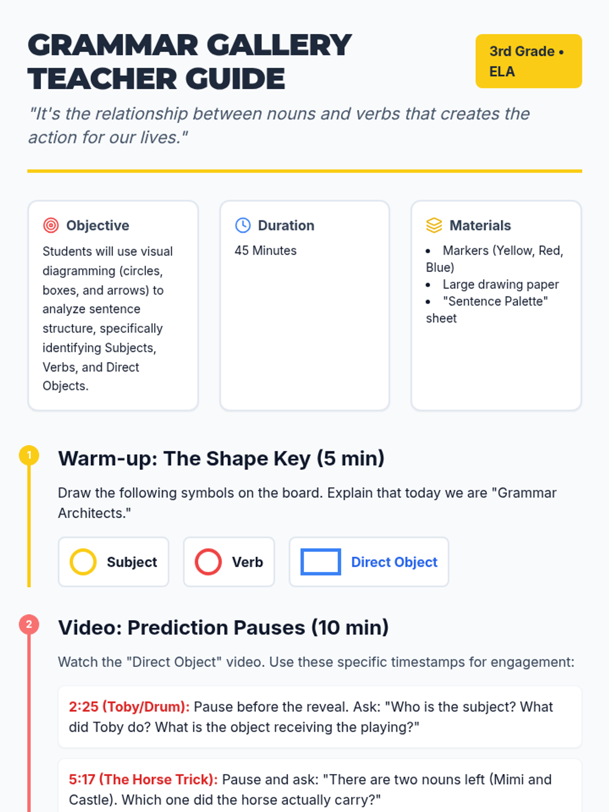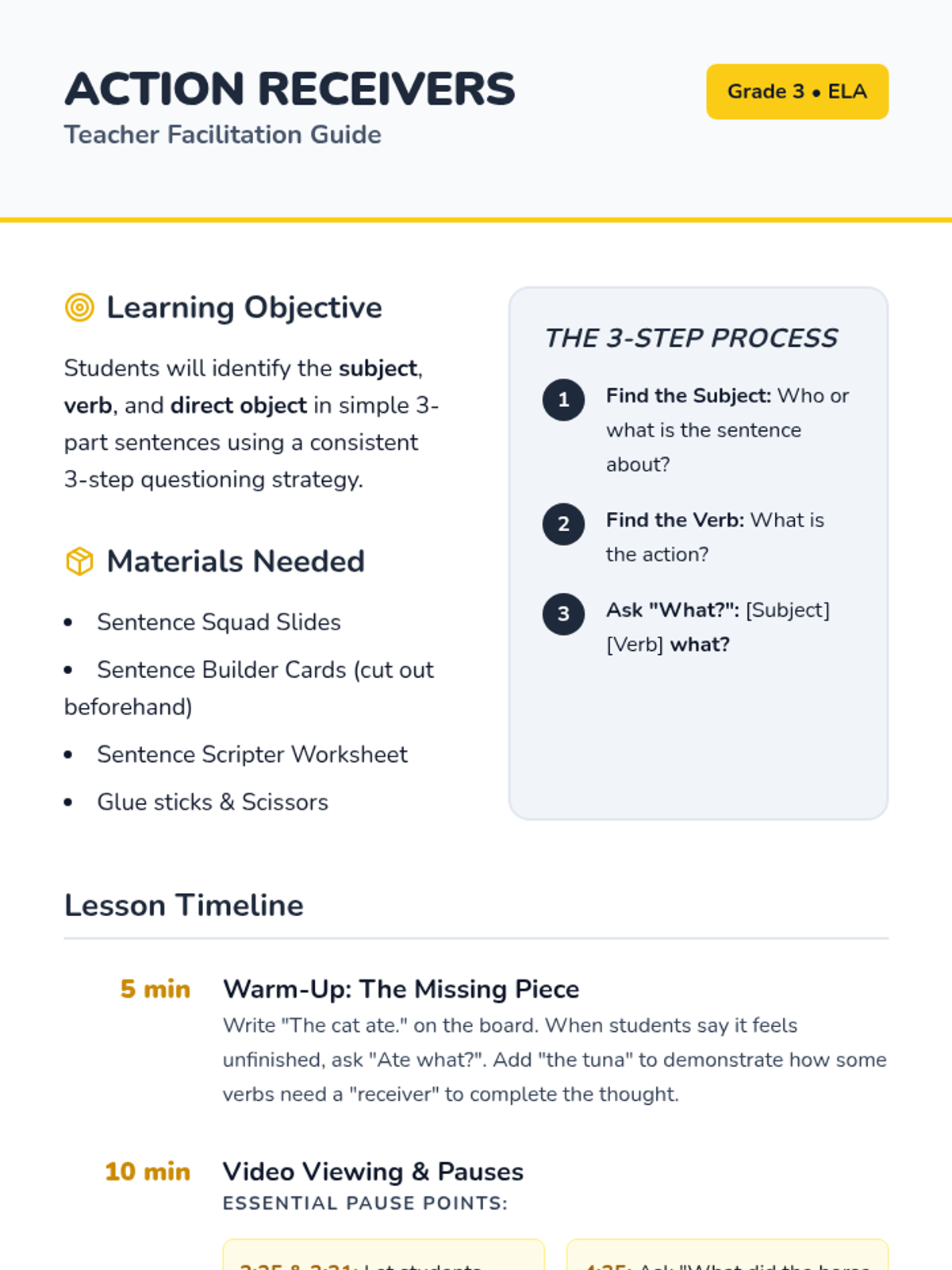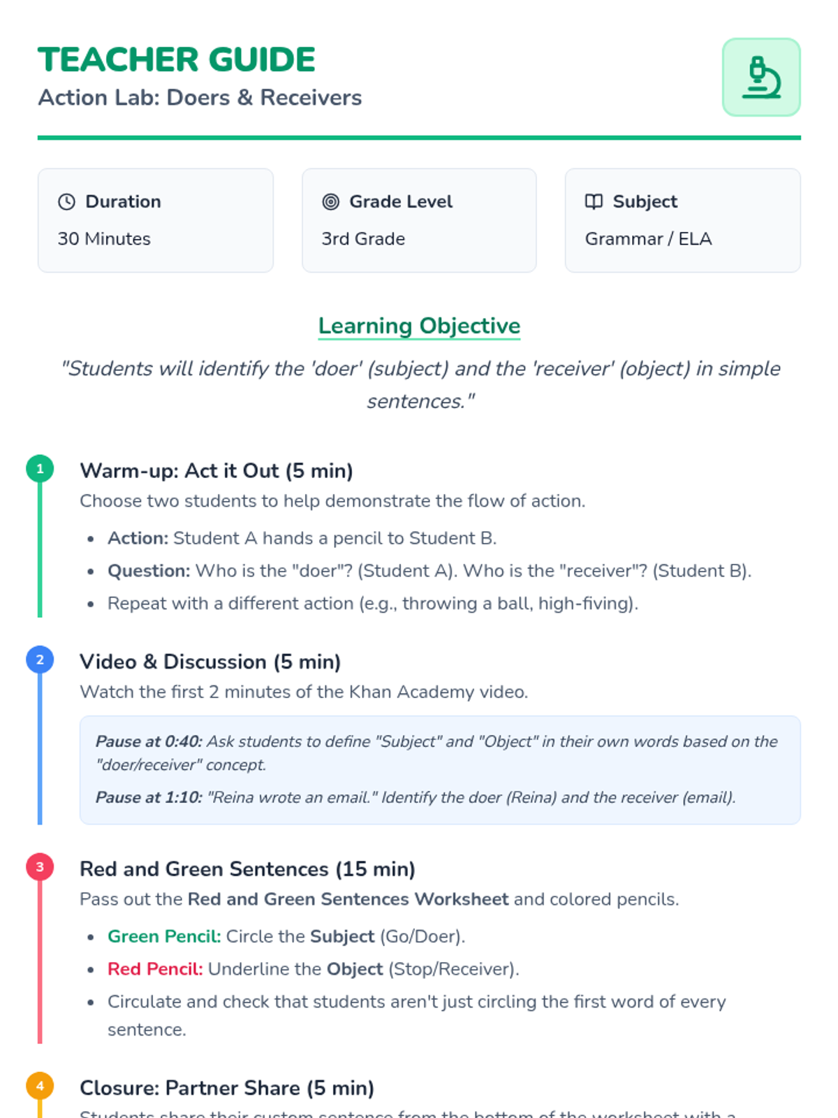 A 20-minute mini-lesson introducing students to the basic structure of a simple sentence, focusing on identifying the subject (who or what) and the predicate (what is happening).