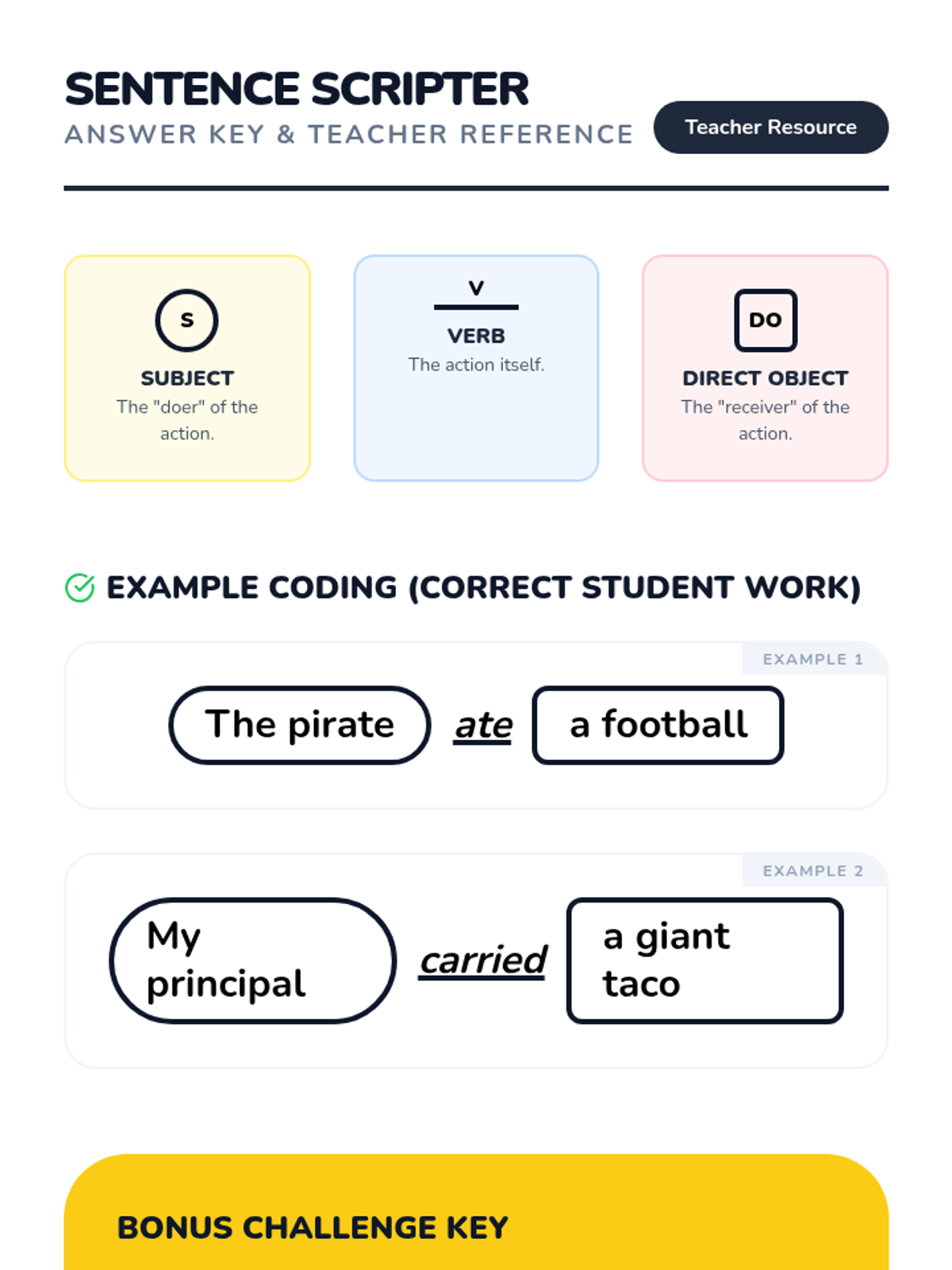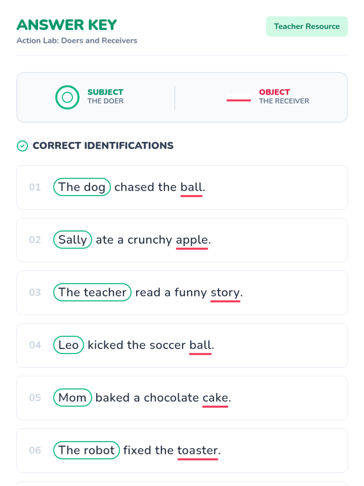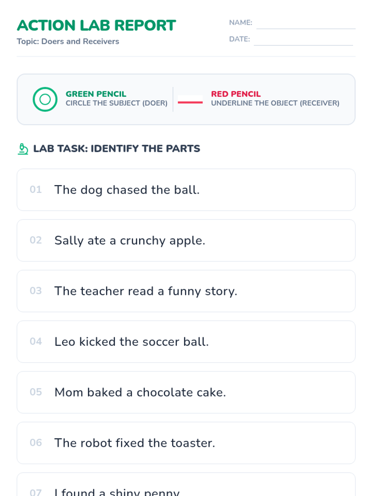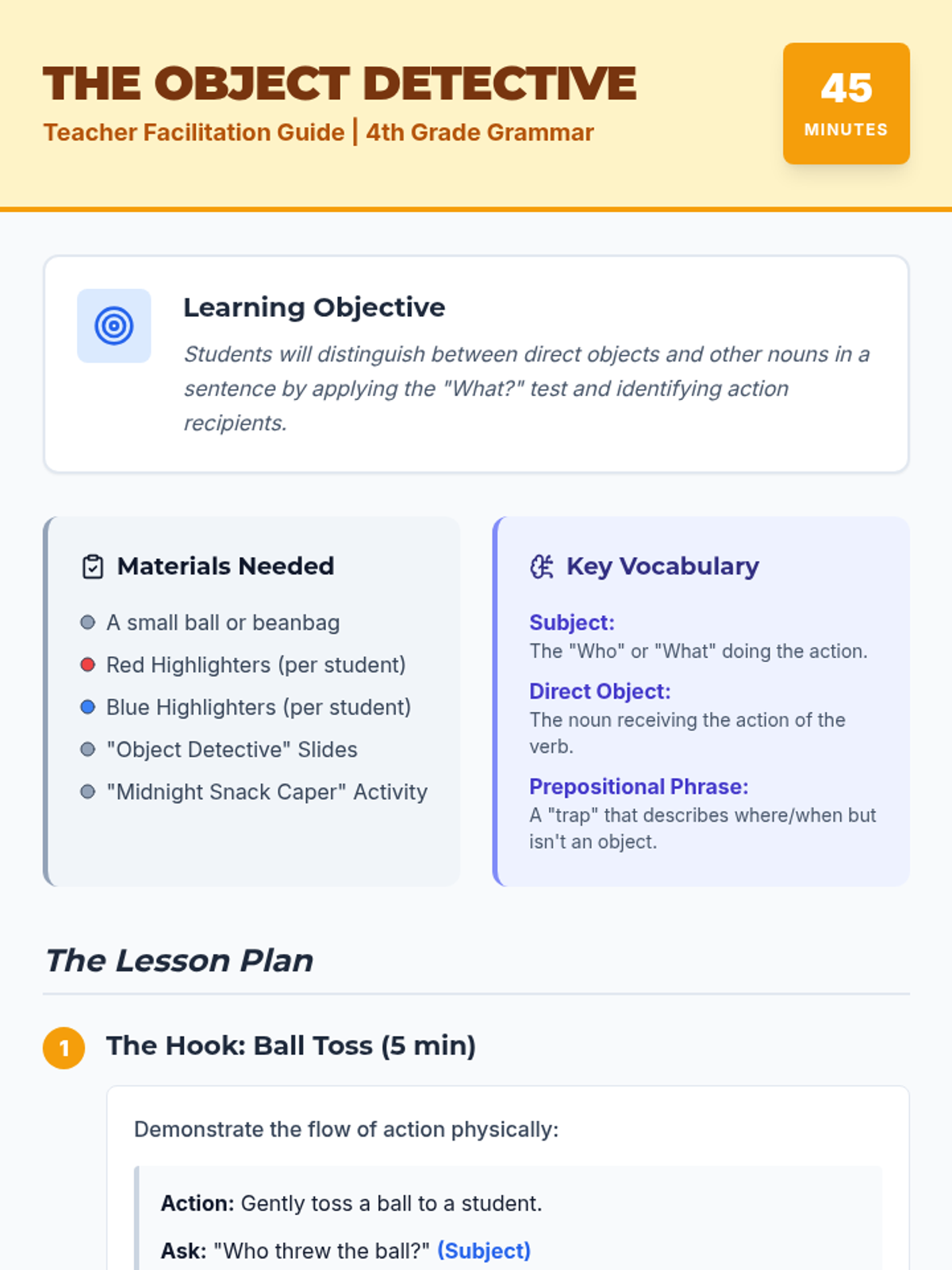 A 20-minute mini-lesson introducing students to the basic structure of a simple sentence, focusing on identifying the subject (who or what) and the predicate (what is happening).