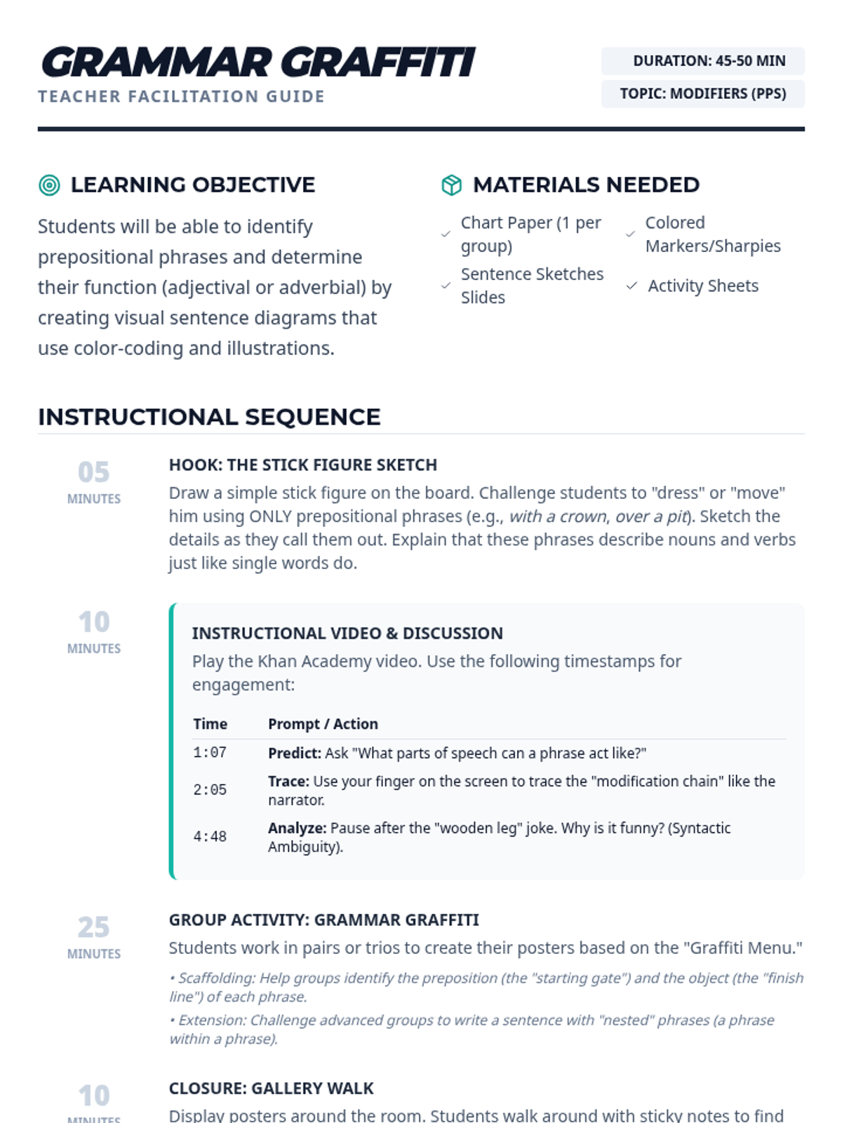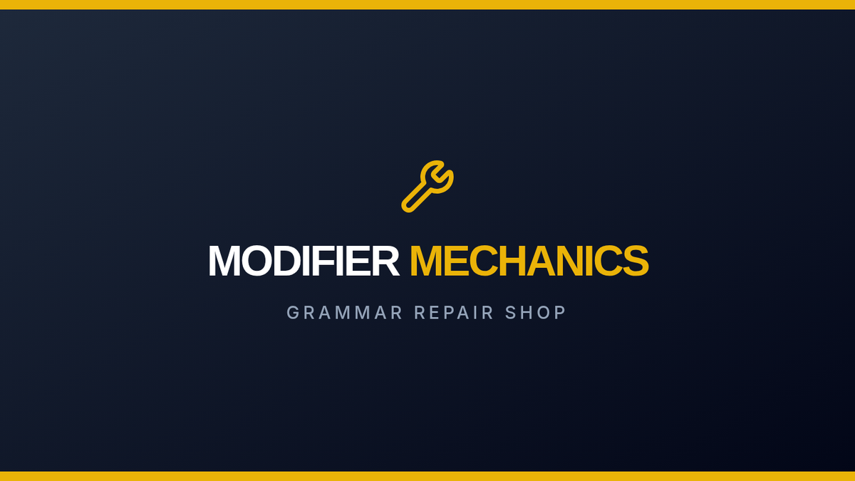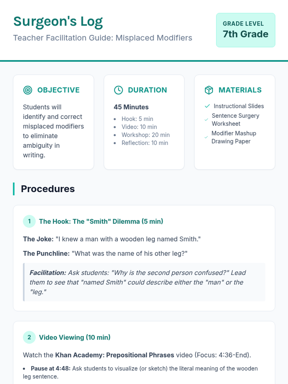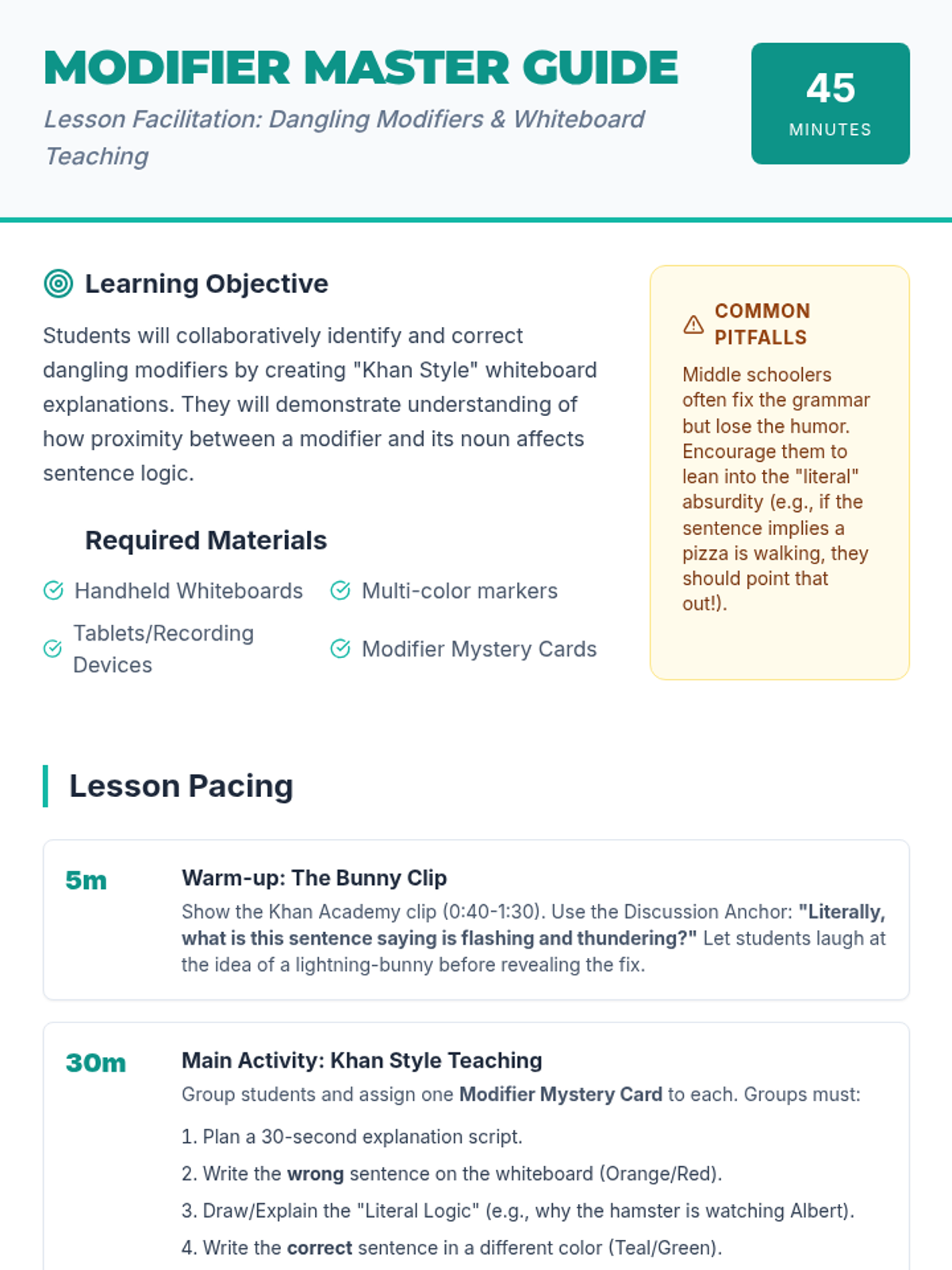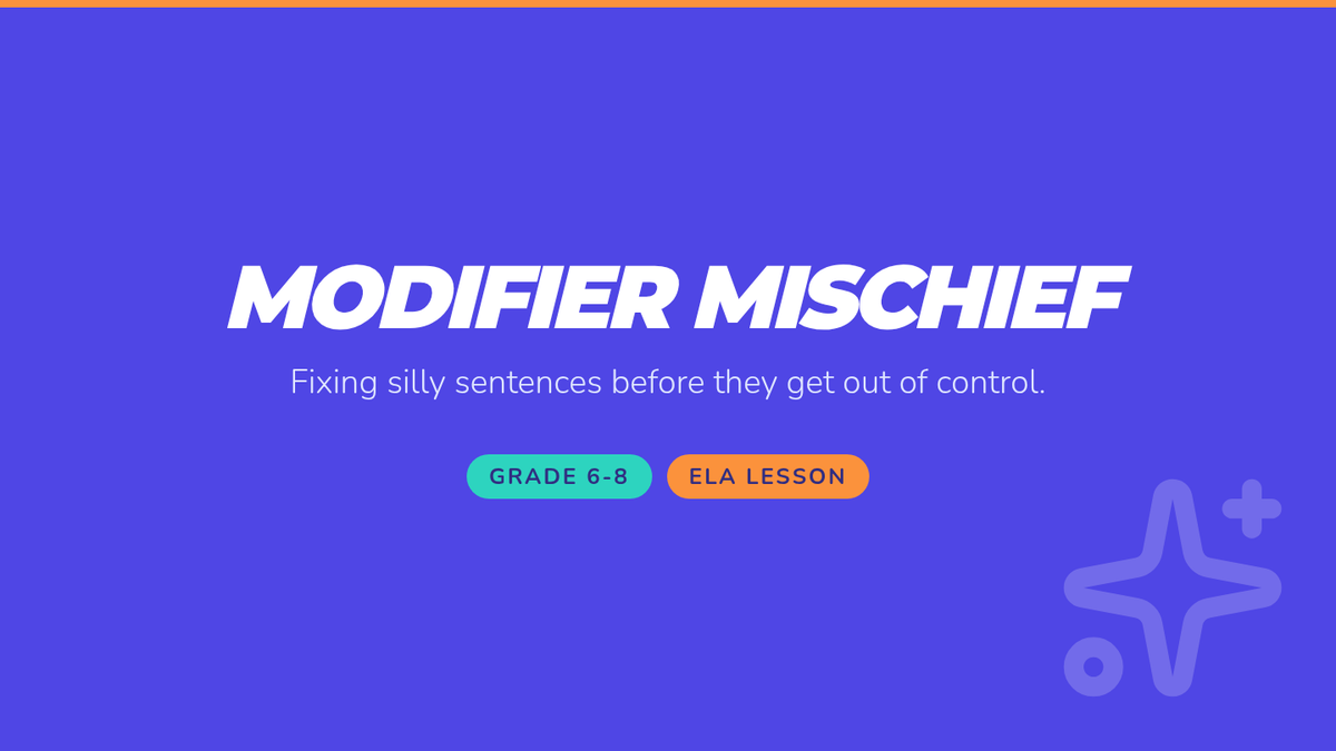 A high-energy grammar lesson where students identify and fix dangling and misplaced modifiers through a video-based discussion and a "Modifier Match-Up" card game. Students learn to ensure modifiers are placed next to the nouns they actually describe to avoid "silly" sentence meanings.