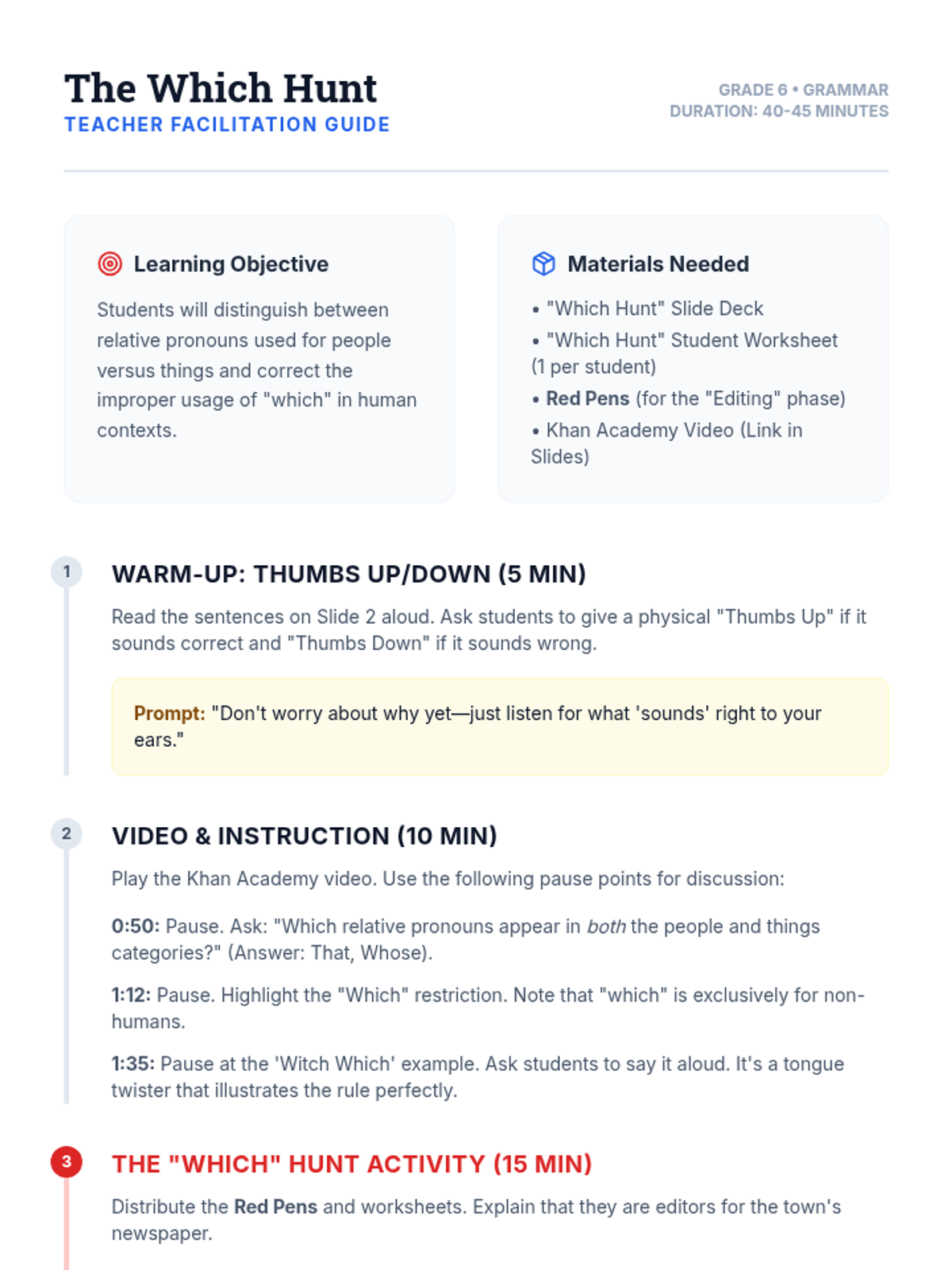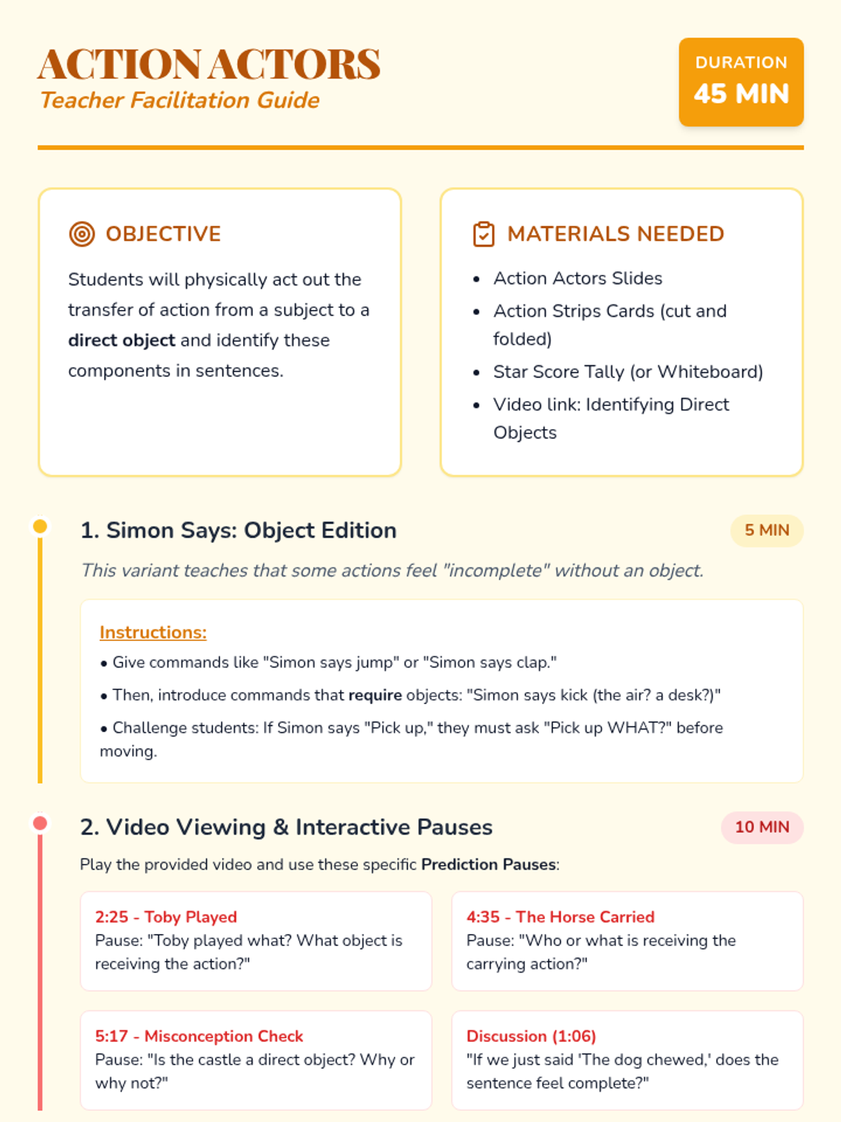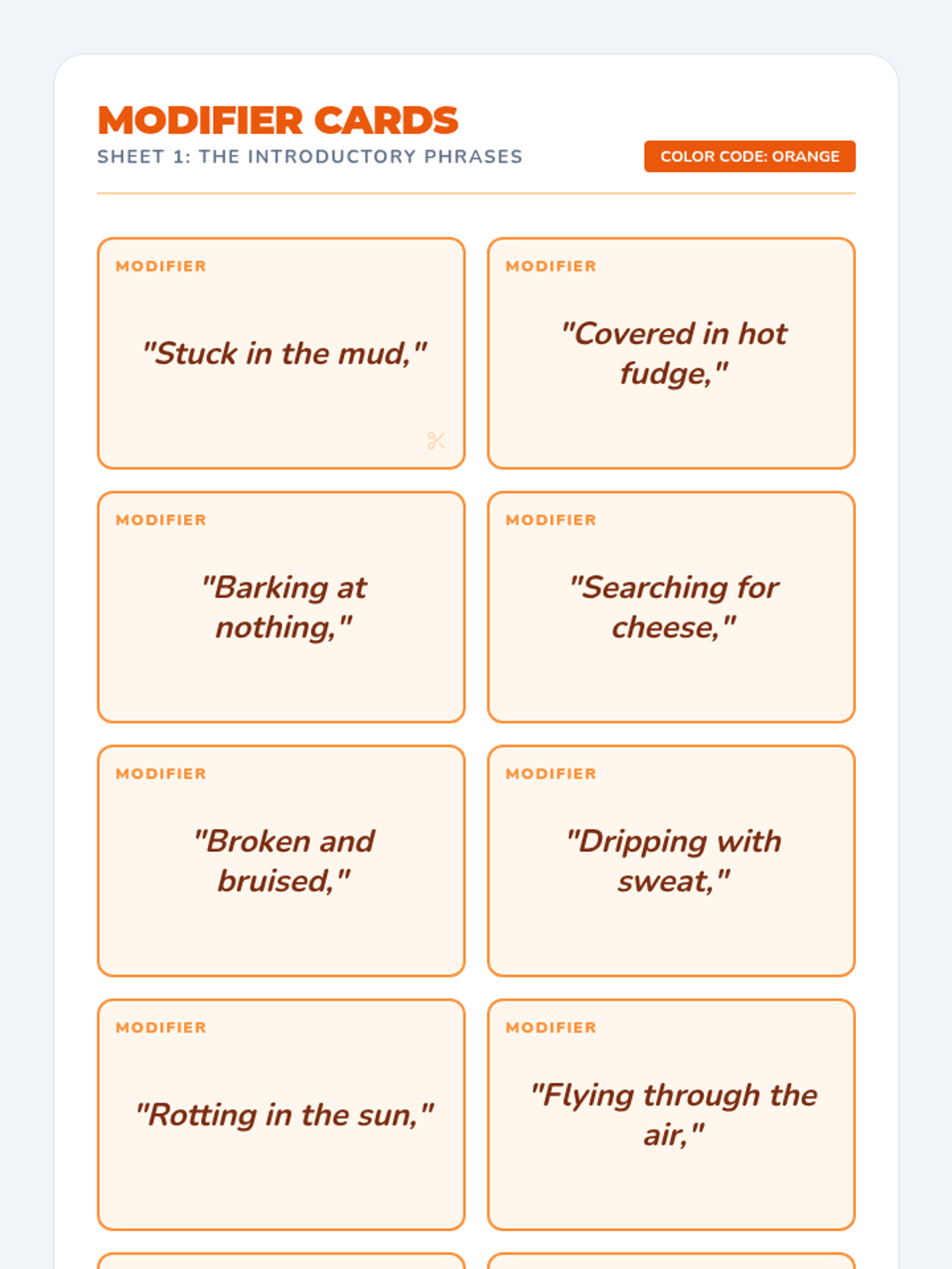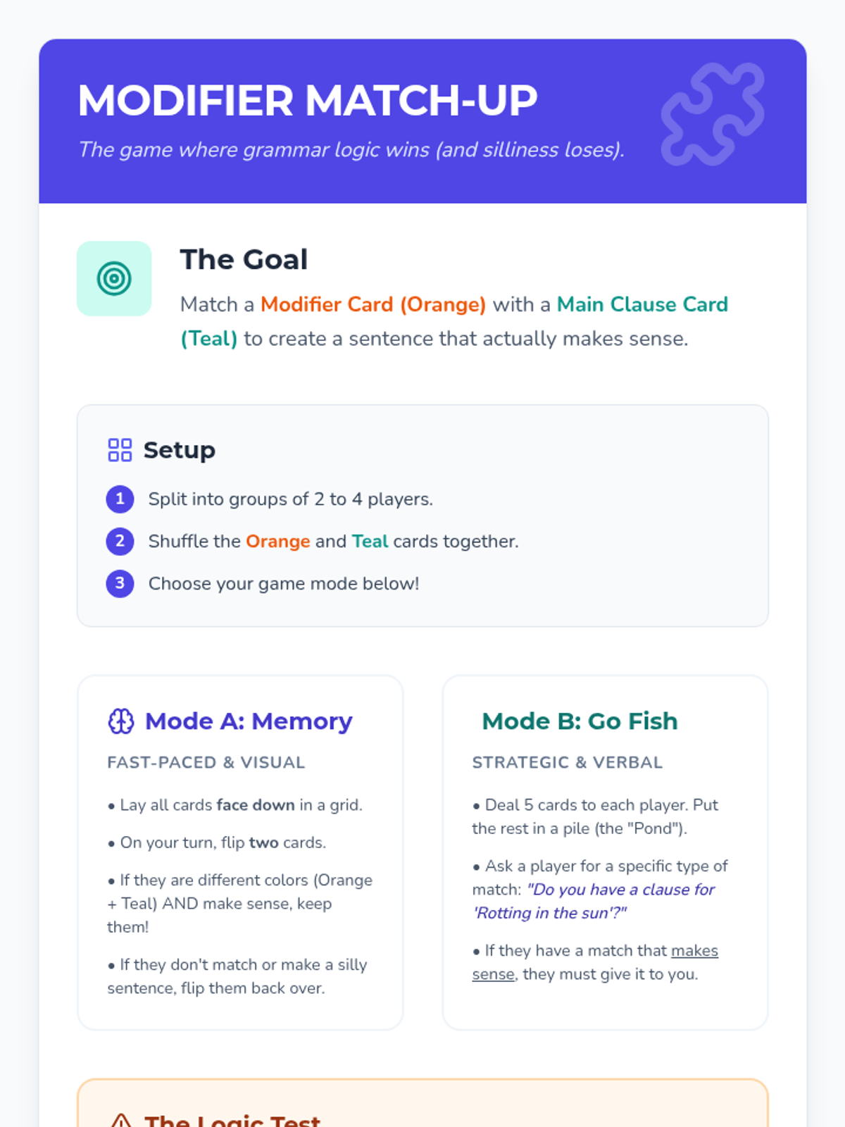 A high-energy grammar lesson where students identify and fix dangling and misplaced modifiers through a video-based discussion and a "Modifier Match-Up" card game. Students learn to ensure modifiers are placed next to the nouns they actually describe to avoid "silly" sentence meanings.