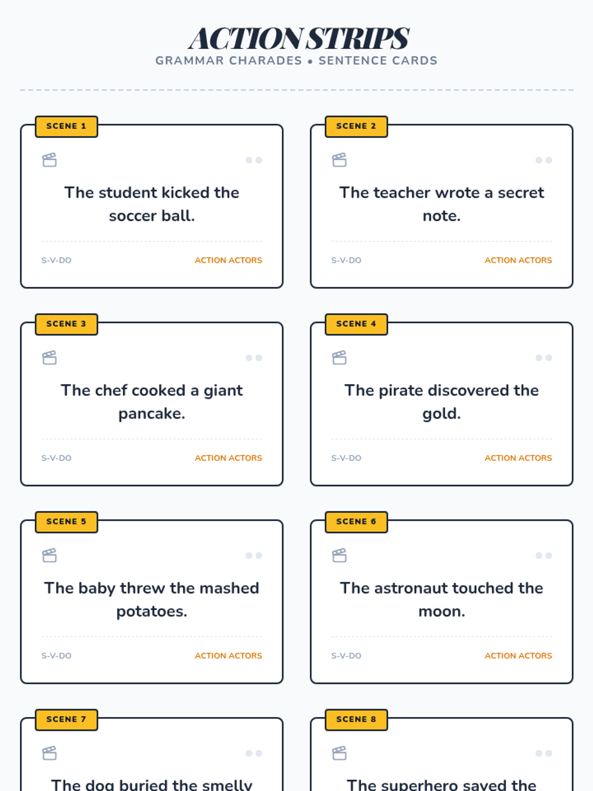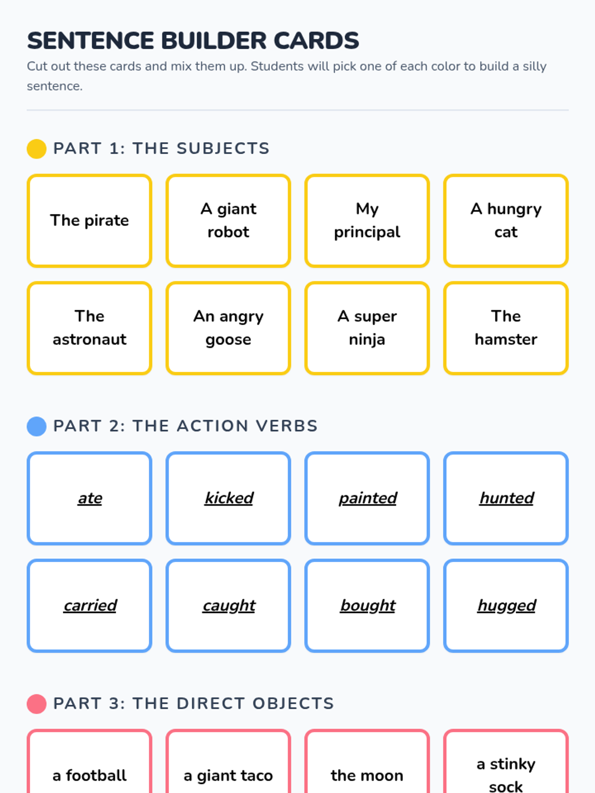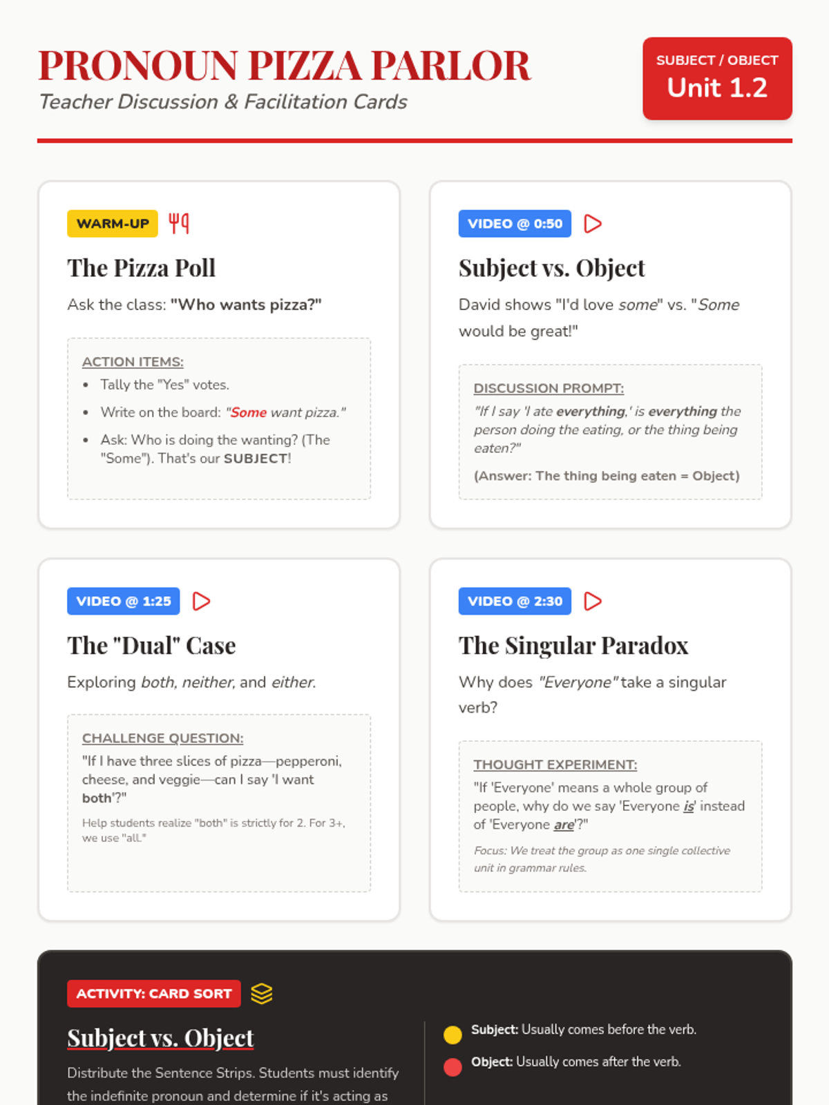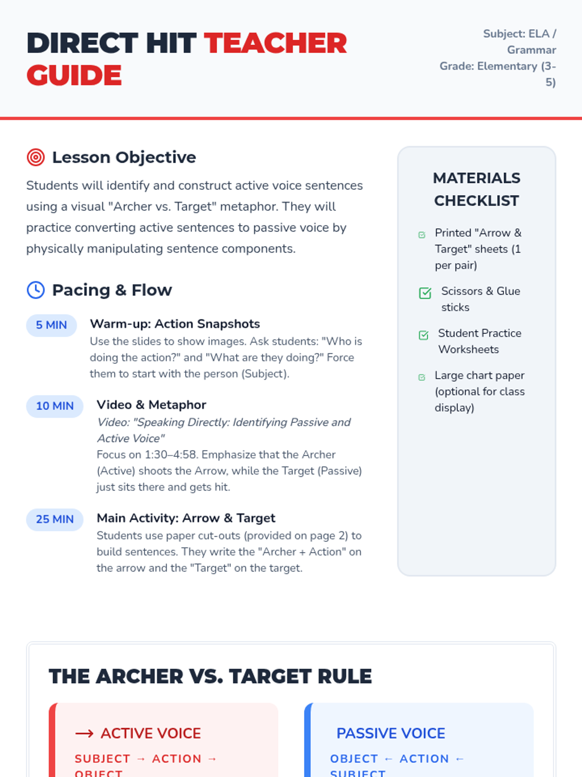 A high-energy grammar lesson where students identify and fix dangling and misplaced modifiers through a video-based discussion and a "Modifier Match-Up" card game. Students learn to ensure modifiers are placed next to the nouns they actually describe to avoid "silly" sentence meanings.