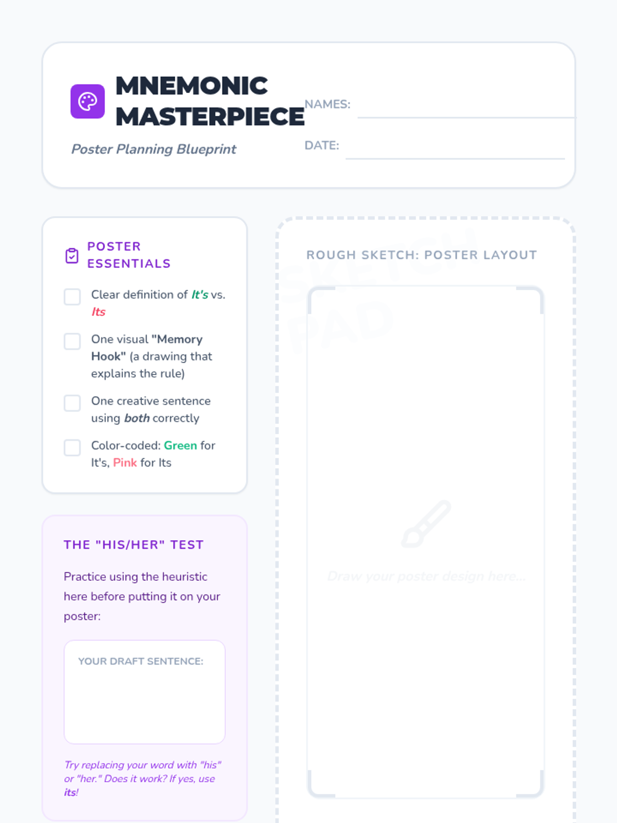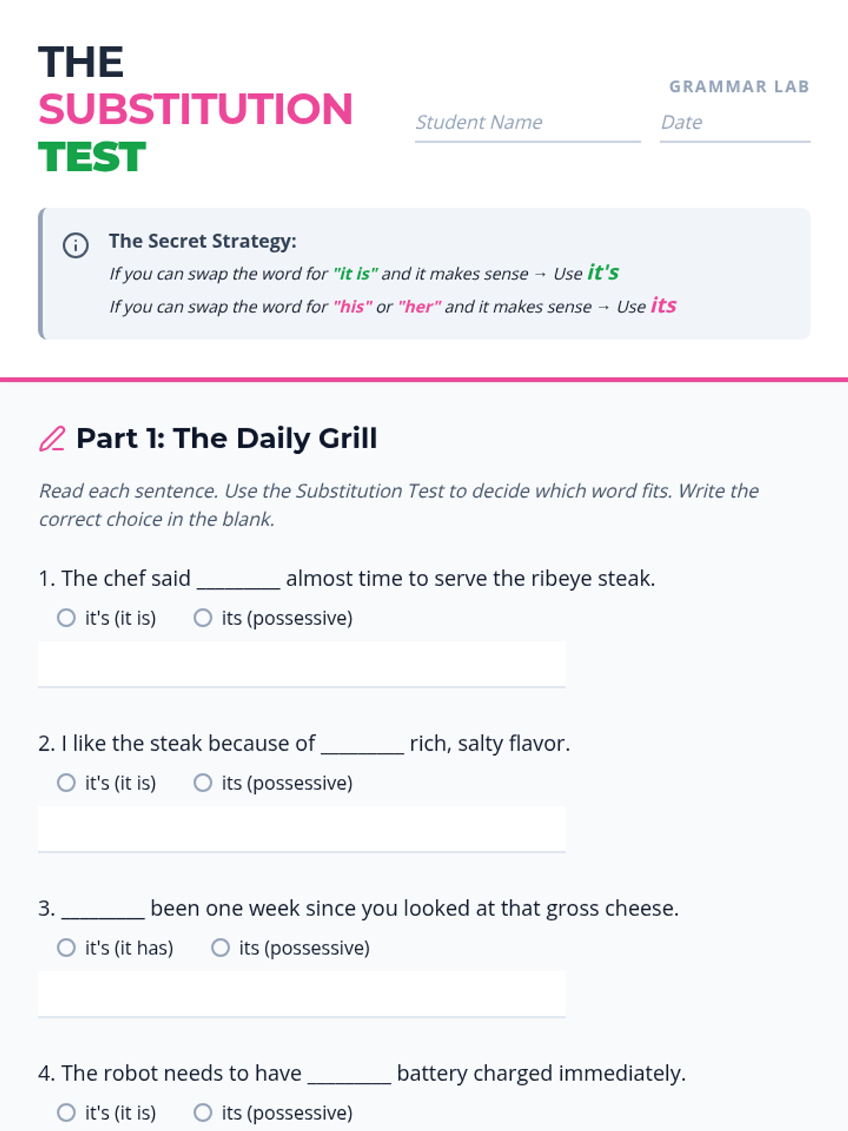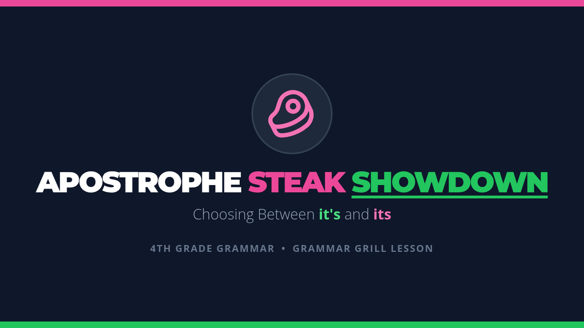 A 6th-grade grammar lesson focusing on the 'his/her' substitution heuristic to master the difference between 'its' and 'it's' through visual mnemonics and active challenges.