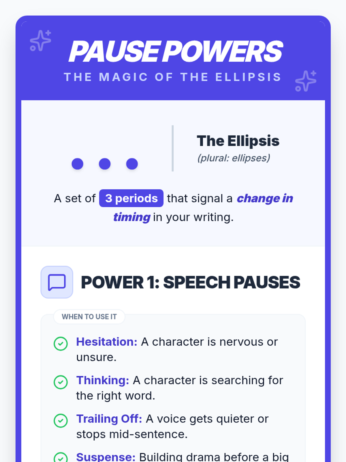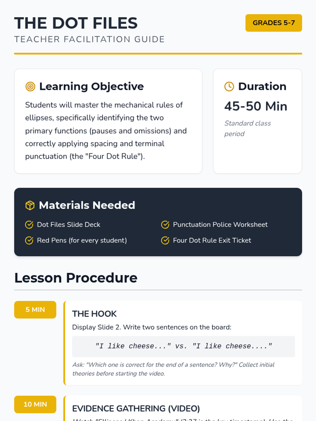 A comprehensive lesson for Grade 5-7 students to master the use of ellipses in pauses and omissions, with a specific focus on the 'Four Dot Rule' for terminal punctuation.
