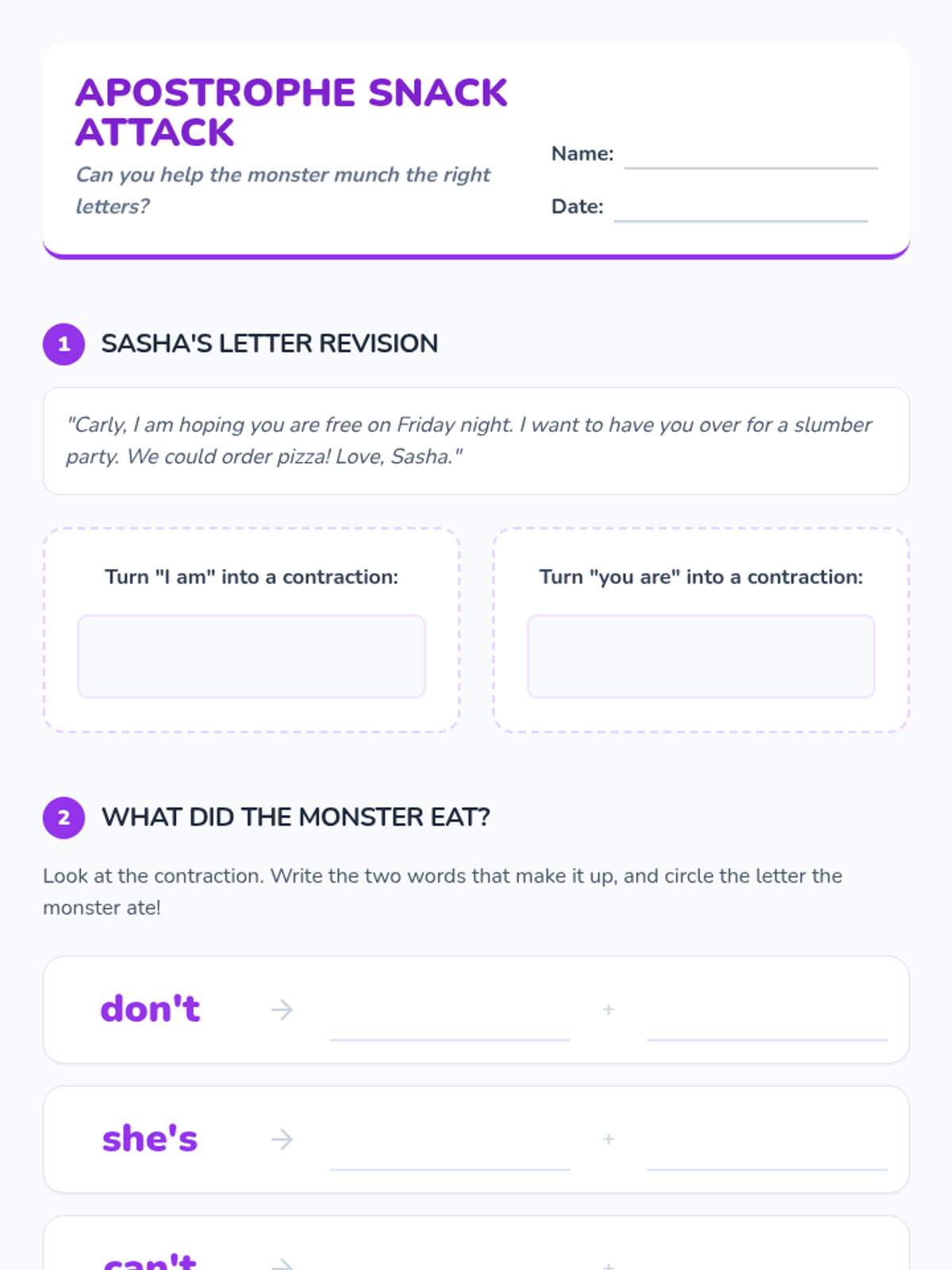 A whimsical 2nd-grade lesson where students learn about contractions by creating their own 'Apostrophe Monsters' that eat letters to make new words. Includes a video-guided discussion and a creative art activity.