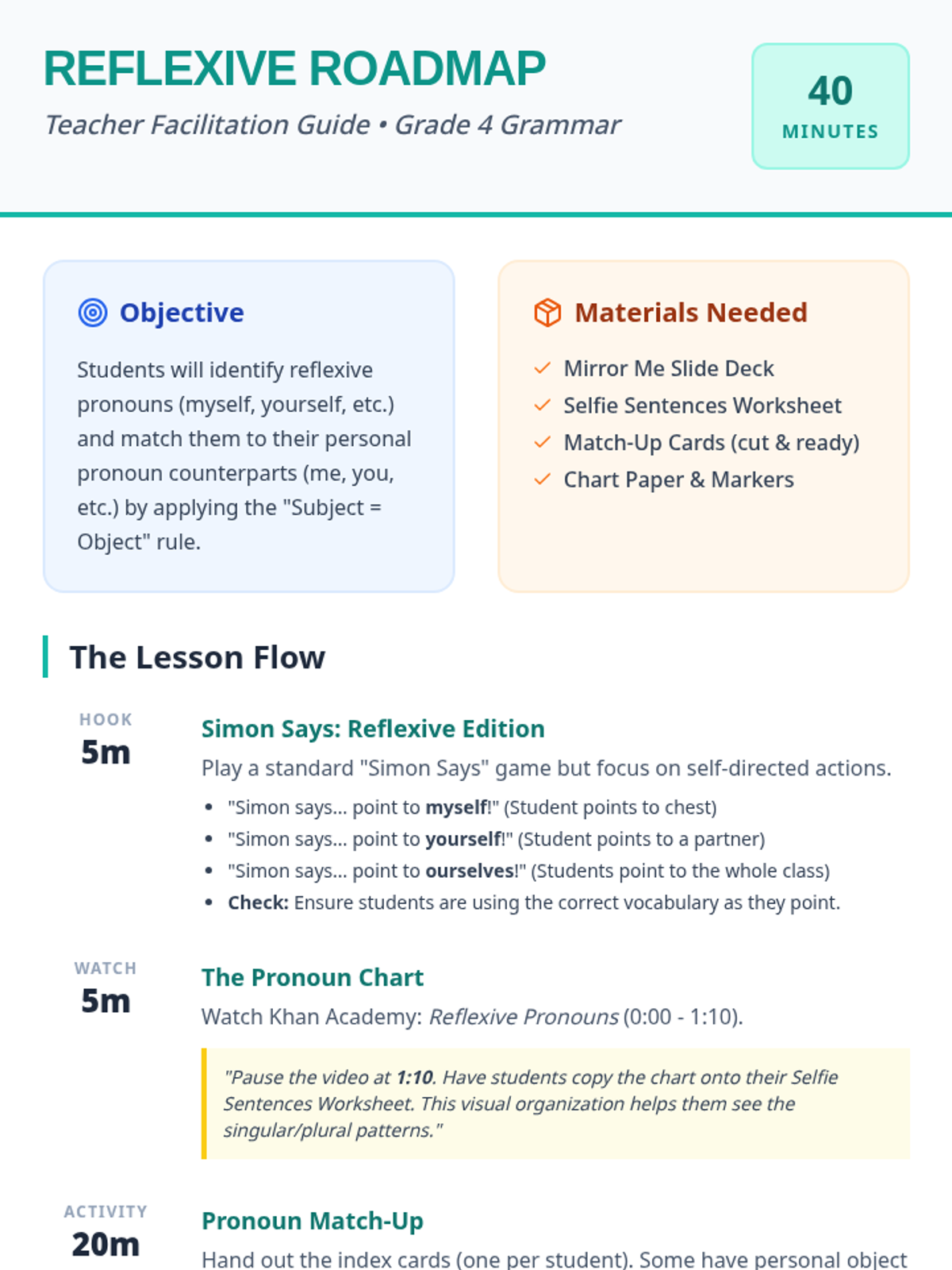 A 4th-grade grammar lesson focusing on identifying and using reflexive pronouns through a 'mirror' analogy, featuring a Khan Academy video and an interactive movement-based matching activity.