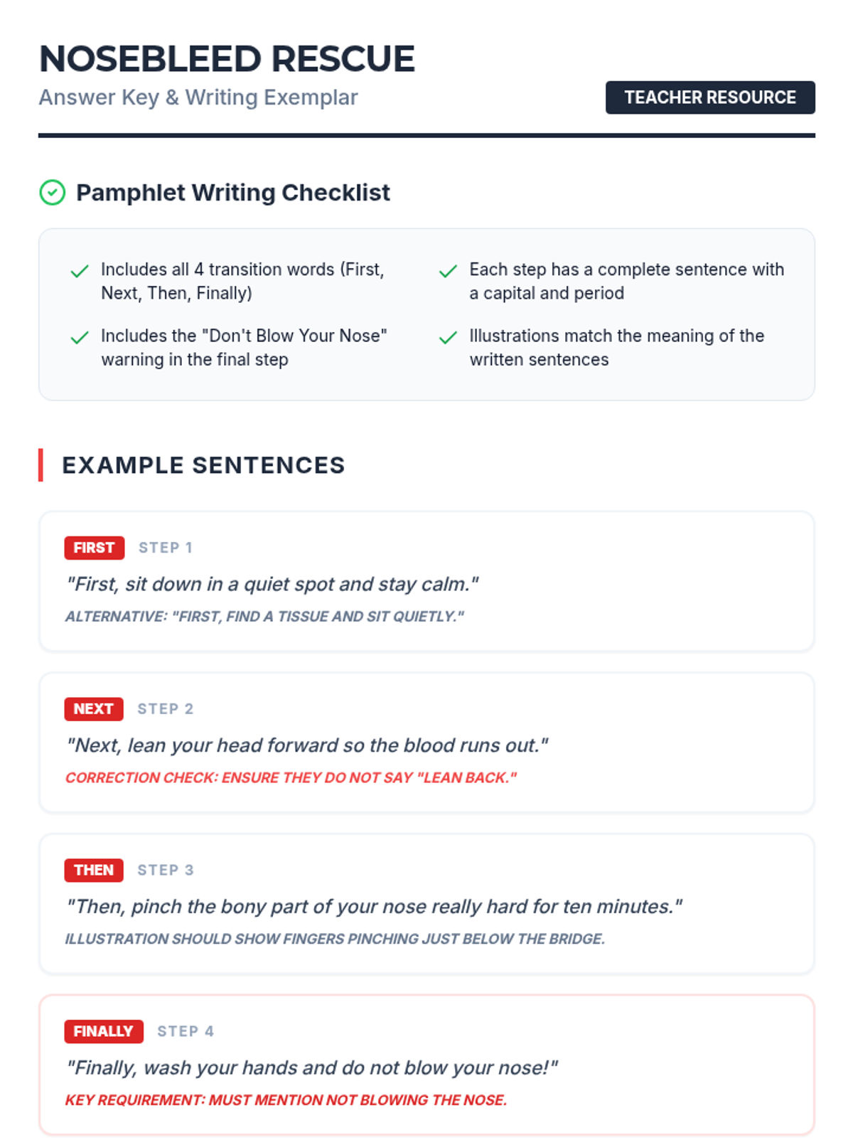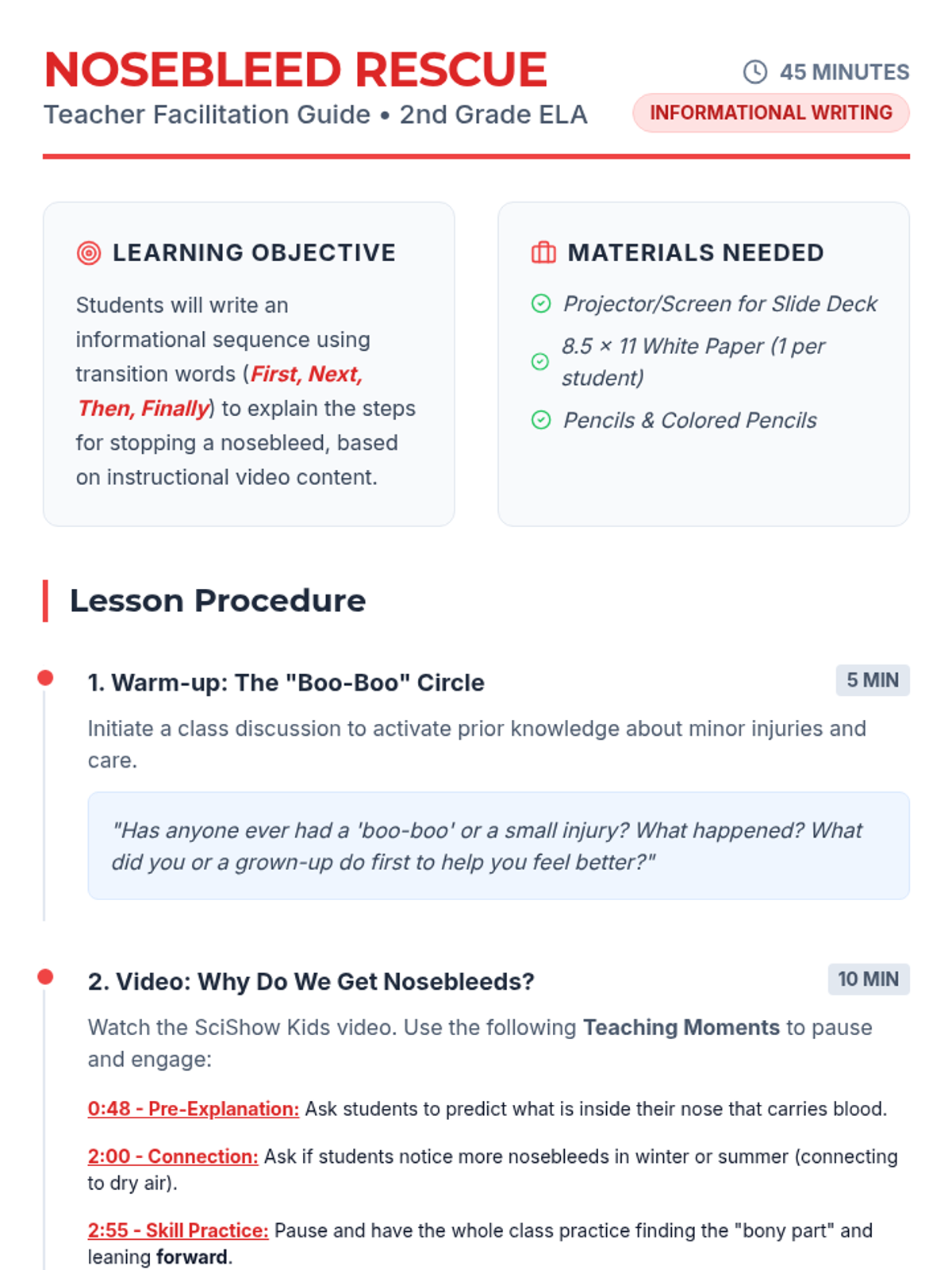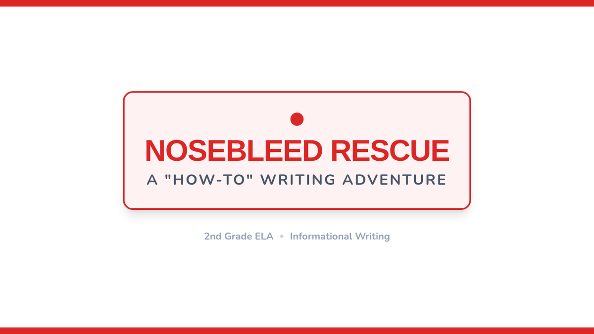 A 2nd-grade writing lesson focused on sequencing and informational writing. Students learn how to stop a nosebleed using first-aid steps from a SciShow Kids video and create a transition-word-filled instructional pamphlet.