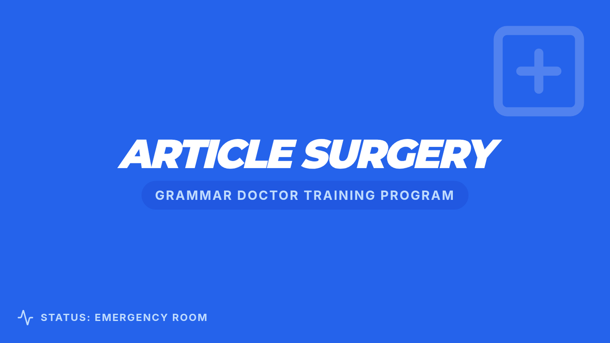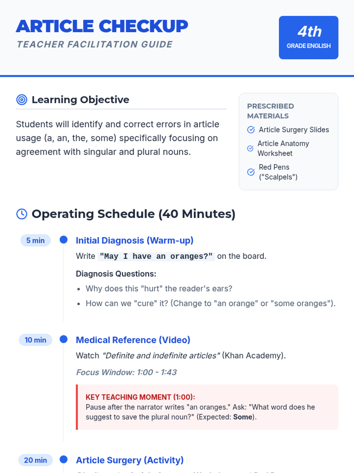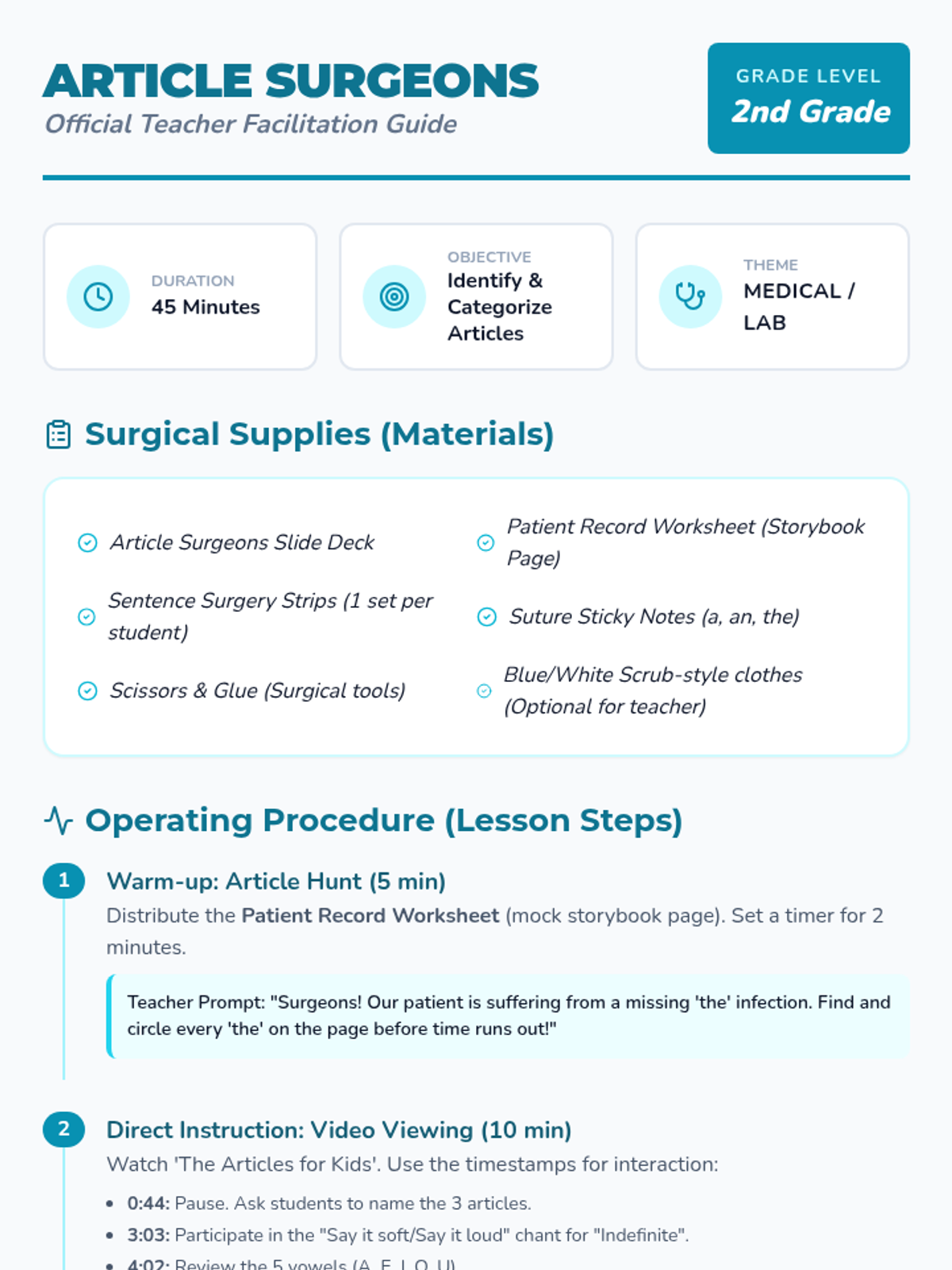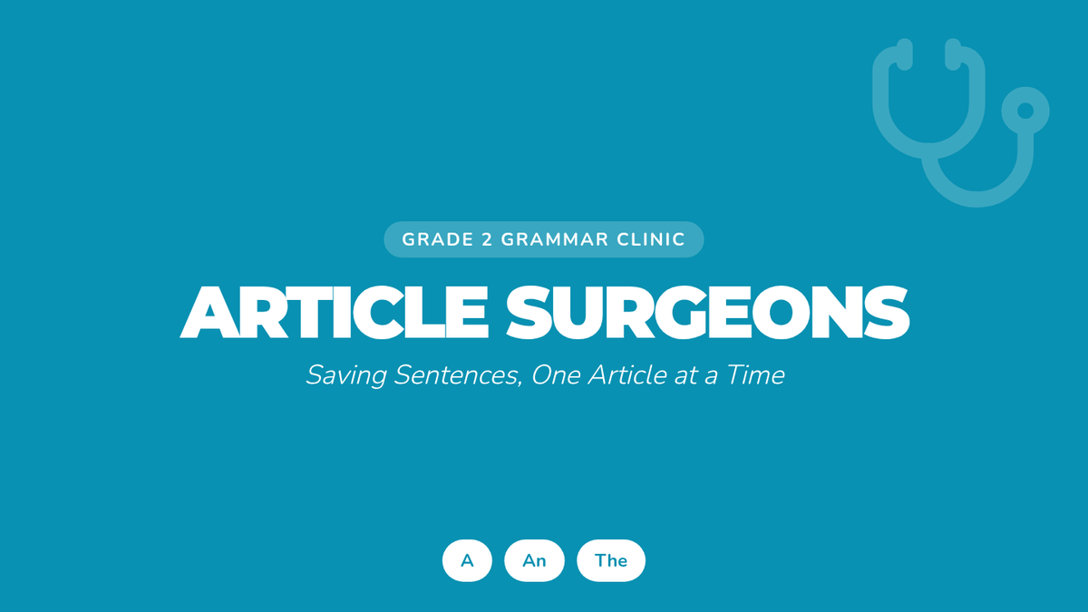 A medical-themed lesson where 2nd-grade 'surgeons' identify and apply grammatical articles (a, an, the) to save 'injured' sentences. Students explore definite and indefinite articles through a storybook hunt, a video analysis, and a hands-on sentence strip activity.