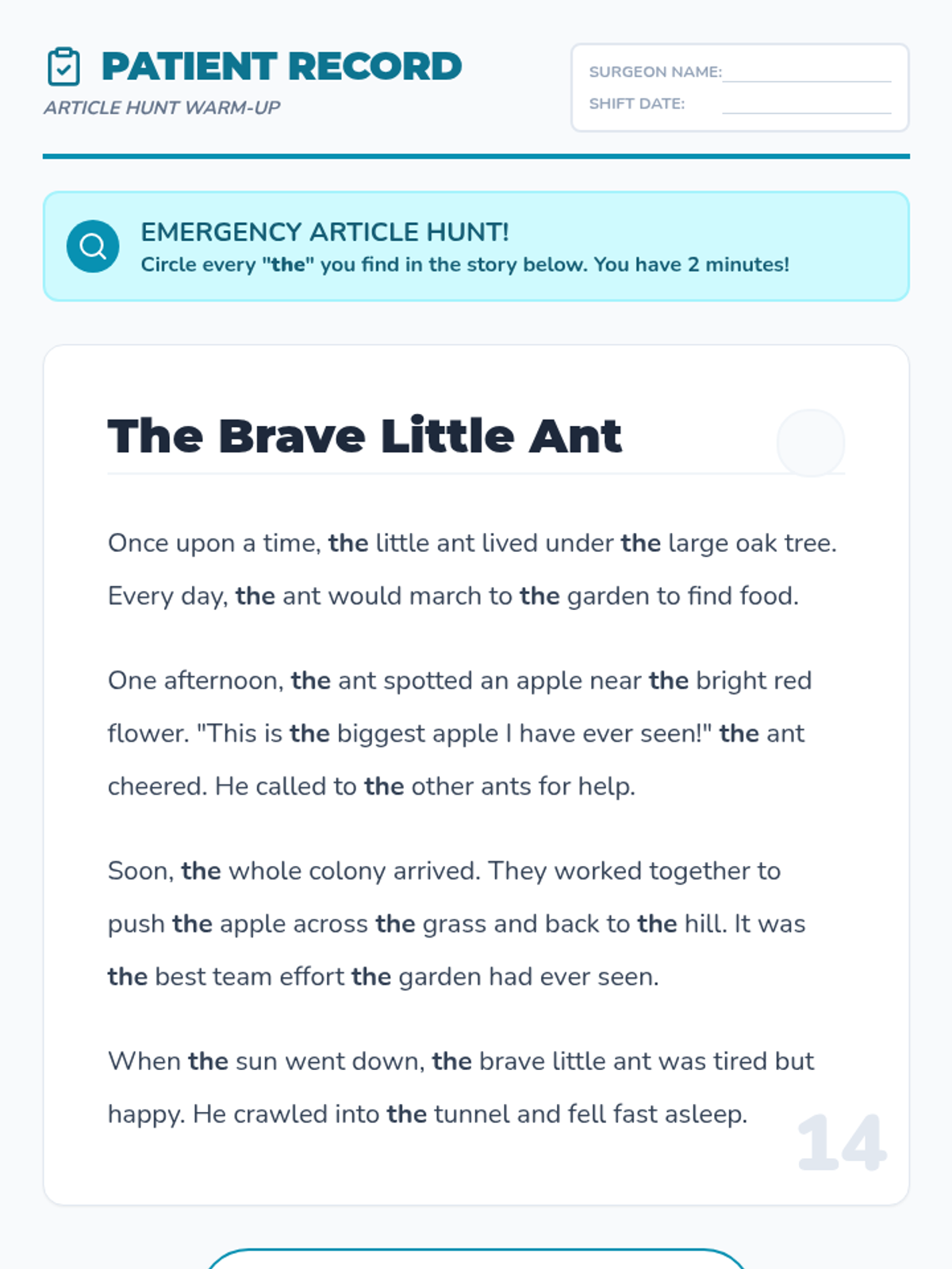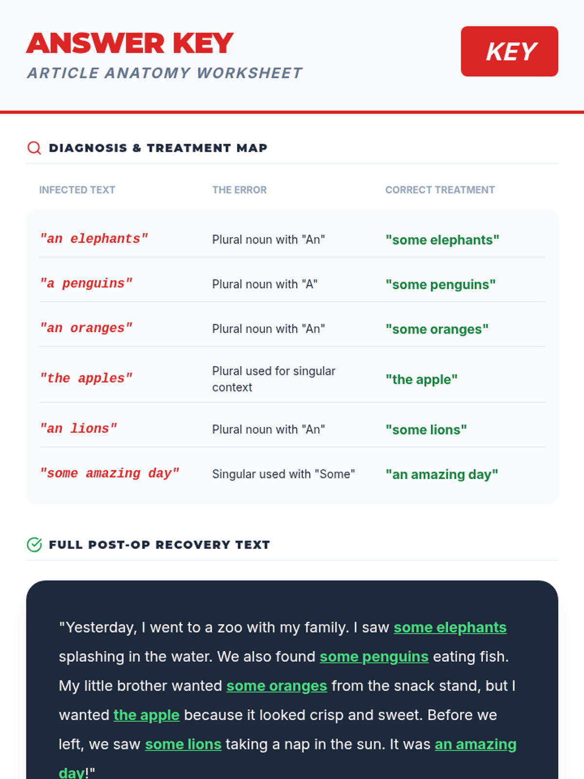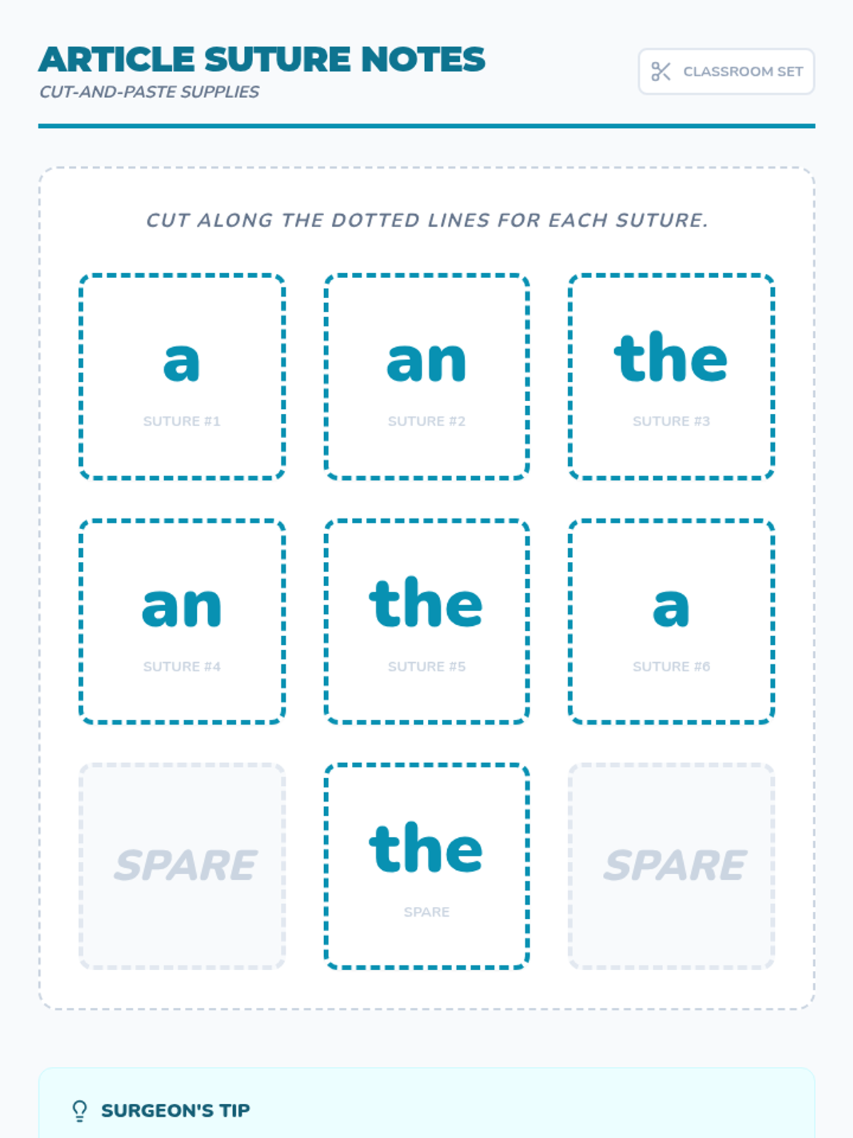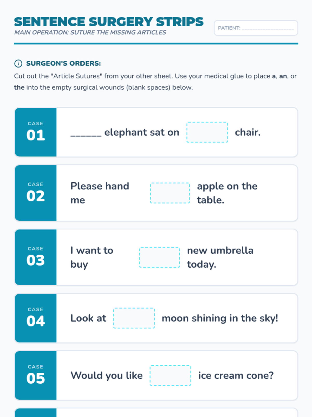A medical-themed lesson where 2nd-grade 'surgeons' identify and apply grammatical articles (a, an, the) to save 'injured' sentences. Students explore definite and indefinite articles through a storybook hunt, a video analysis, and a hands-on sentence strip activity.