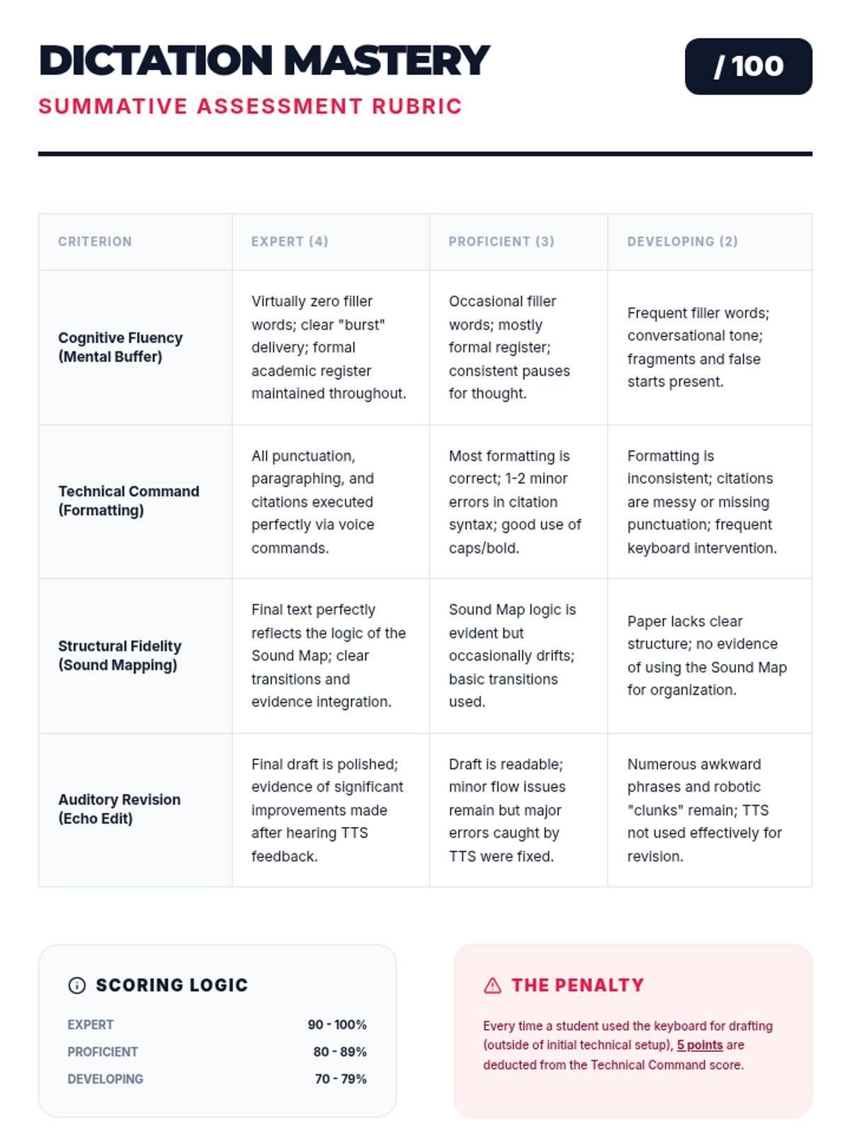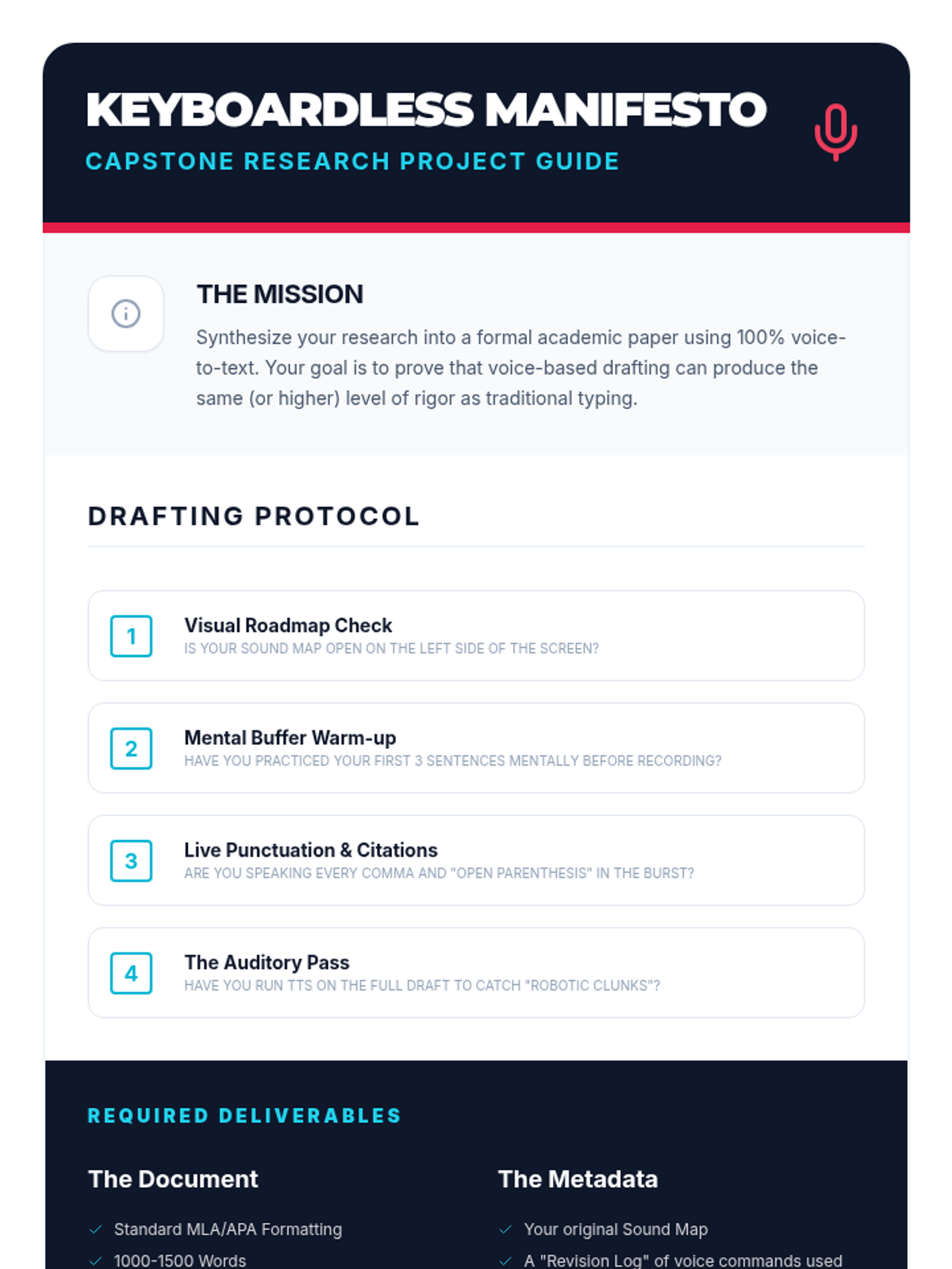 A capstone experience where students synthesize all skills to produce a final academic draft during a 'Keyboardless Hour,' demonstrating full independence from physical typing.