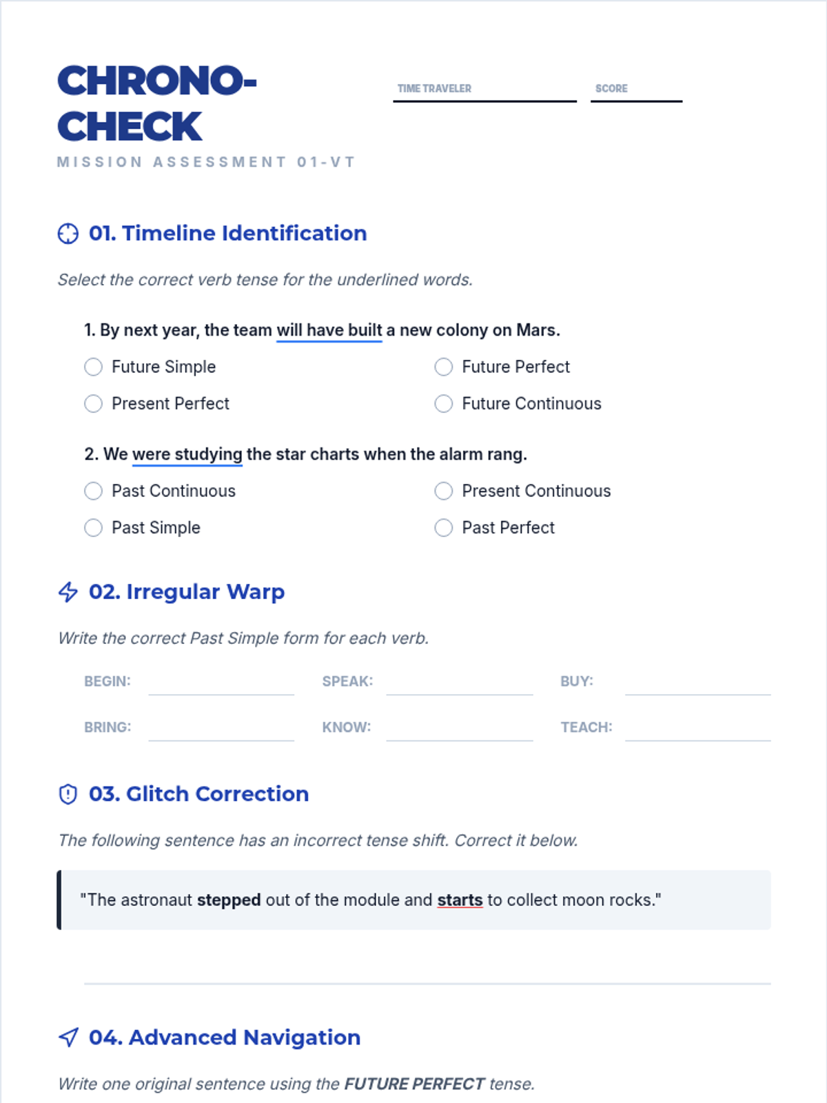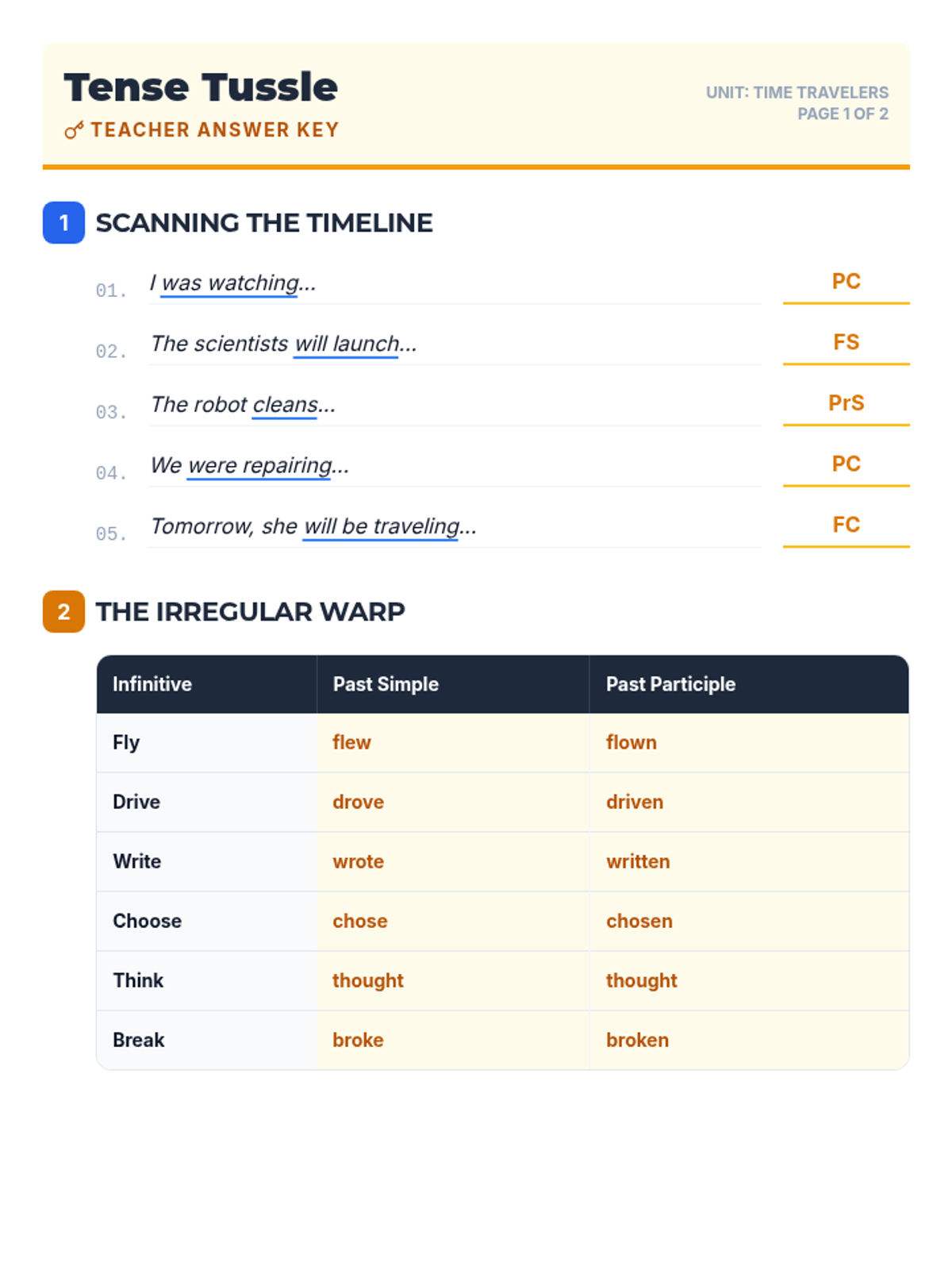 Covers the Simple Future and Future Continuous tenses. Students learn to predict and plan for actions that will happen later.