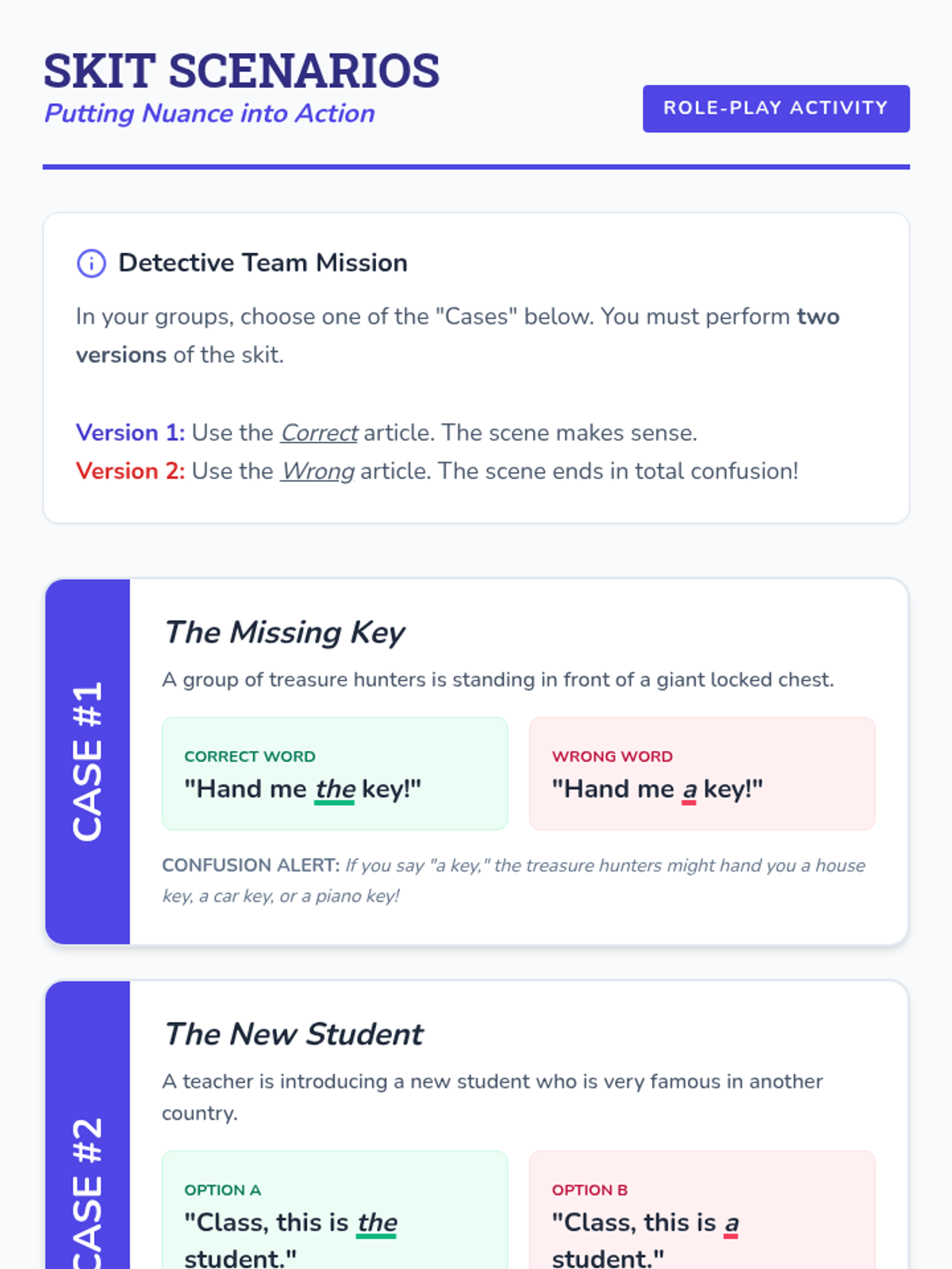 Students learn to distinguish between indefinite (a/an) and definite (the) articles through a hands-on detective activity and role-playing. The lesson uses a detective theme to help students hunt for specific vs. general nouns.