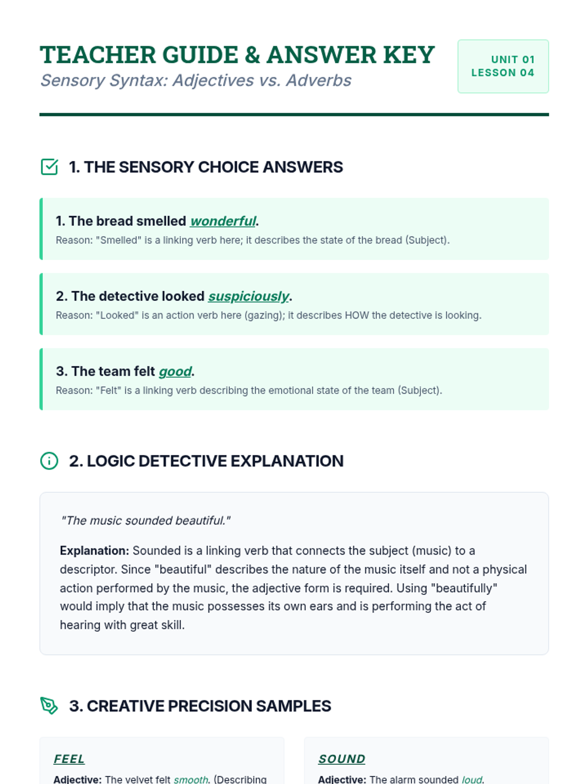 Differentiate between predicate adjectives and adverbs when used with linking and sense verbs to ensure precise description.
