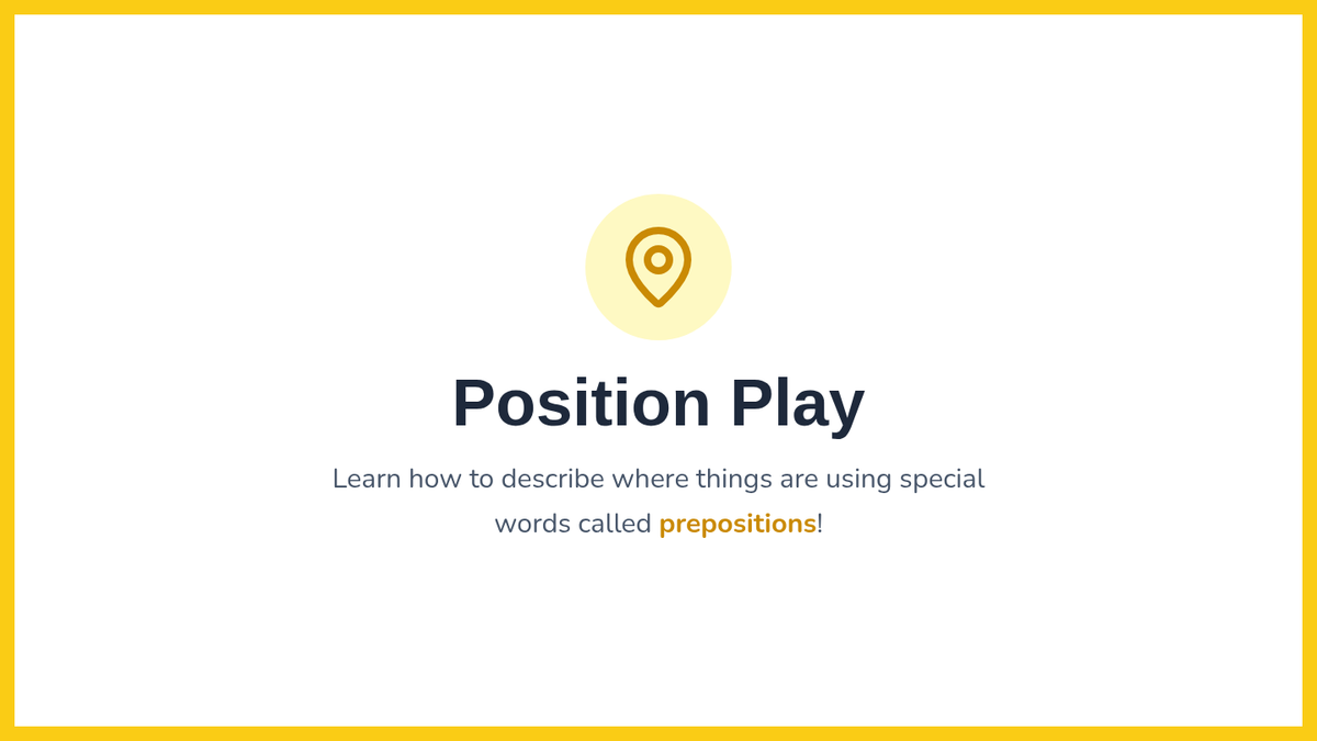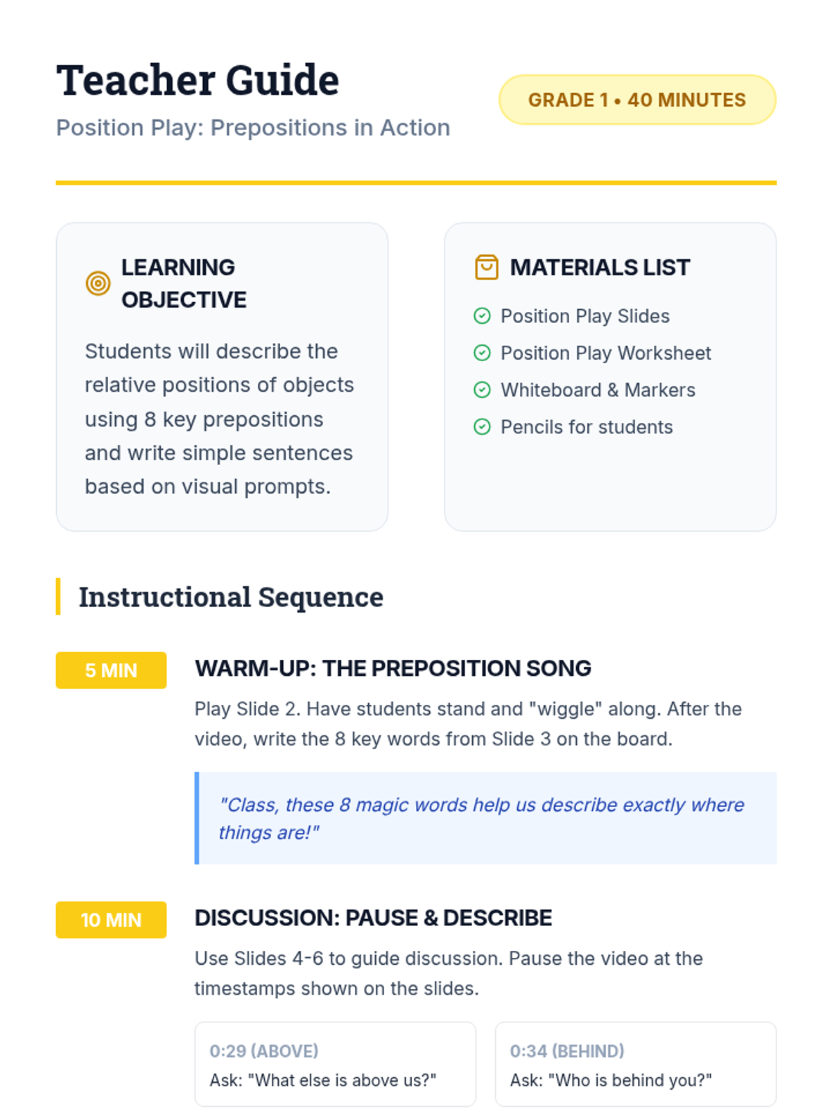 A 1st Grade lesson focused on using prepositional vocabulary to describe relative positions through song, discussion, and sentence building.