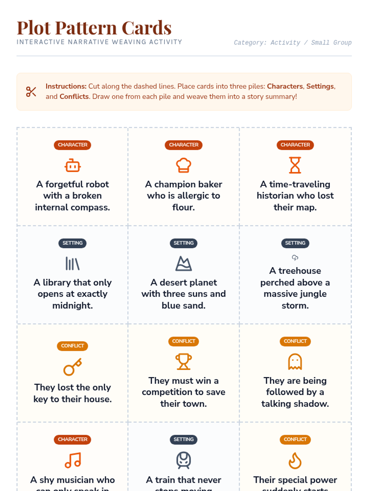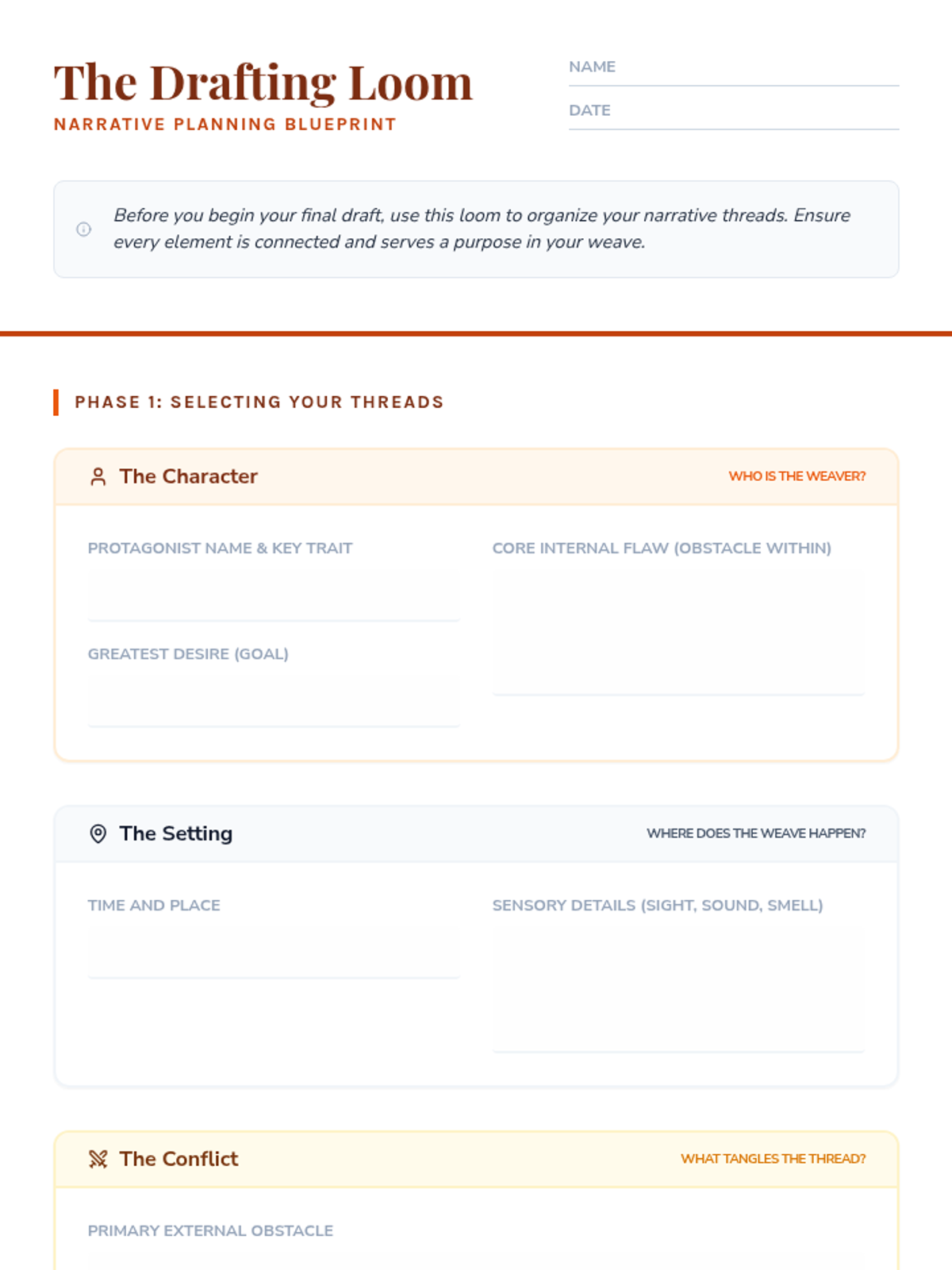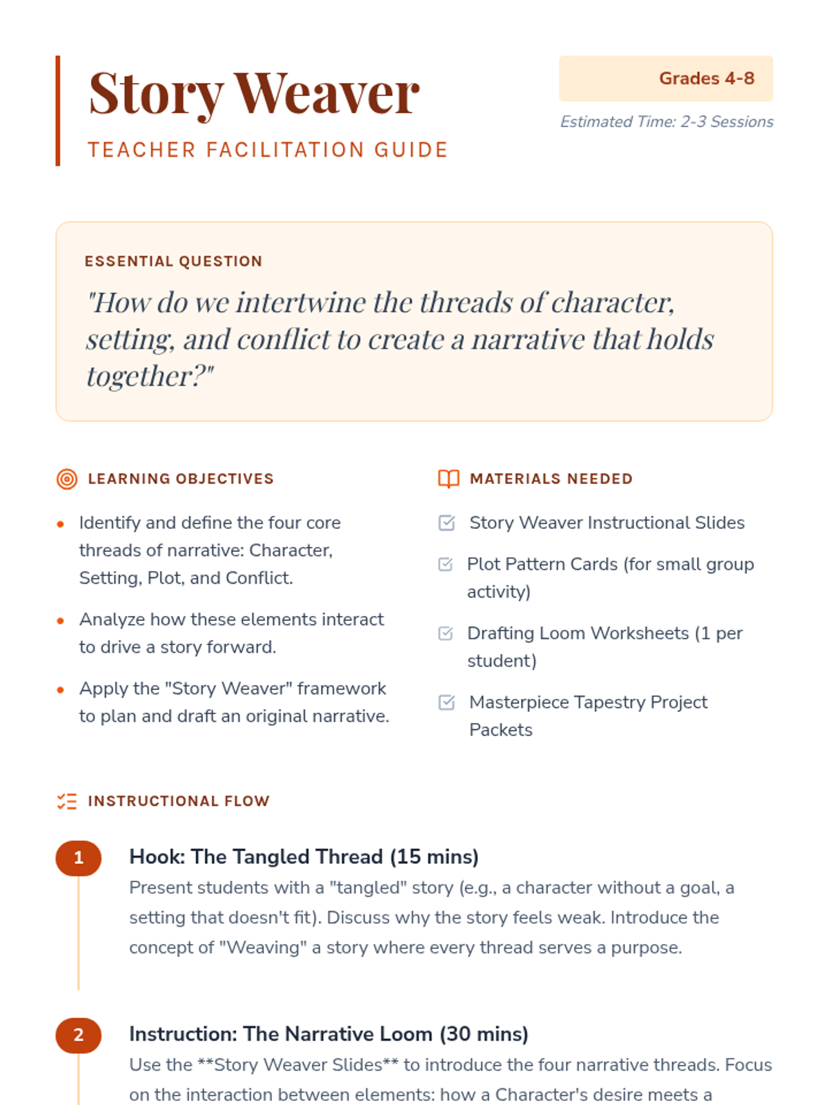 A comprehensive creative writing lesson where students learn to weave character, setting, and plot into compelling narratives through a textile-inspired workshop approach.