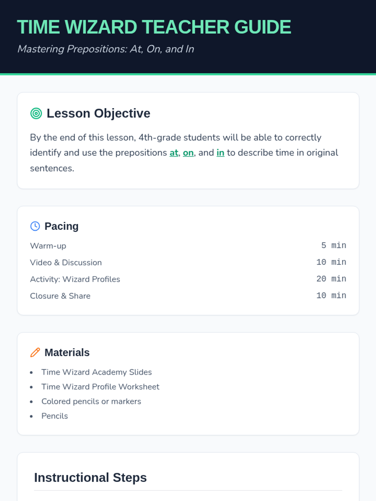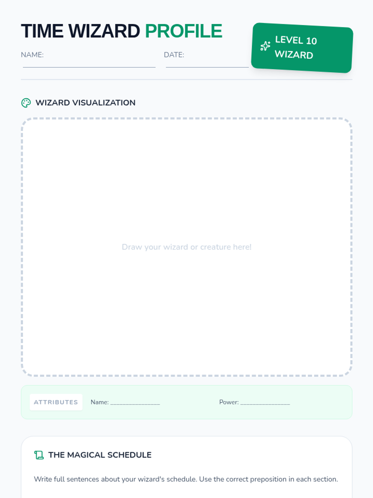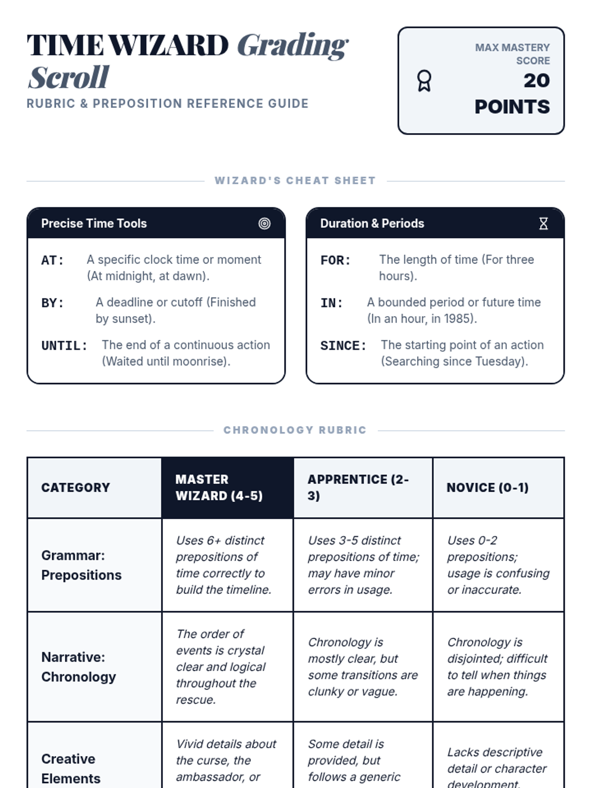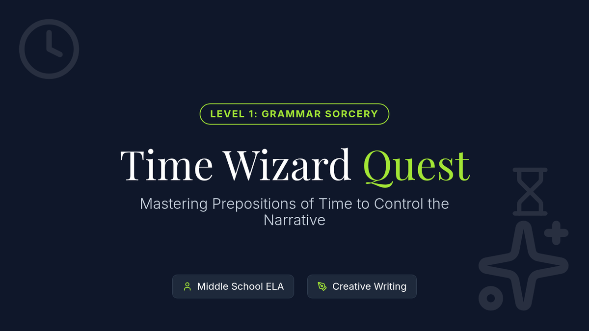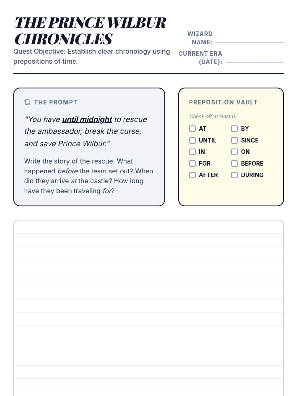 Students will learn to use prepositions of time (at, by, until, for, etc.) to create clear chronology in a creative narrative about rescuing Prince Wilbur from a magical curse. The lesson includes a presentation, a creative writing activity, and an assessment rubric themed around becoming a 'Time Wizard'.