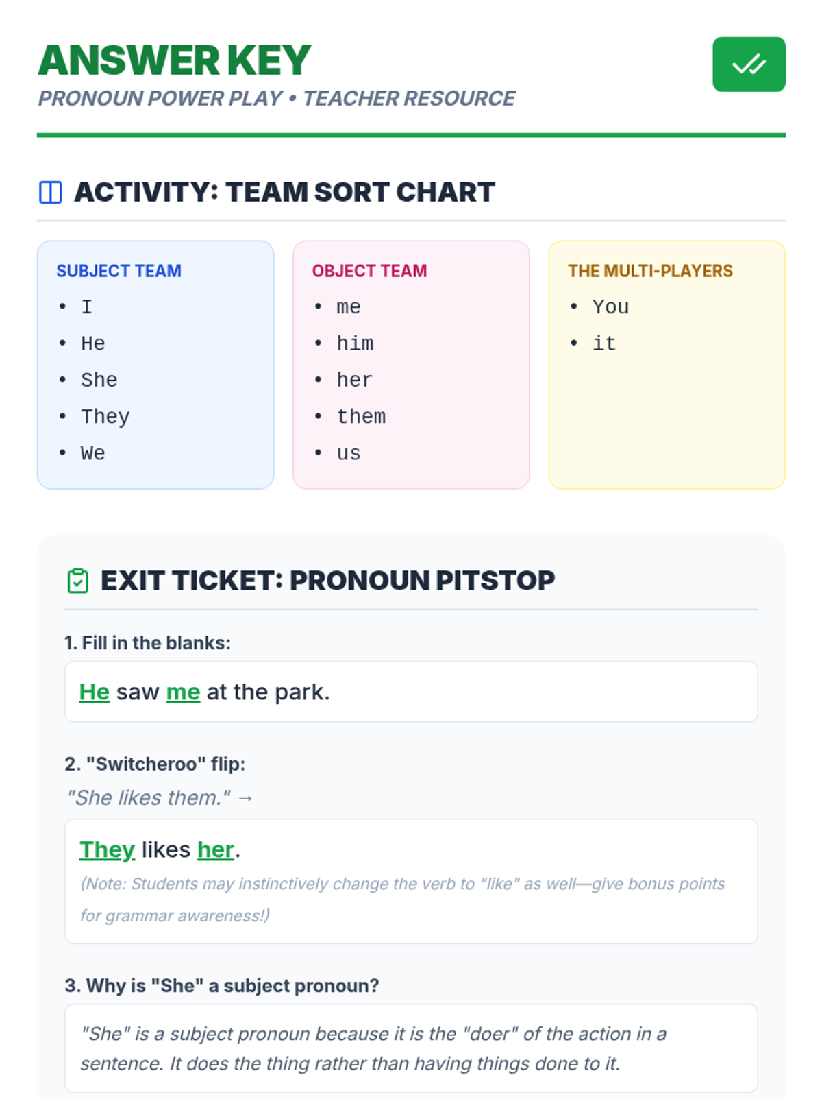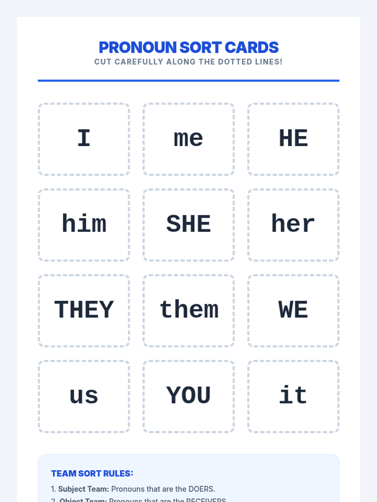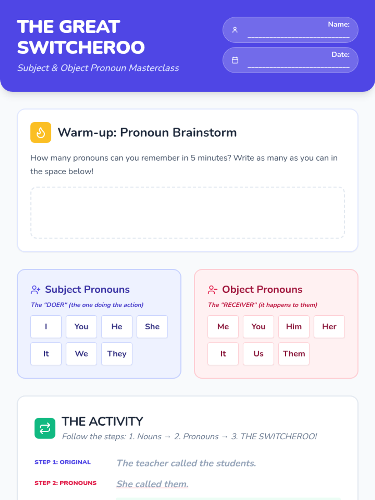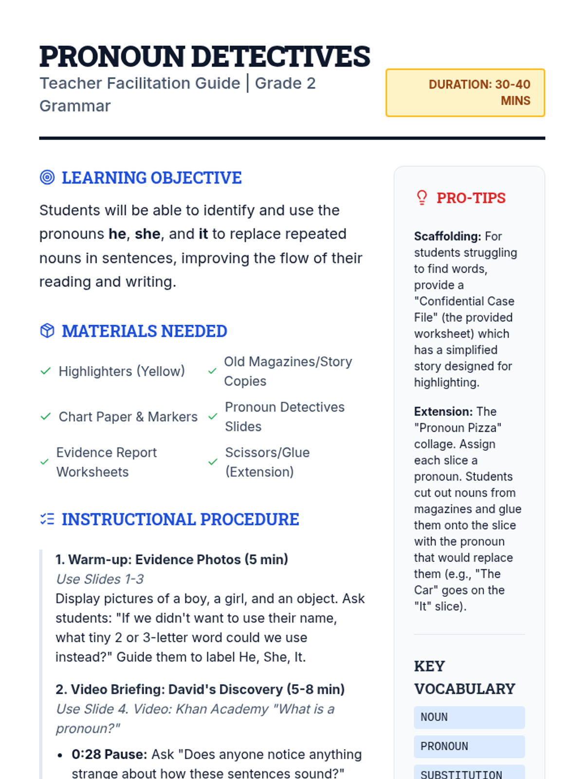 A foundational grammar lesson for kindergarteners to introduce common personal pronouns (he, she, it, they) through play, visual aids, and simple identification activities.