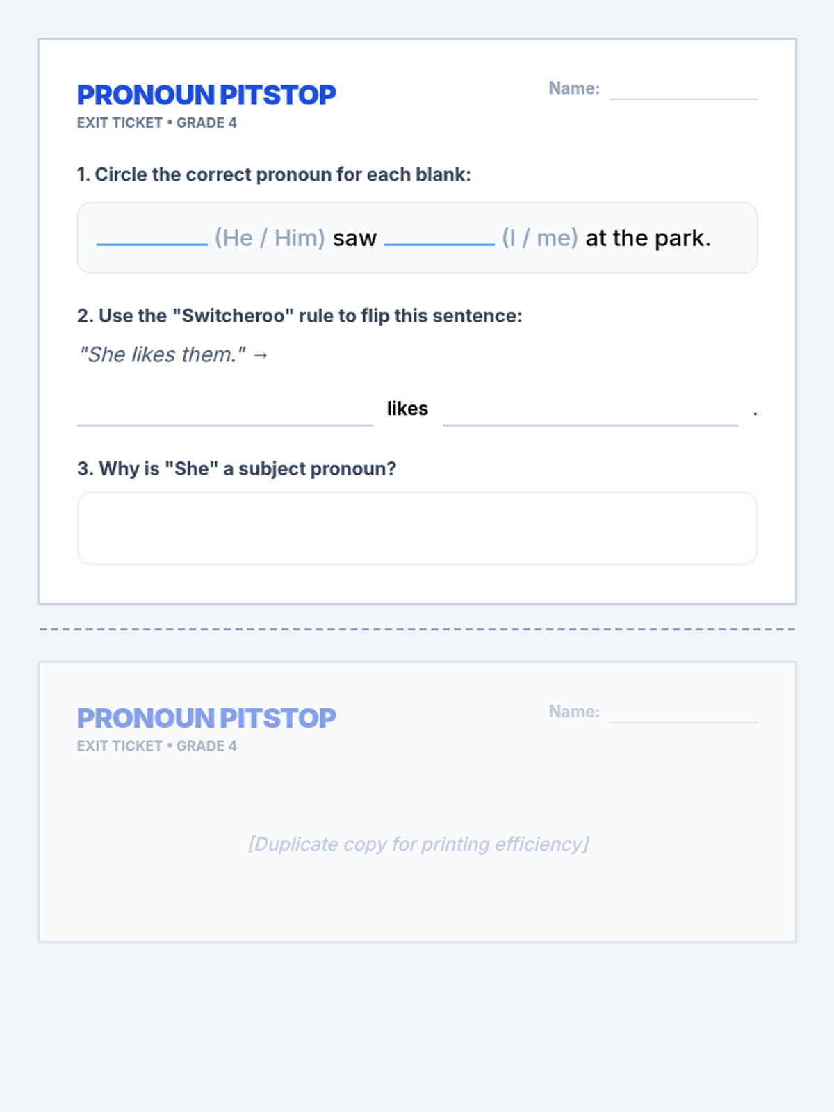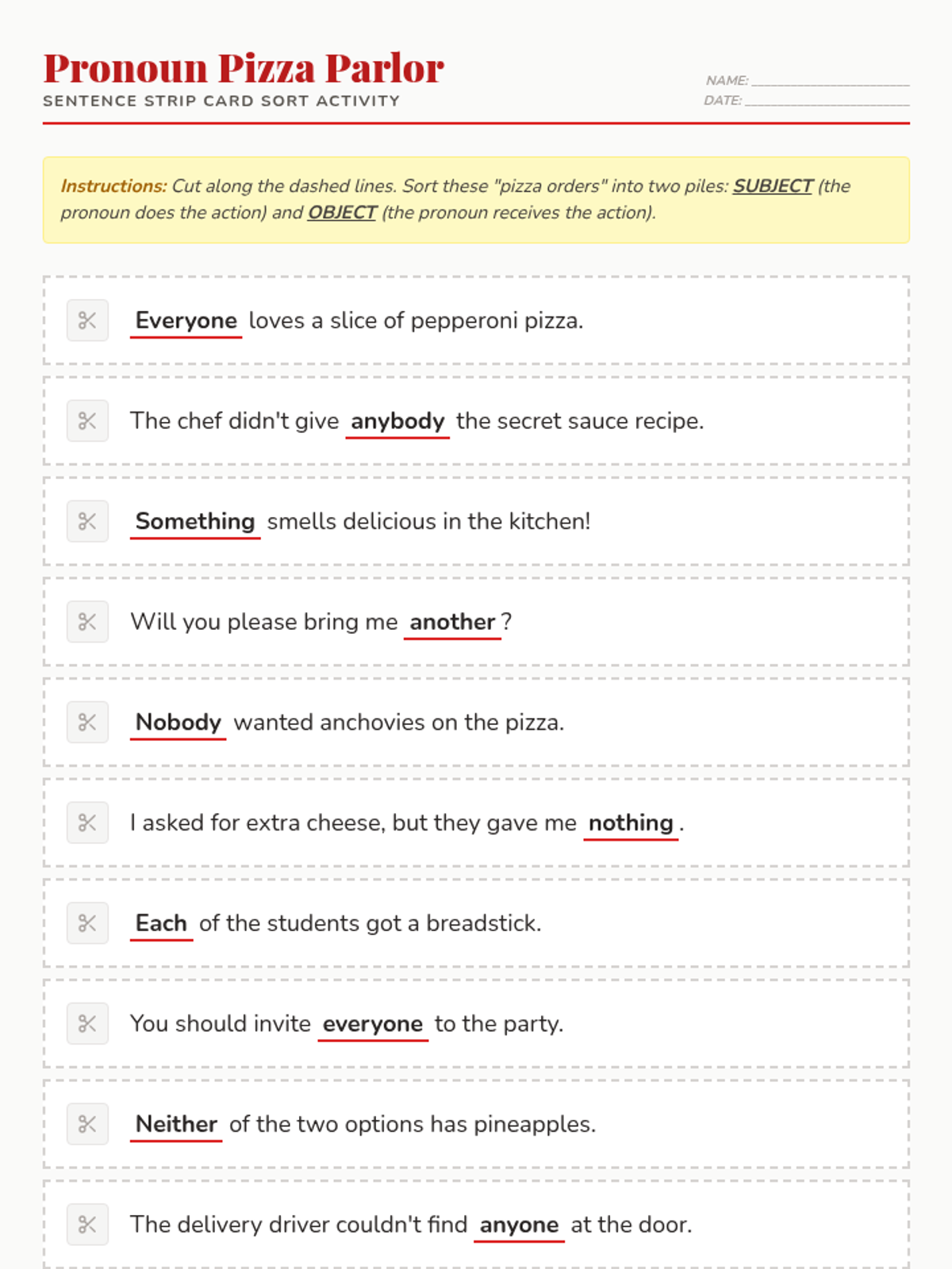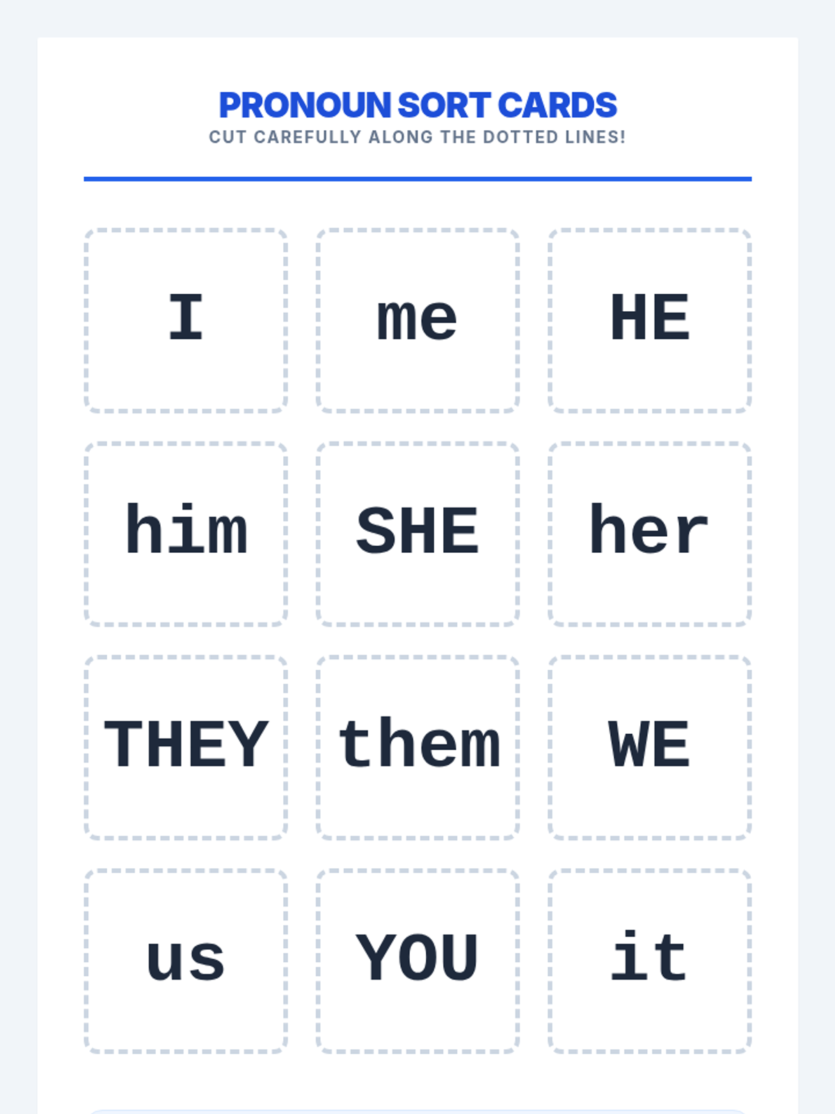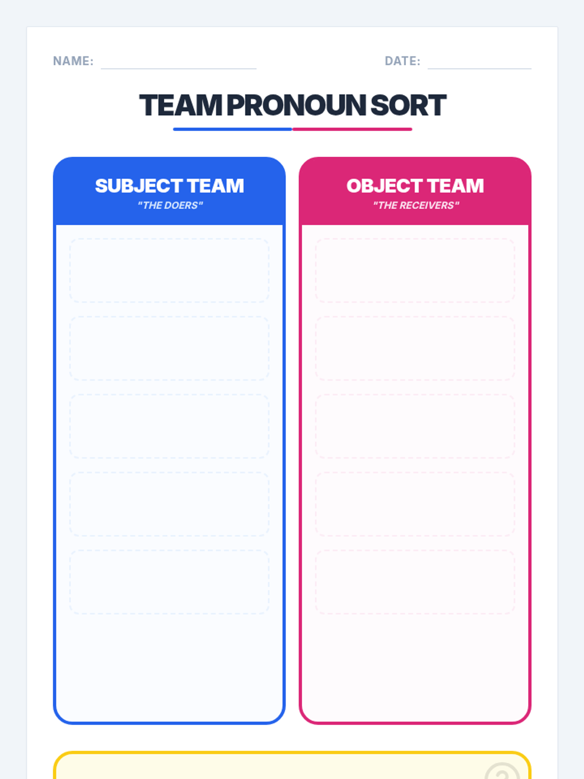 A foundational grammar lesson for kindergarteners to introduce common personal pronouns (he, she, it, they) through play, visual aids, and simple identification activities.