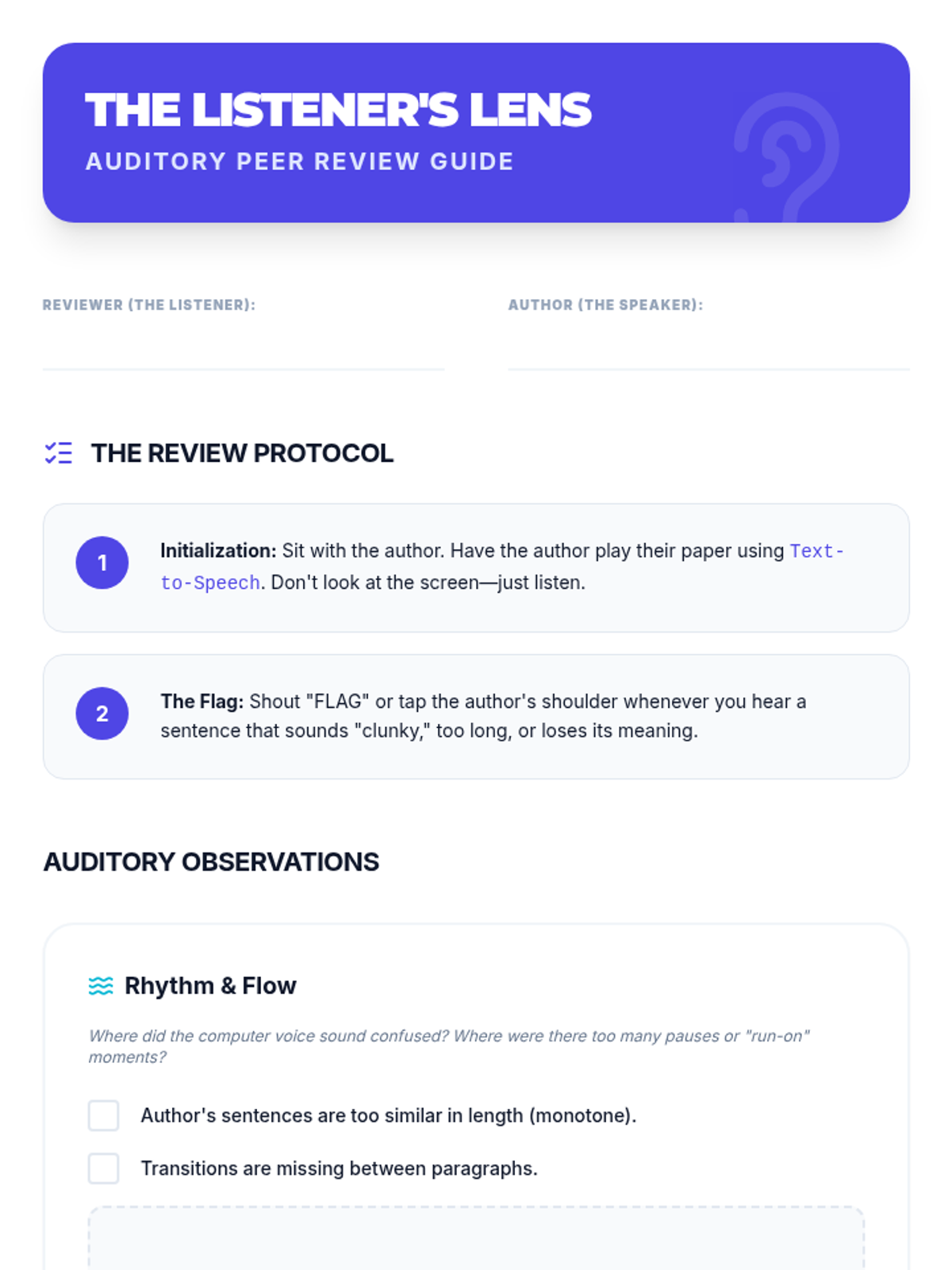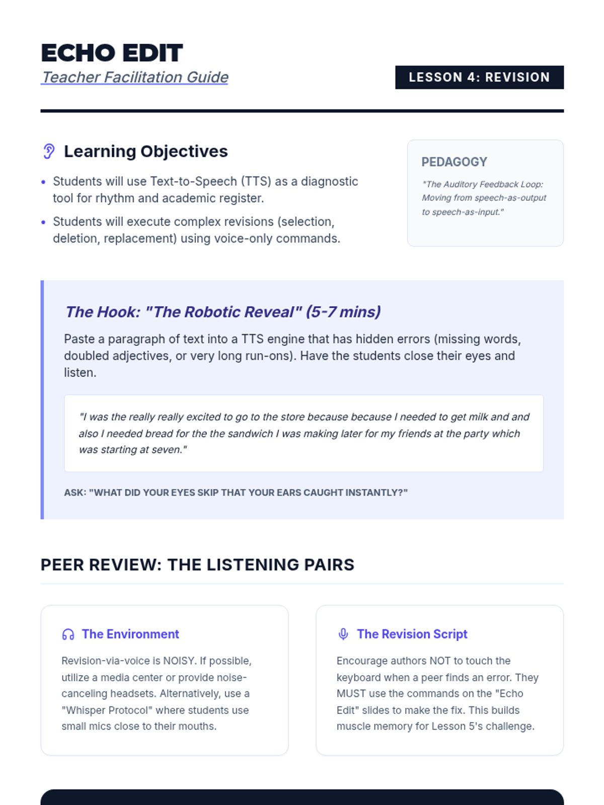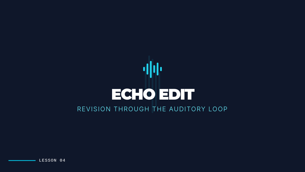 Integrates text-to-speech technology with dictation for a dual-sensory revision process, teaching students to identify flow issues by ear and execute revisions through voice commands.