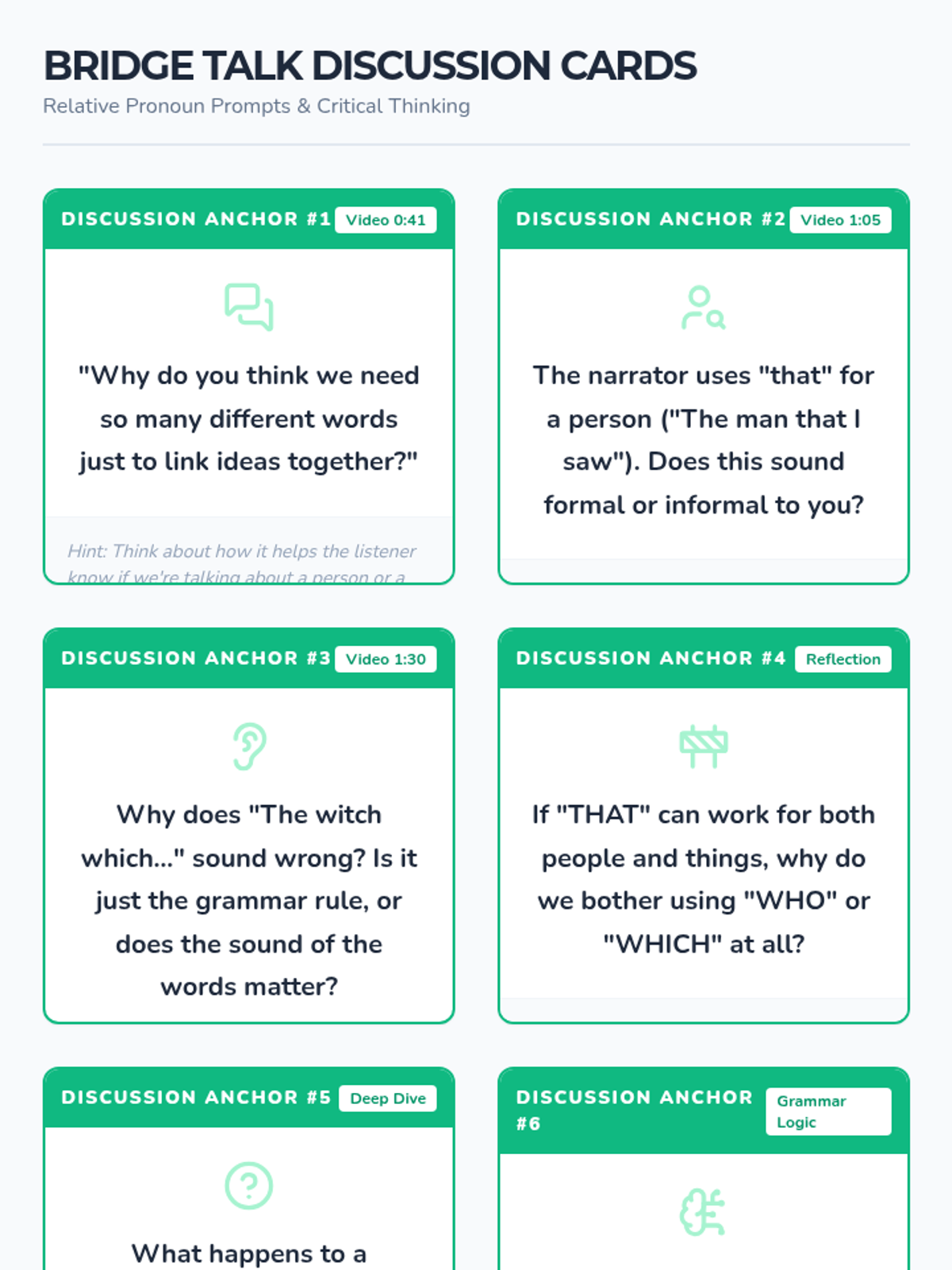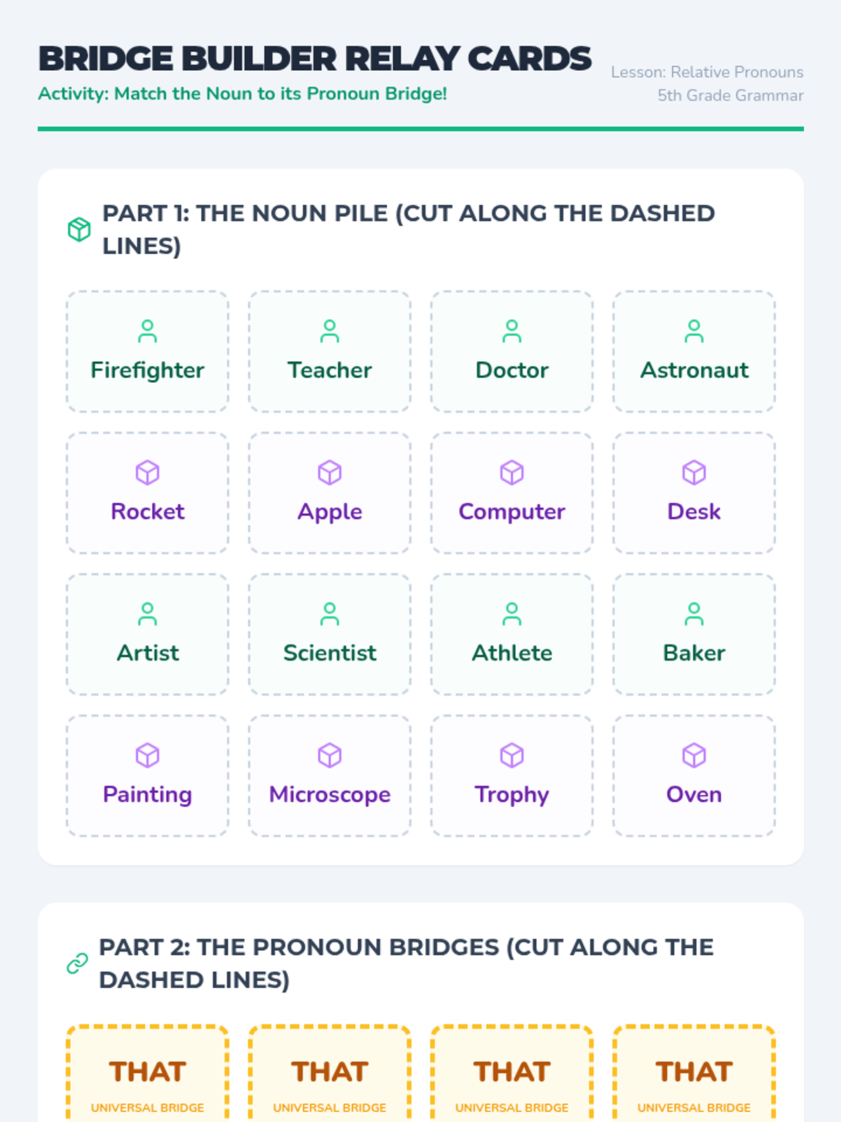 A comprehensive lesson on relative pronouns for 5th graders, using a bridge-building theme to explain how pronouns link clauses. Students categorize pronouns into "People," "Things," or "Both" and explore the versatility of "That" and the restrictions of "Which."