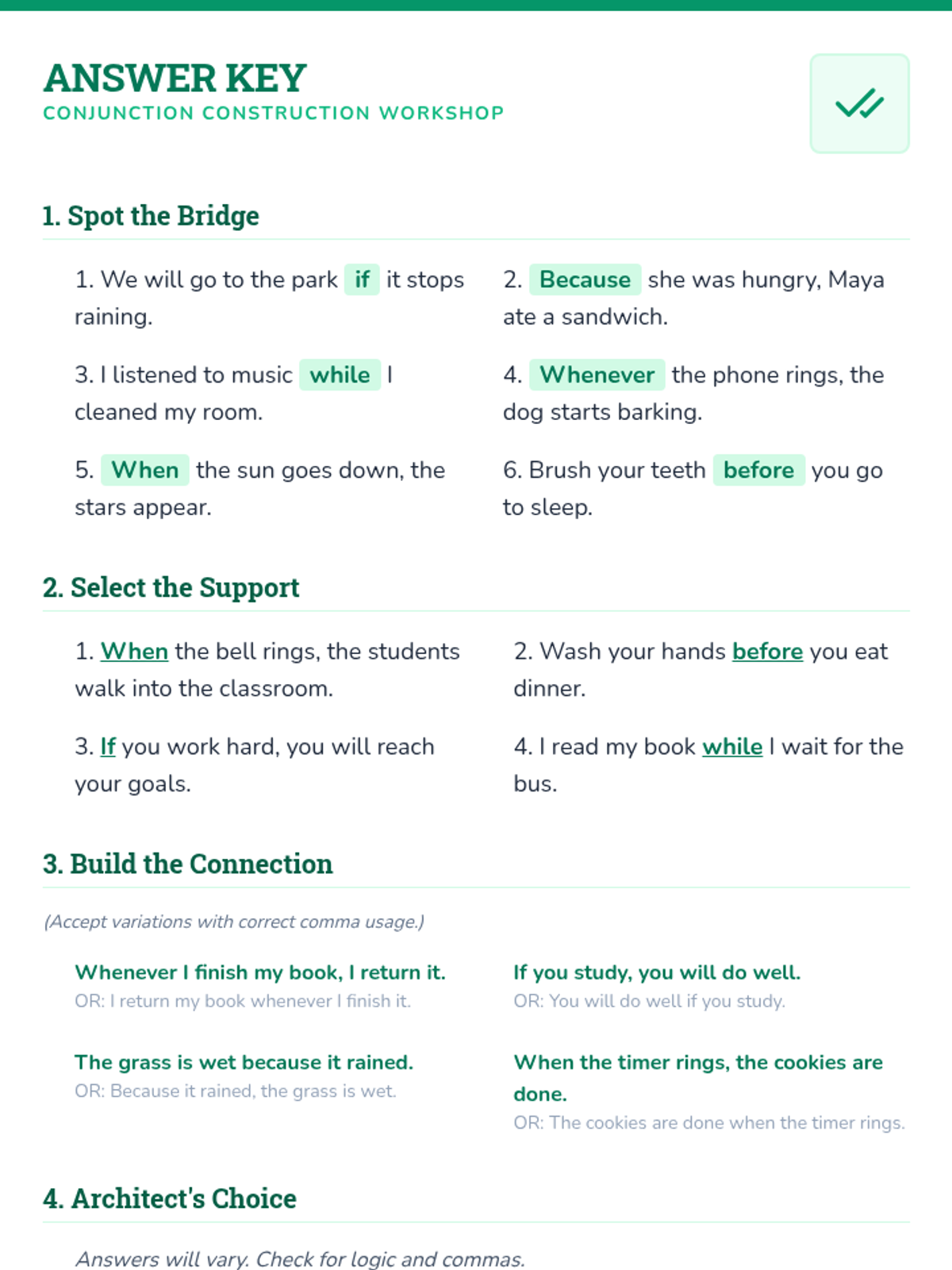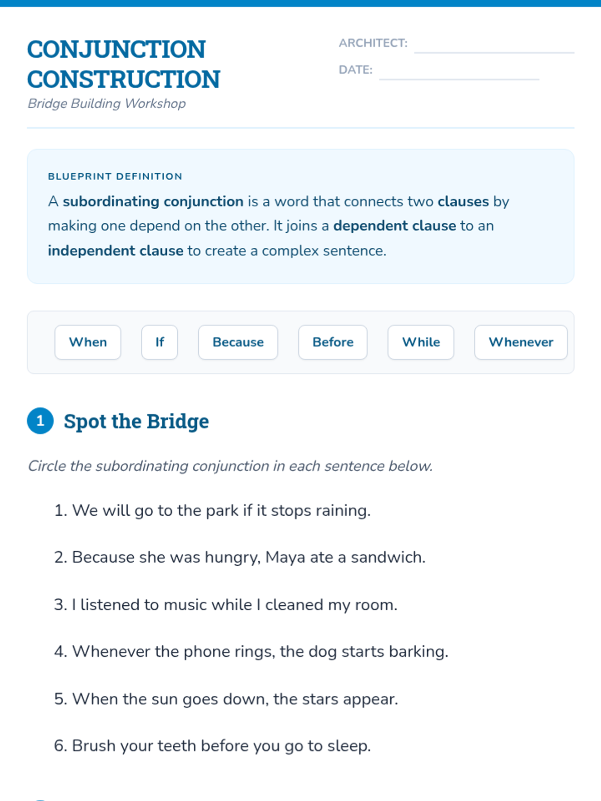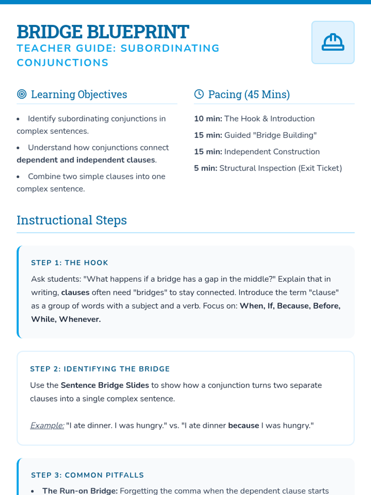 A comprehensive lesson introducing subordinating conjunctions to 4th graders through the theme of 'Bridge Building'. Students learn to identify, select, and use conjunctions to connect ideas into complex sentences.