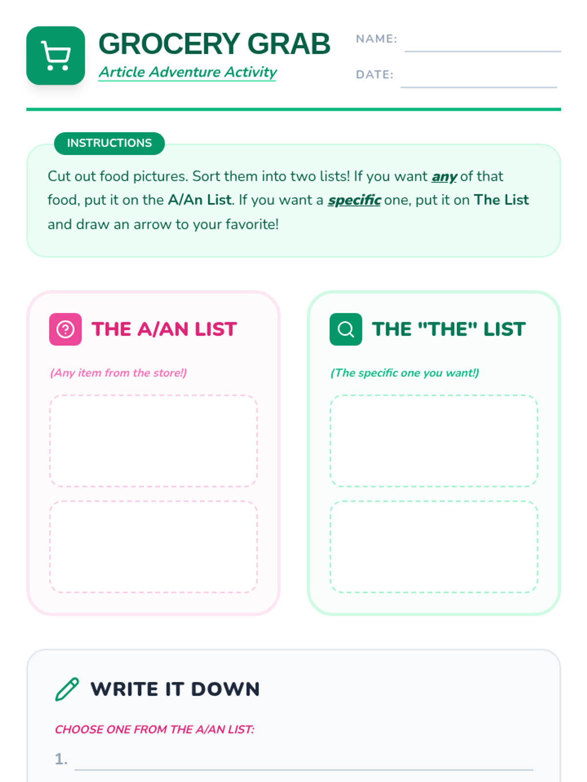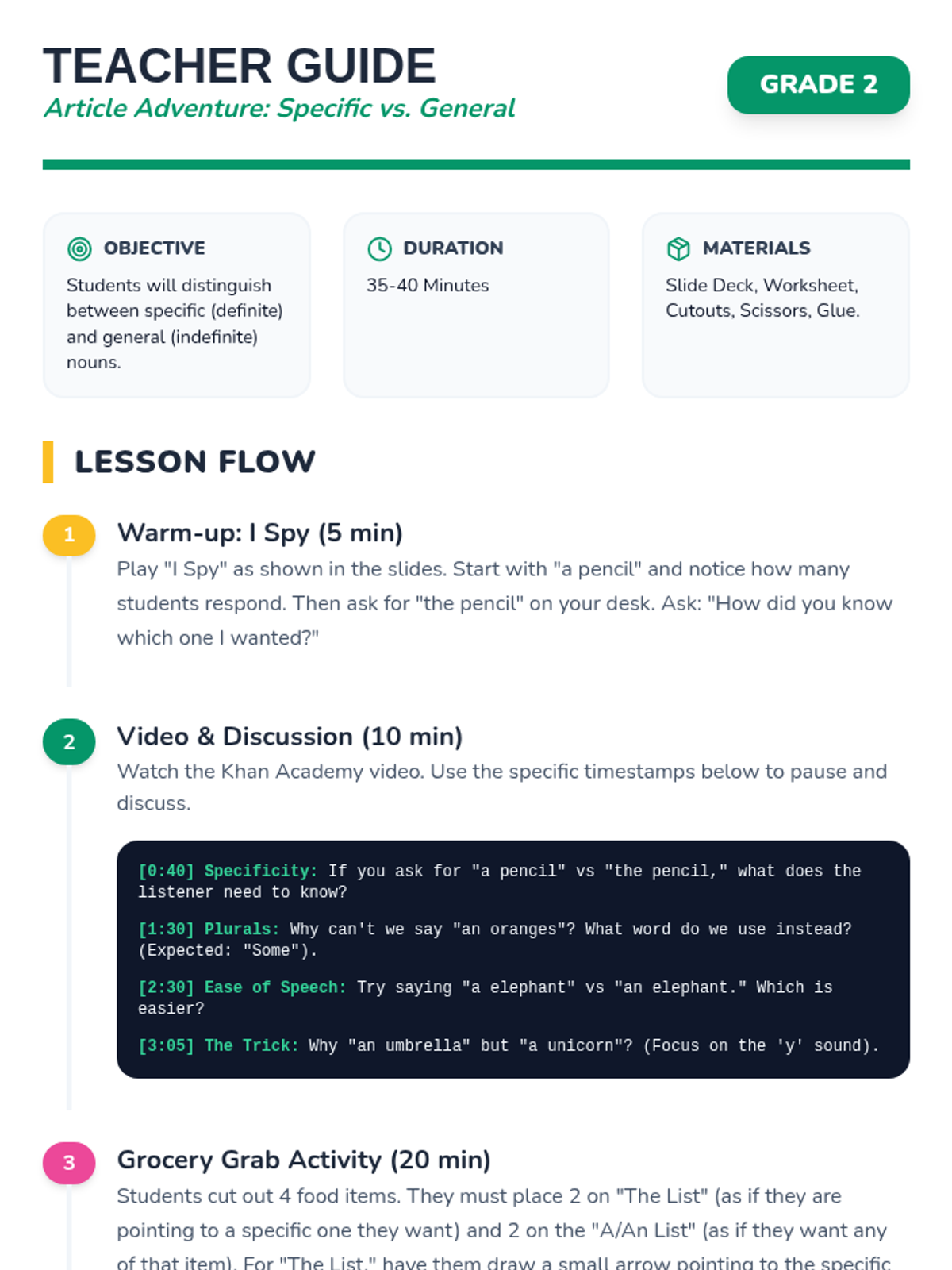 A 2nd-grade grammar lesson focusing on definite (the) and indefinite (a/an) articles using a grocery store theme. Students explore the difference between specific and general nouns through a video, an 'I Spy' game, and a hands-on sorting and sentence-writing activity.