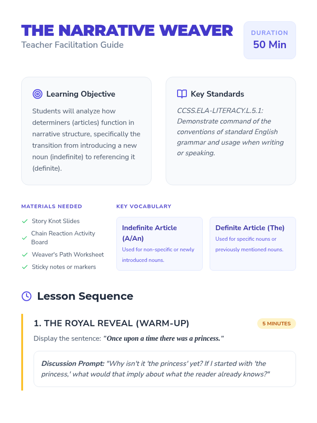 A 5th-grade grammar lesson exploring how indefinite and definite articles (determiners) function in storytelling to introduce and then reference characters and objects. Students will transition from 'a/an' to 'the' through collaborative storytelling and creative writing.