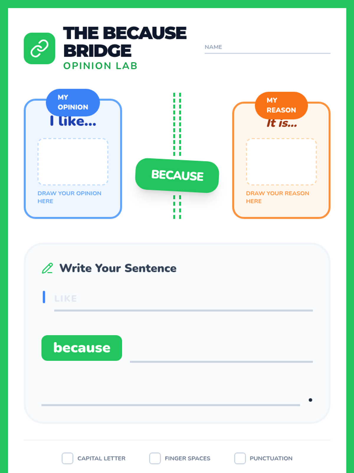 Students learn to bridge their opinions with reasons using the conjunction 'because', transitioning from simple statements to supported claims.