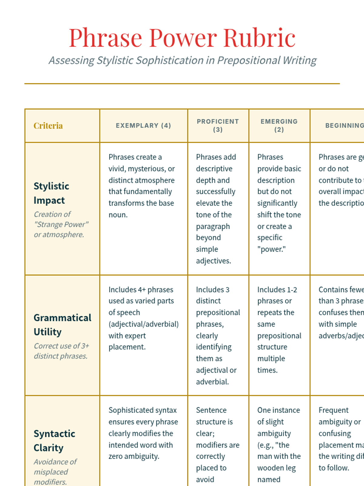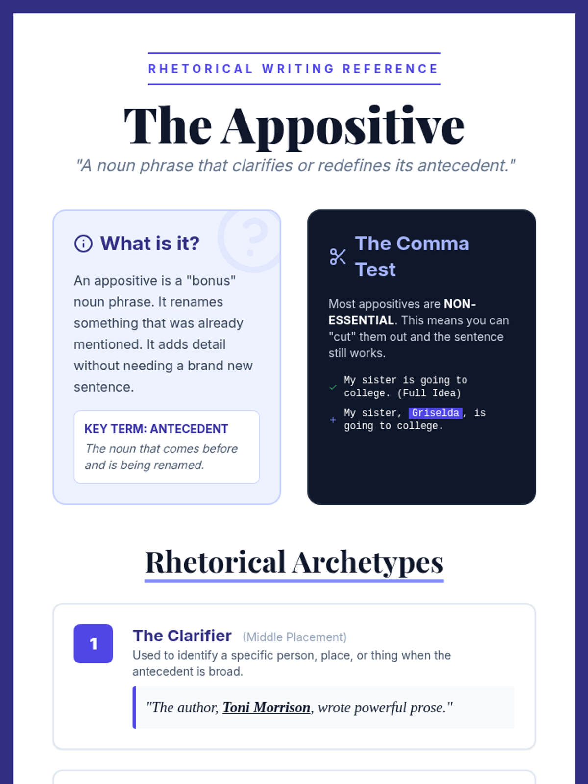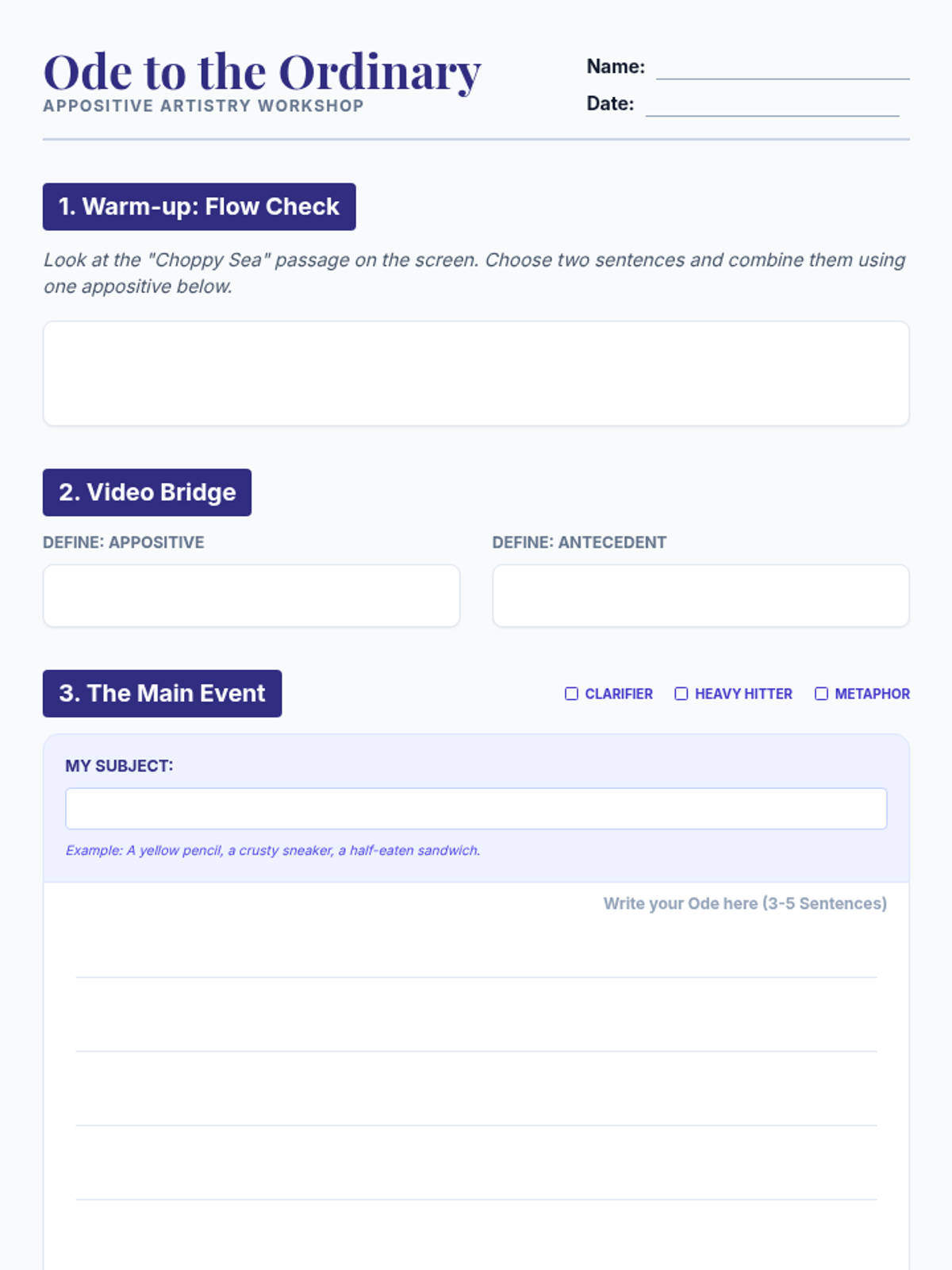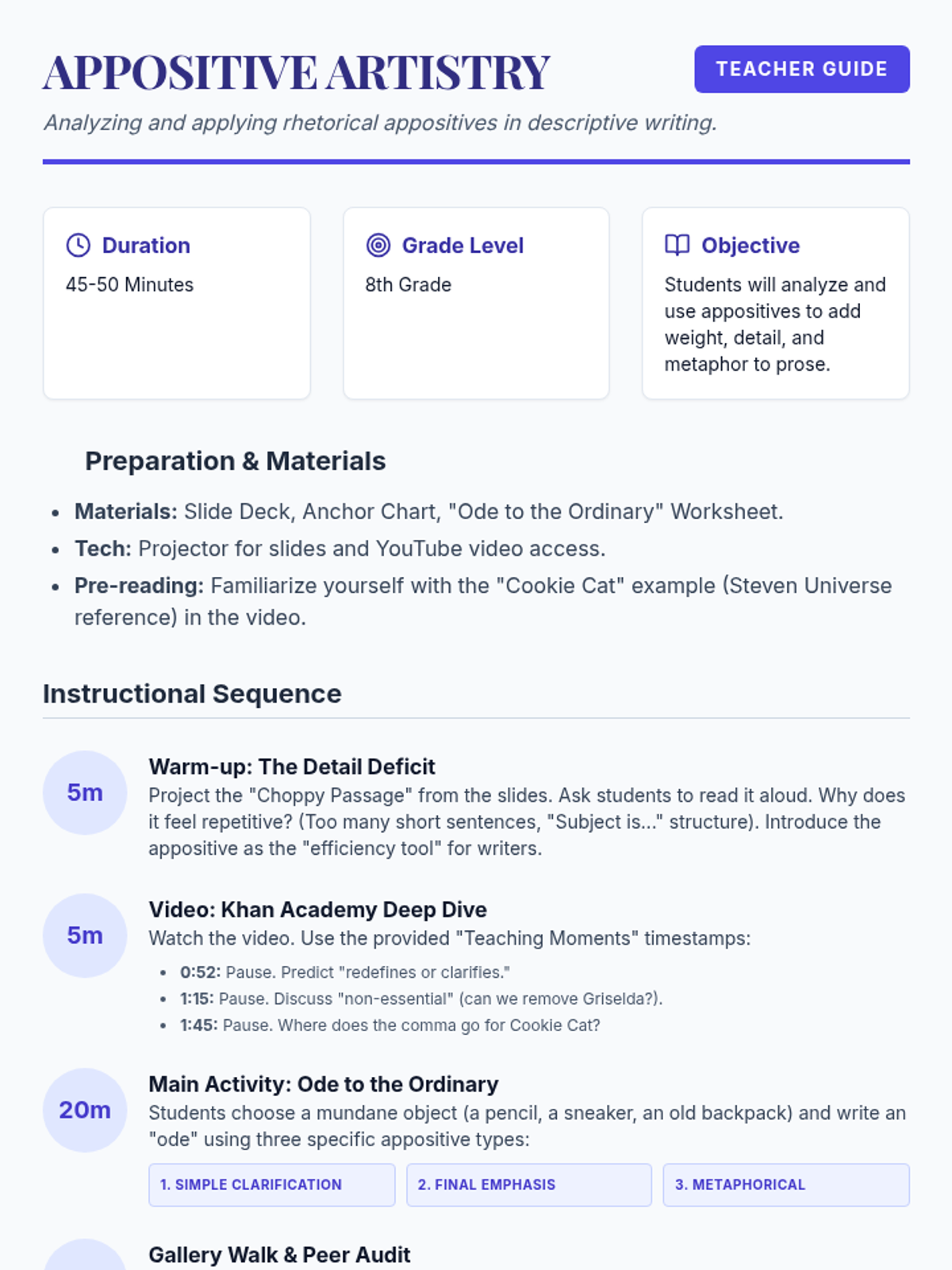 A lesson focusing on the rhetorical power of appositives in descriptive writing, guiding students from basic identification to sophisticated stylistic application.