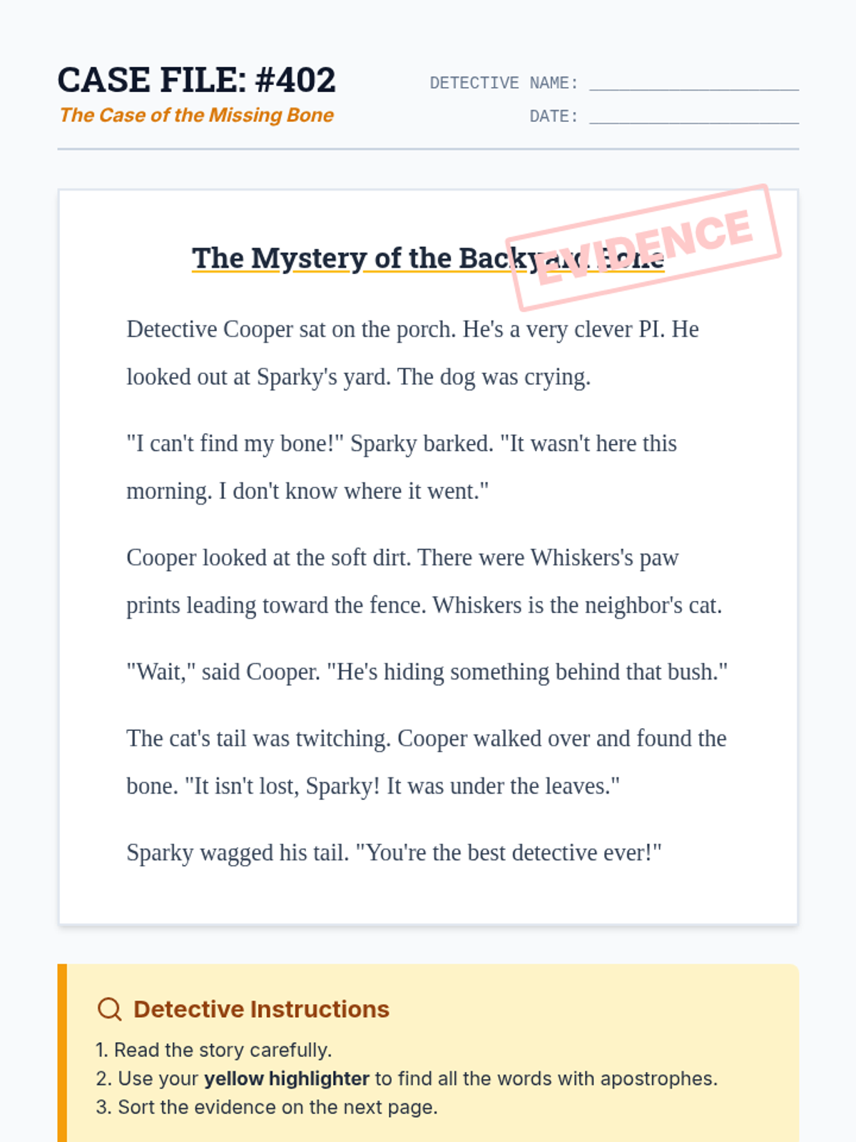 A 3rd-grade grammar lesson where students become 'Apostrophe Detectives' to distinguish between contractions (two words combined) and possessive apostrophes (showing ownership). The lesson uses a detective-themed narrative to engage students in analyzing punctuation within a short story.