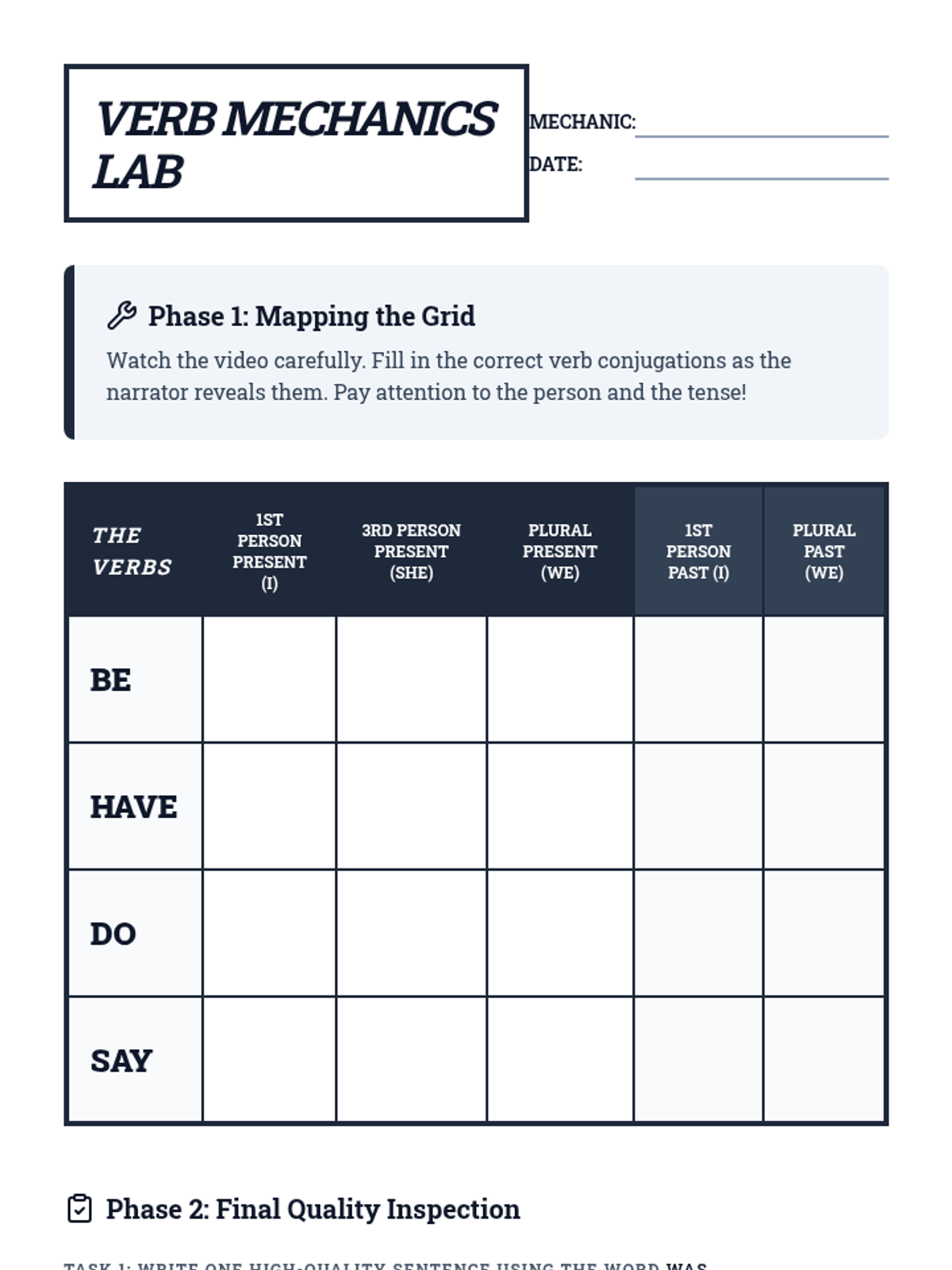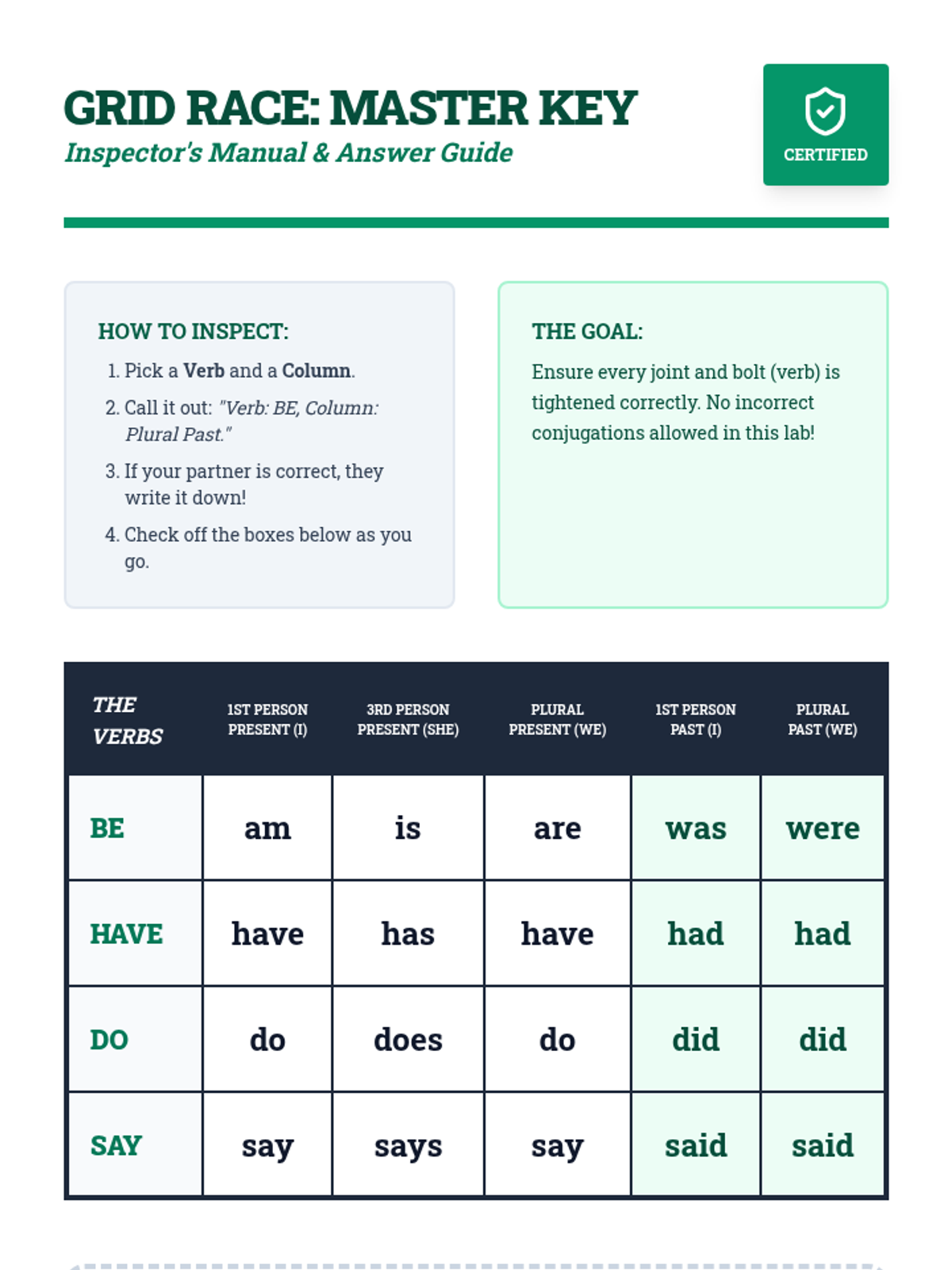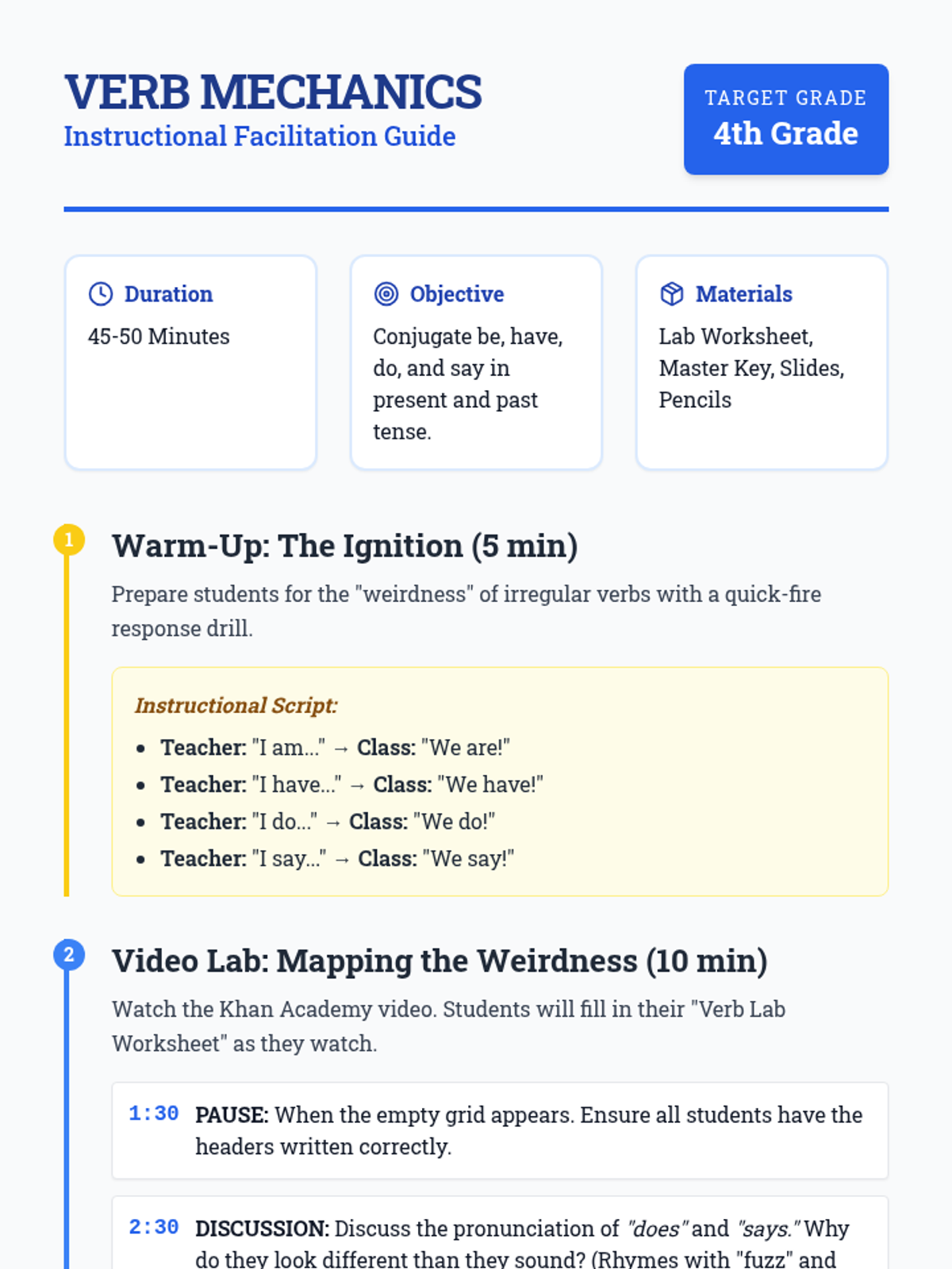A high-energy grammar lesson where students master the four most common irregular verbs—be, have, do, and say—through a video-guided workshop and a fast-paced partner activity called 'Grid Race'.