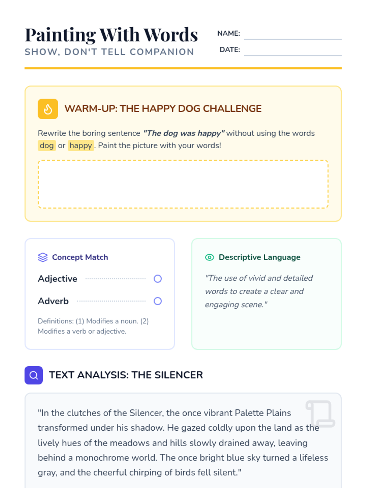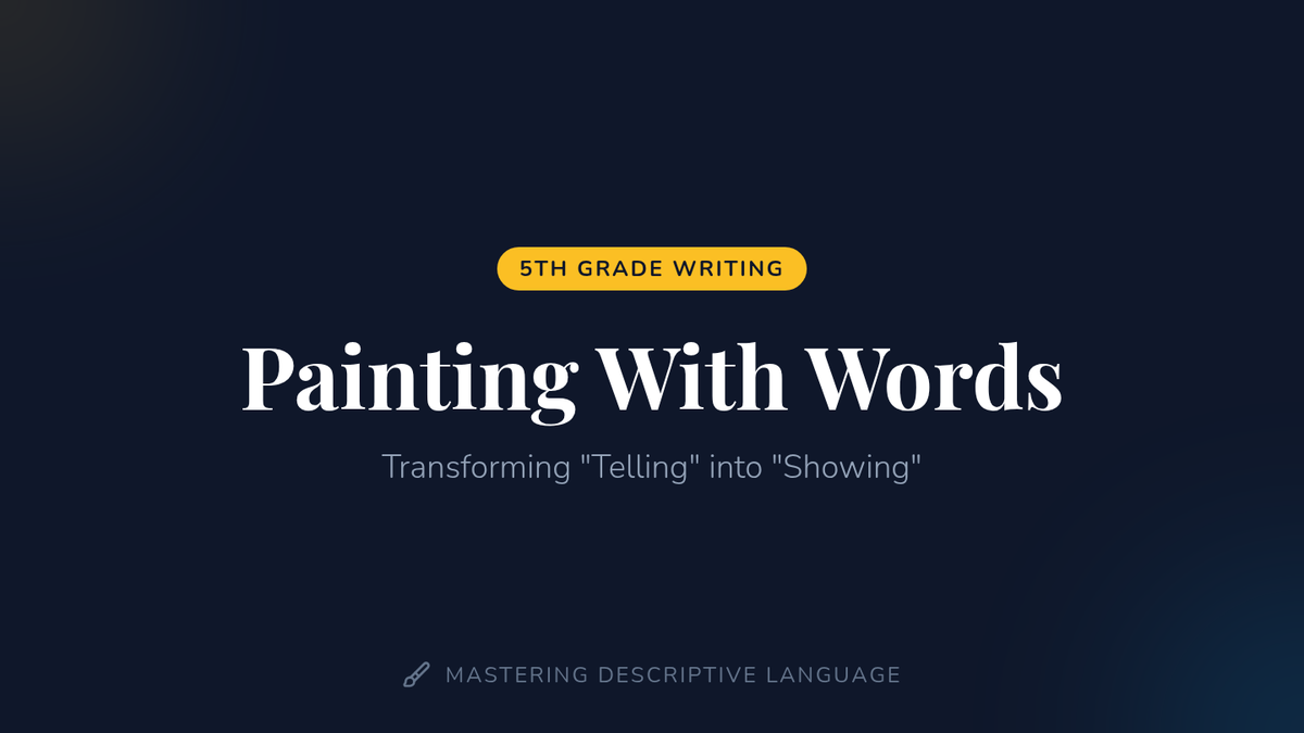 Students will transform 'telling' sentences into 'showing' sentences using adjectives, adverbs, and sensory details, inspired by the 'Palette Plains' narrative mission.
