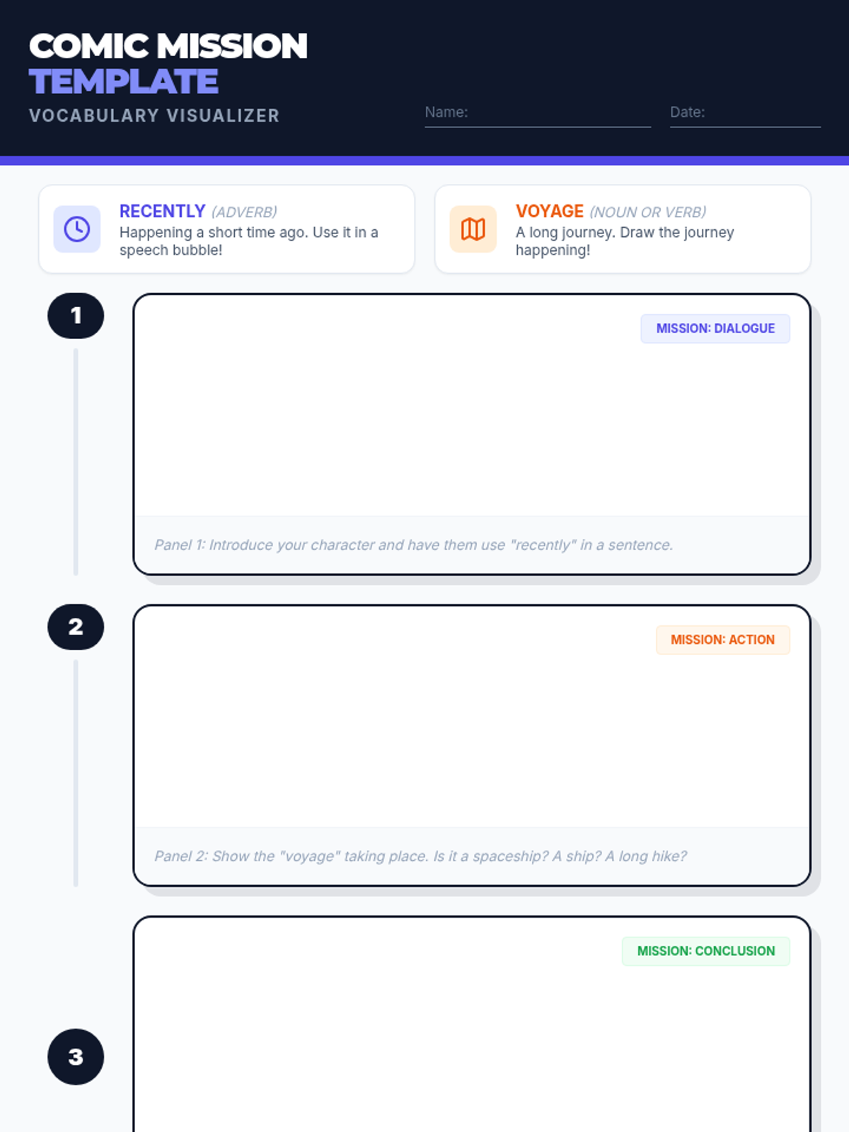 A vocabulary lesson for 3rd graders focused on the words 'recently' and 'voyage' through a creative comic strip activity and a space-themed video.