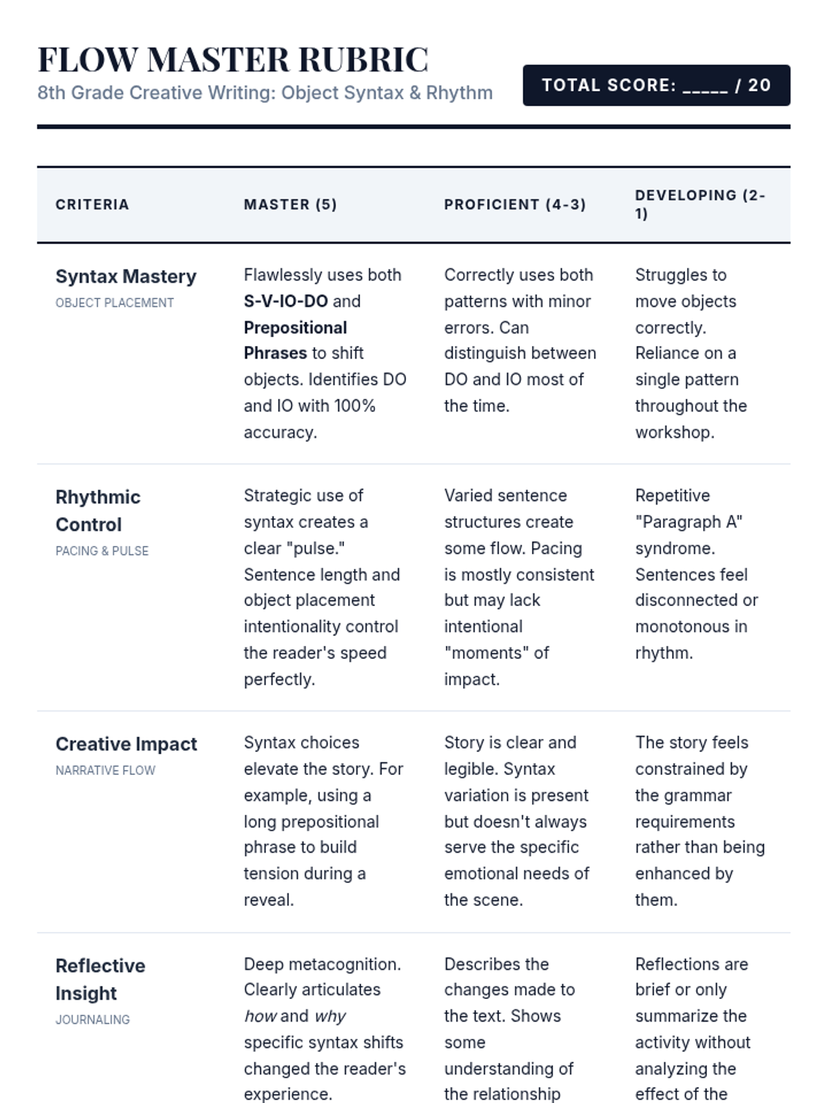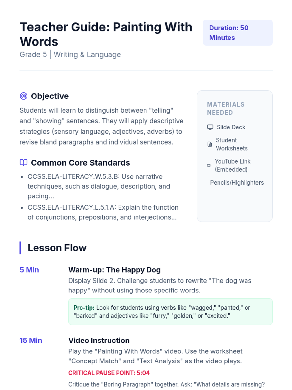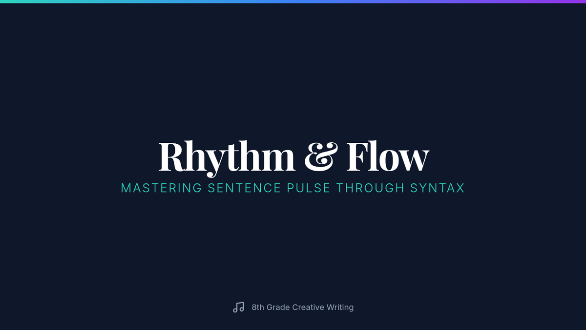 A comprehensive lesson on narrative sentence variation focusing on varied beginnings, sentence combining, length modulation, and descriptive clauses. Students move from identifying monotone rhythms to crafting dynamic, flowing prose.