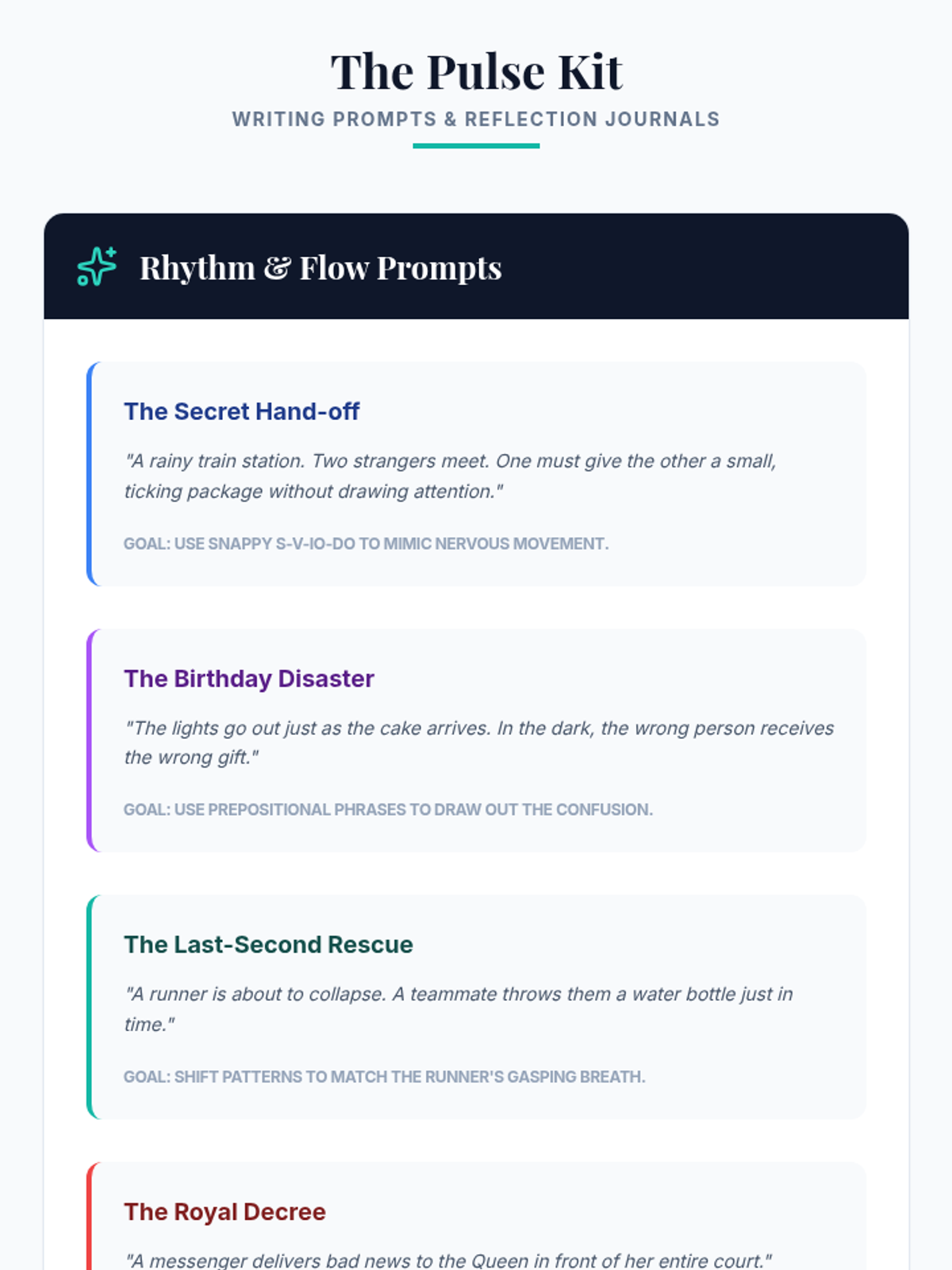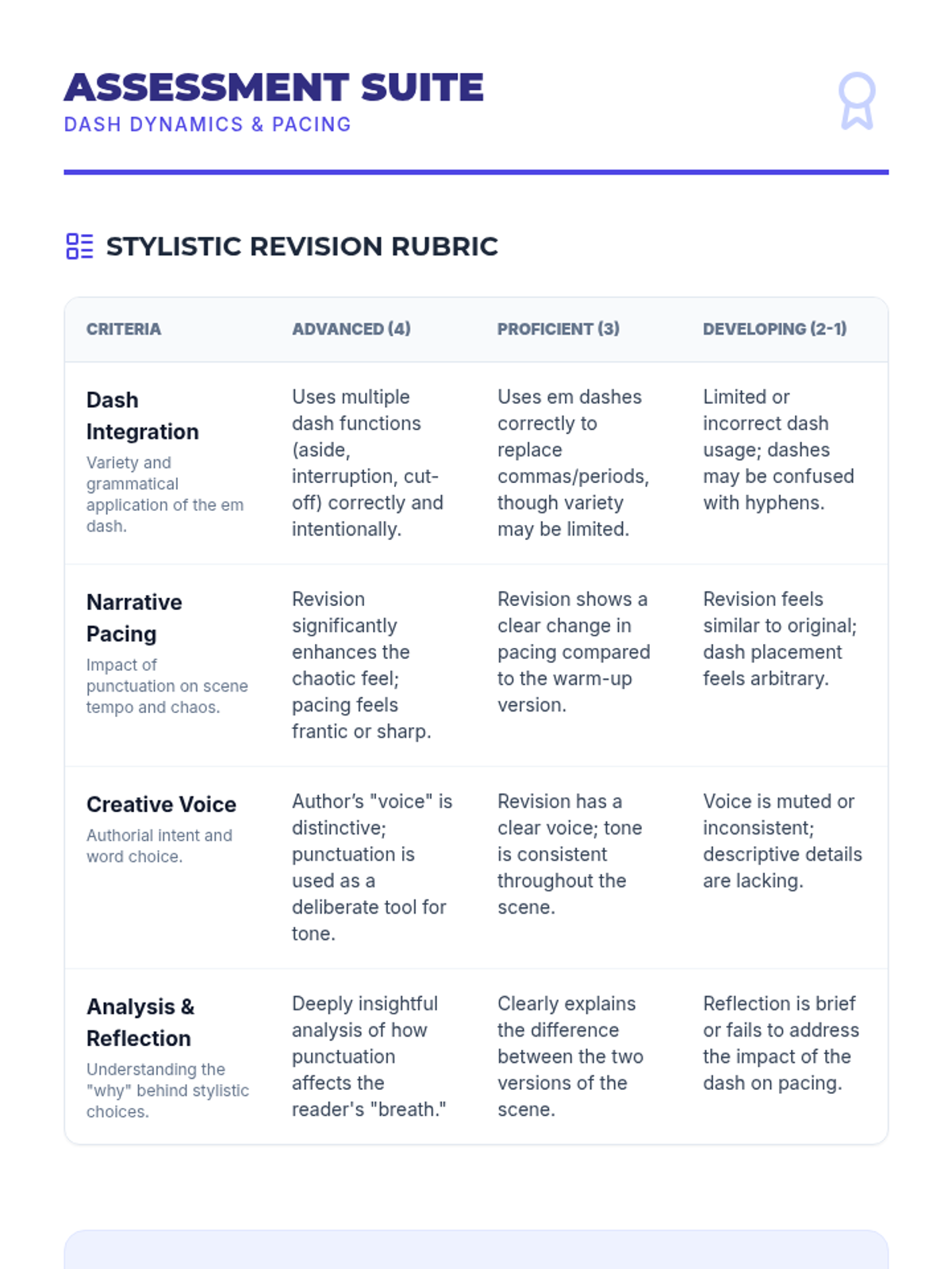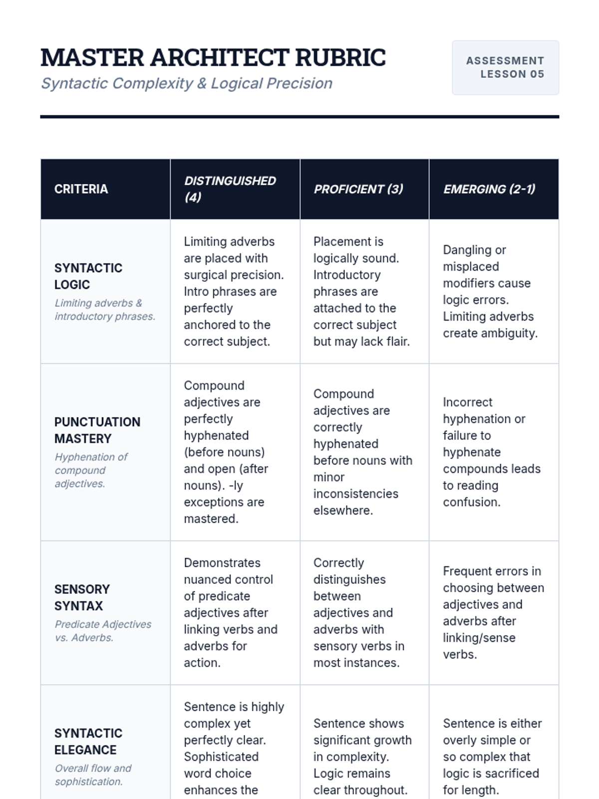 A comprehensive lesson on narrative sentence variation focusing on varied beginnings, sentence combining, length modulation, and descriptive clauses. Students move from identifying monotone rhythms to crafting dynamic, flowing prose.