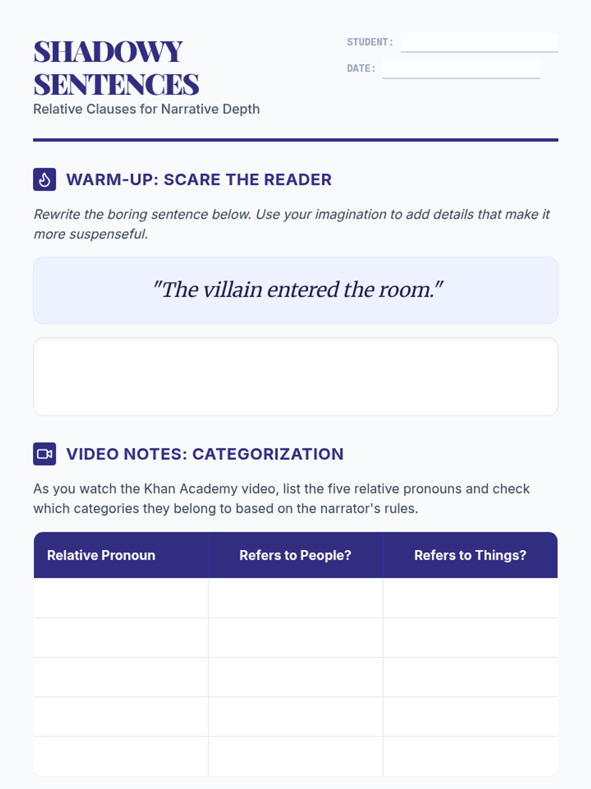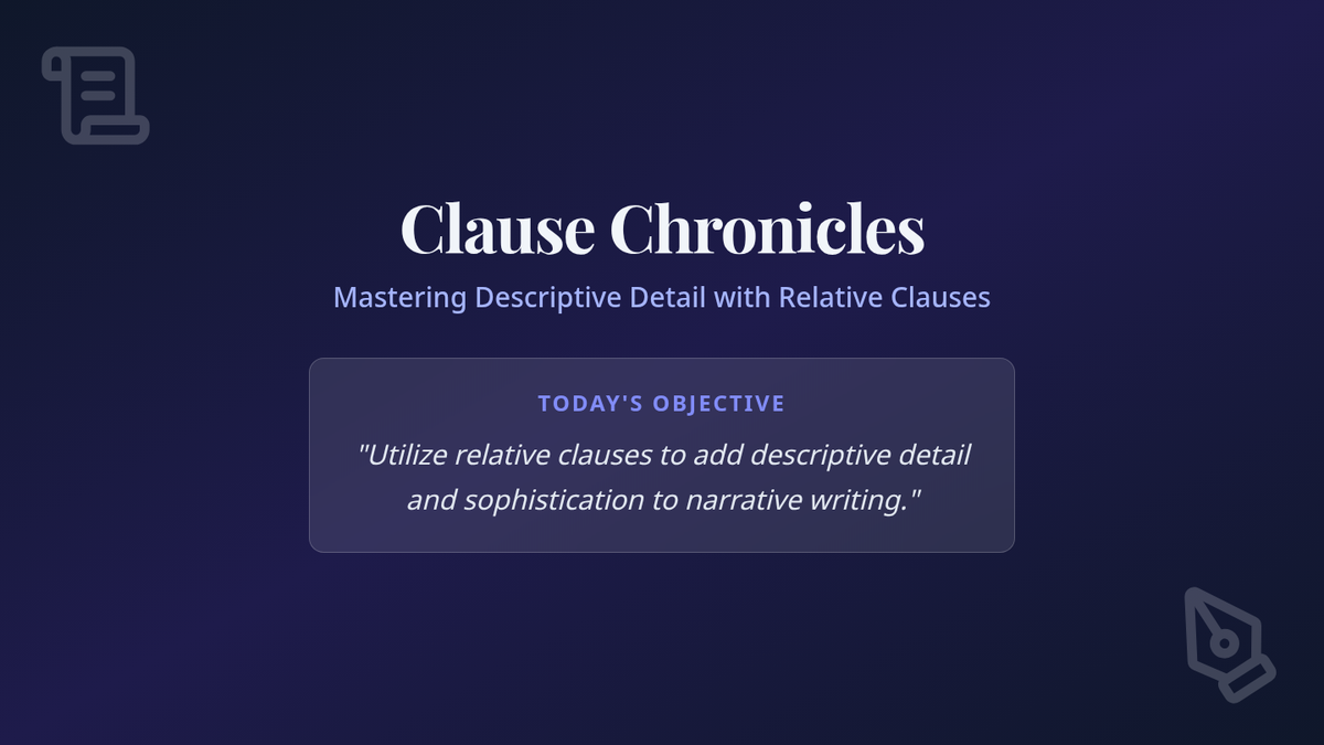 A 7th-grade grammar lesson focusing on relative clauses to enhance narrative writing. Students transition from basic sentences to sophisticated descriptions using relative pronouns and clauses.