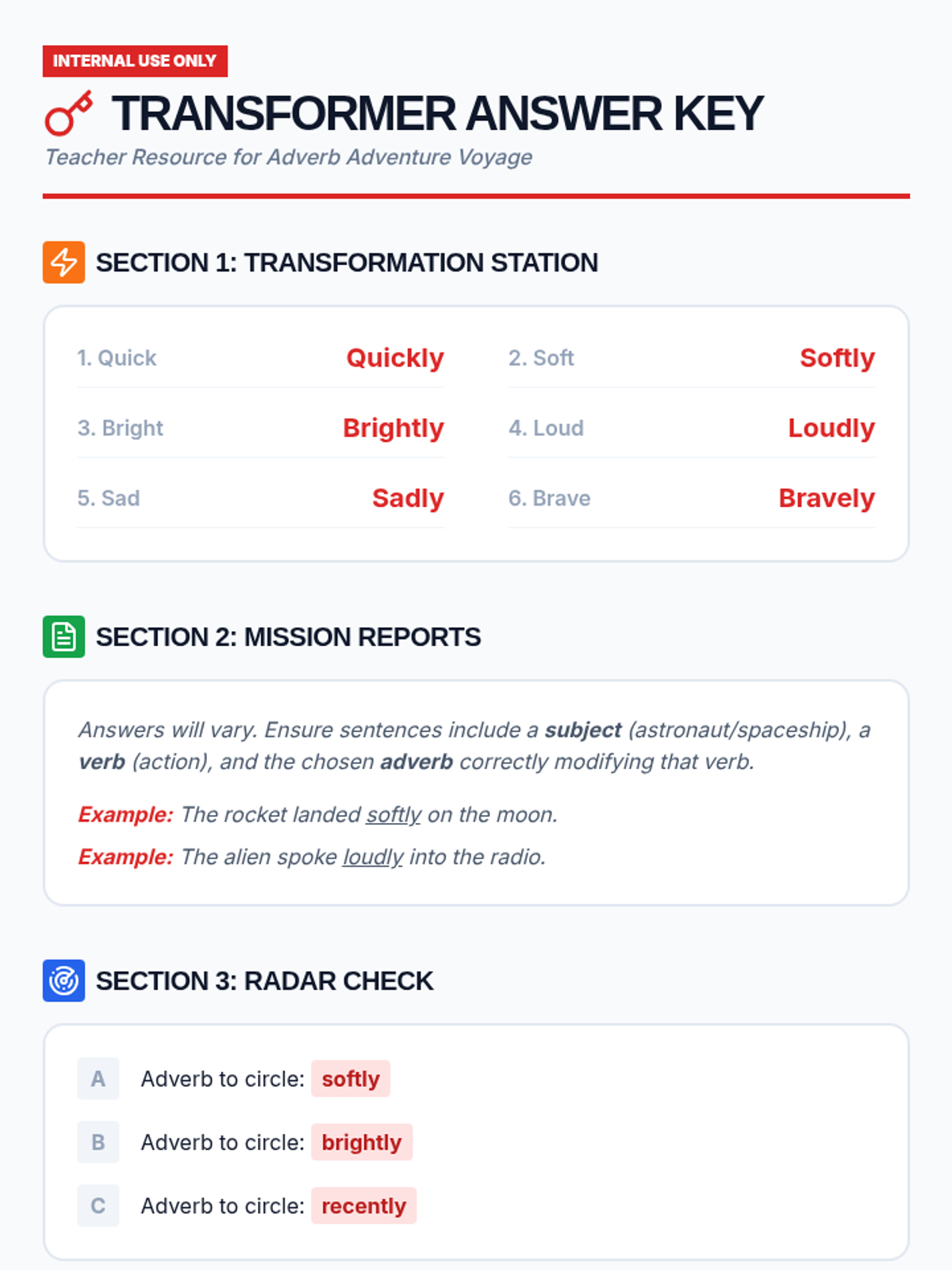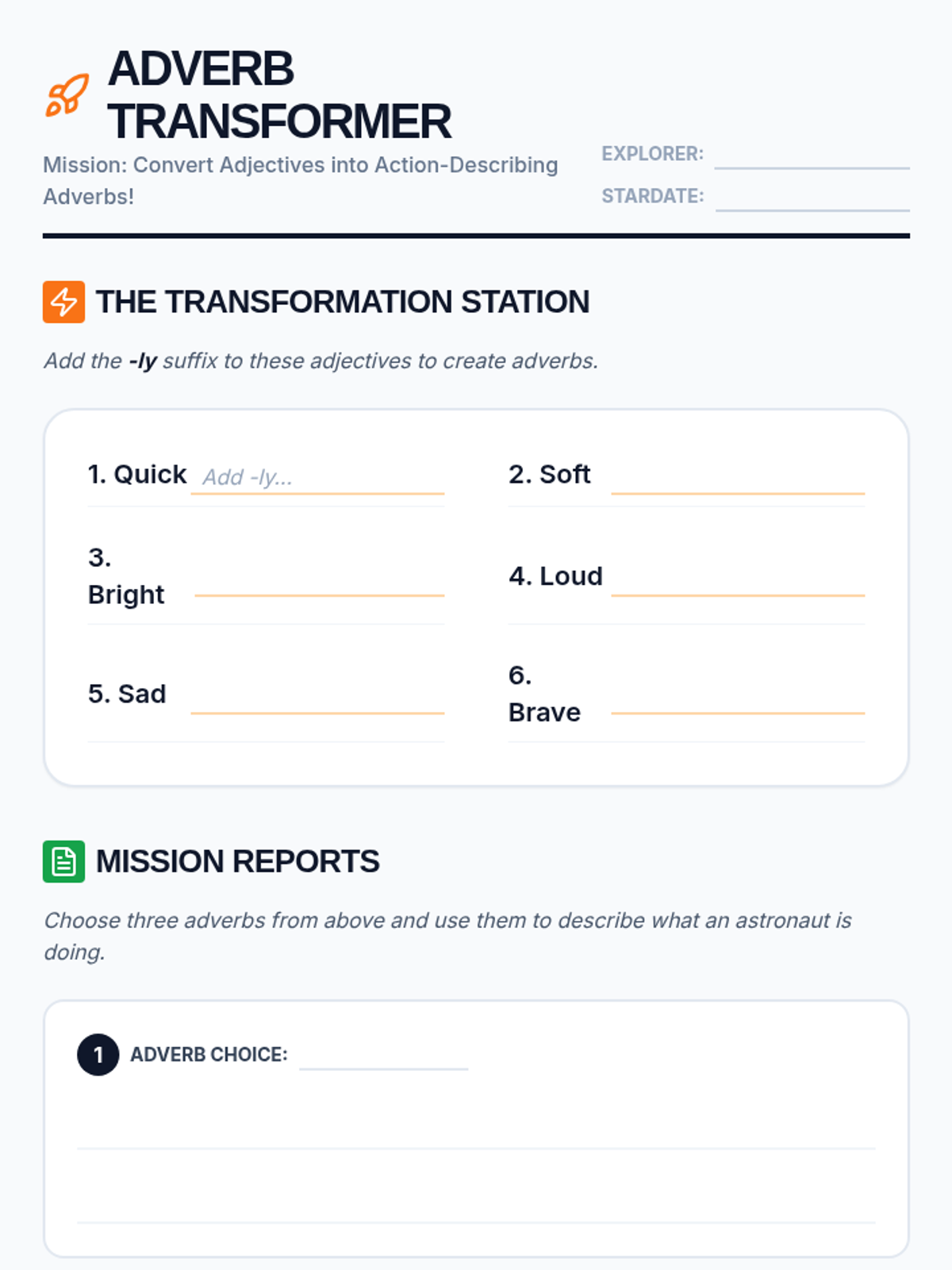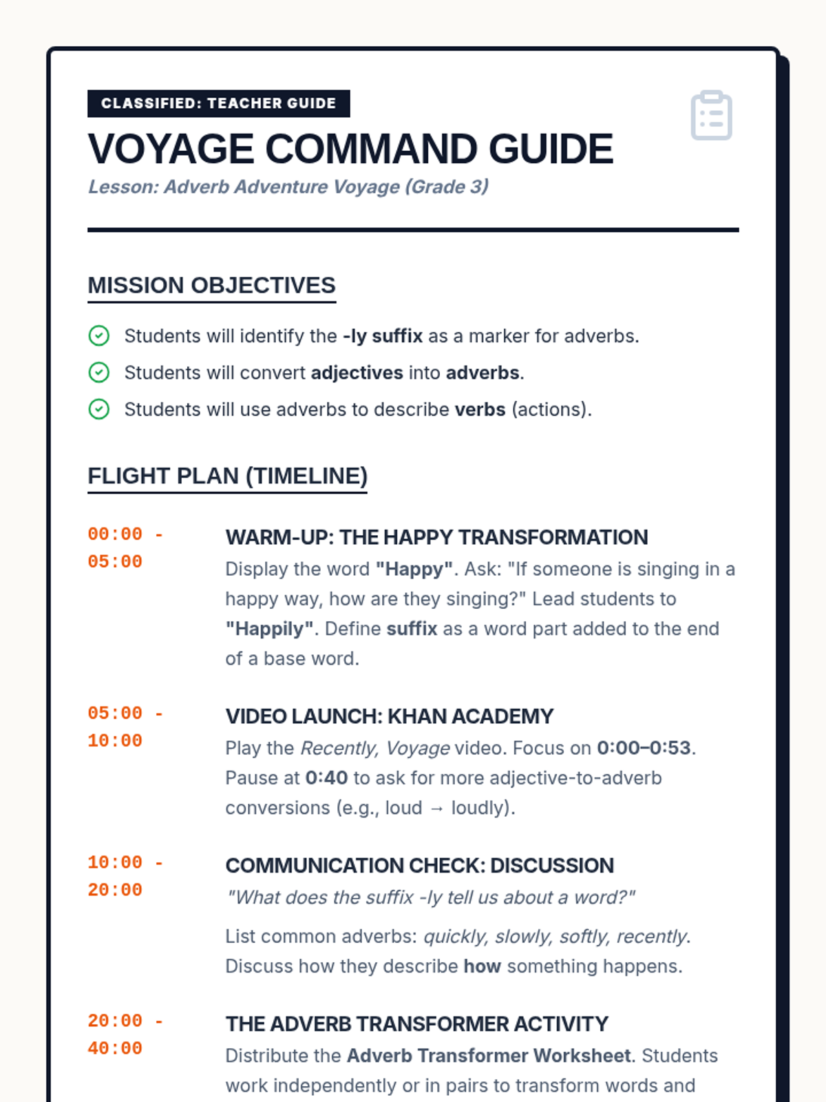A space-themed 3rd-grade grammar lesson focusing on identifying and creating -ly adverbs using the Khan Academy 'Recently' video as a hook.