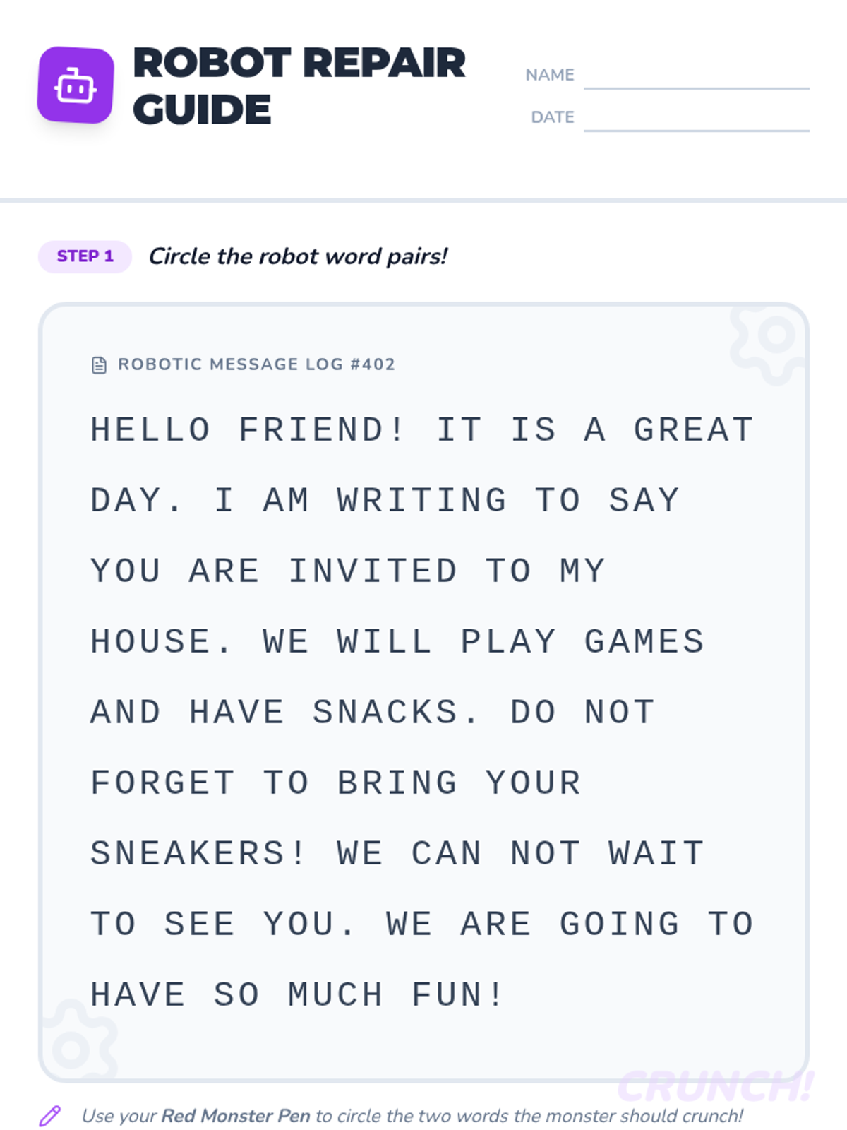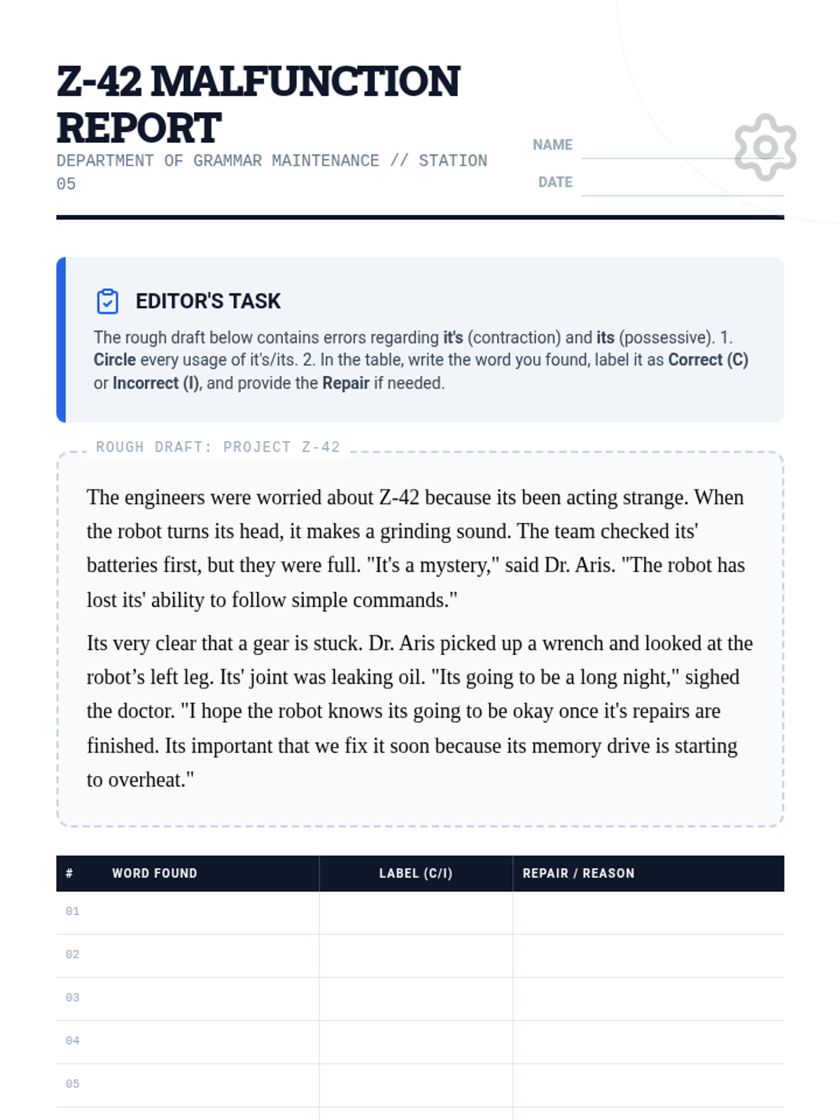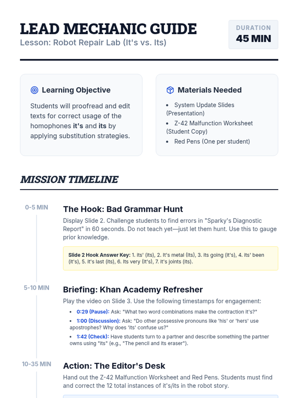 A high-energy lesson focused on mastering the homophones it's and its through the lens of a robot repair technician. Students hunt for errors in a 'malfunctioning' text and apply editing strategies to fix a story about a robot.