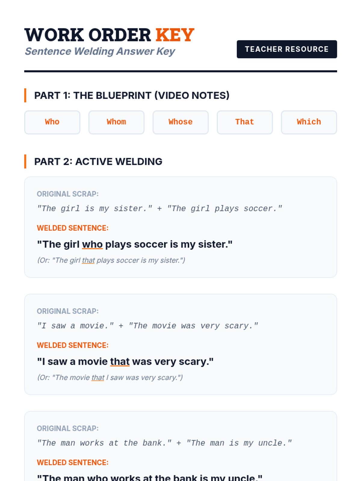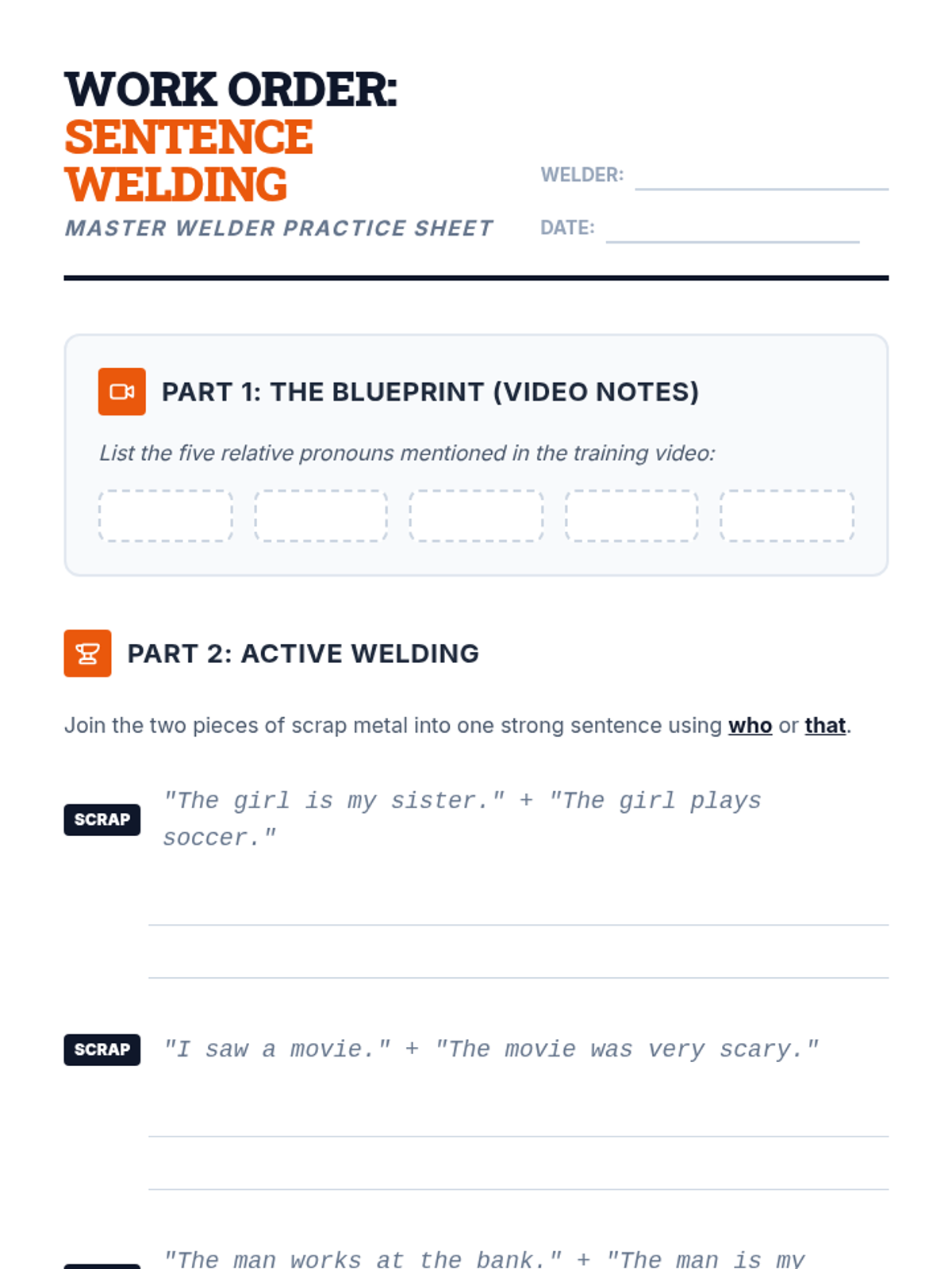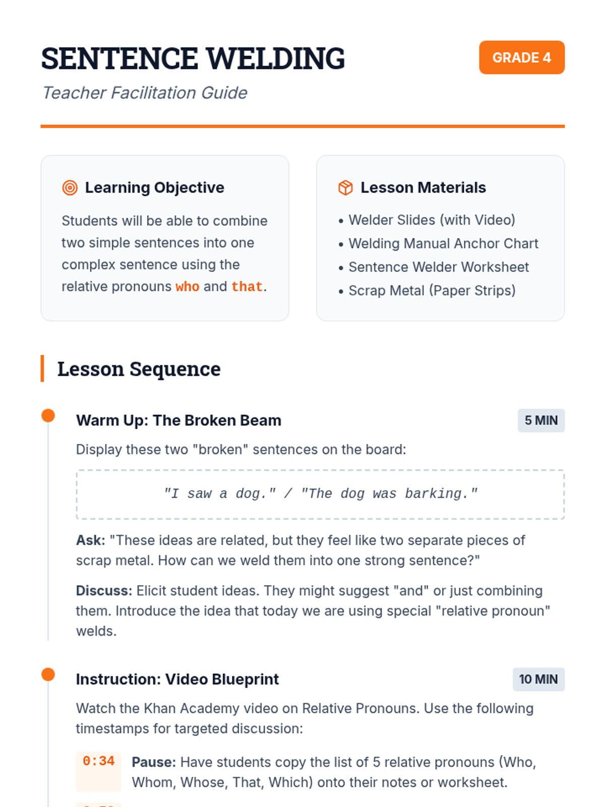 Students learn to use relative pronouns 'who' and 'that' to combine simple sentences into complex ones through a hands-on 'welding' metaphor. The lesson includes a video-based introduction, interactive slides, and a creative practice worksheet.
