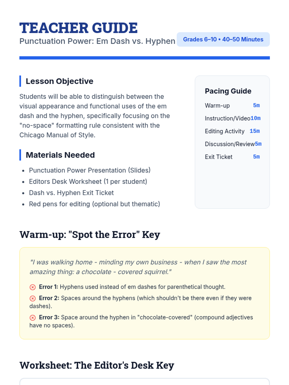 A comprehensive lesson for 6th-10th grade students focusing on the functional and formatting differences between em dashes and hyphens, featuring a newsroom-themed editing activity.