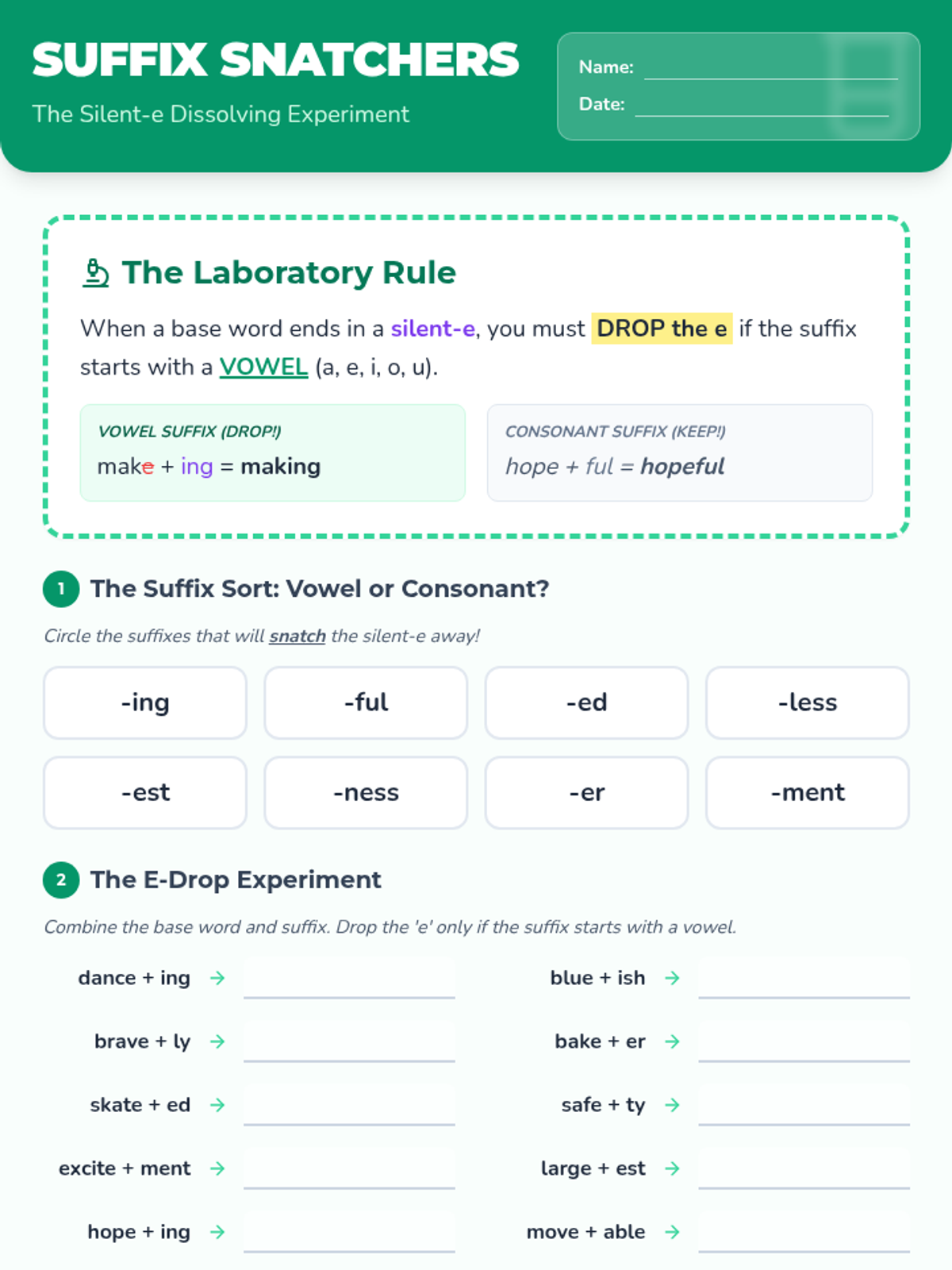 A comprehensive lesson where students investigate the meanings and usage of the suffixes -able and -ible through context clues and hands-on word building.