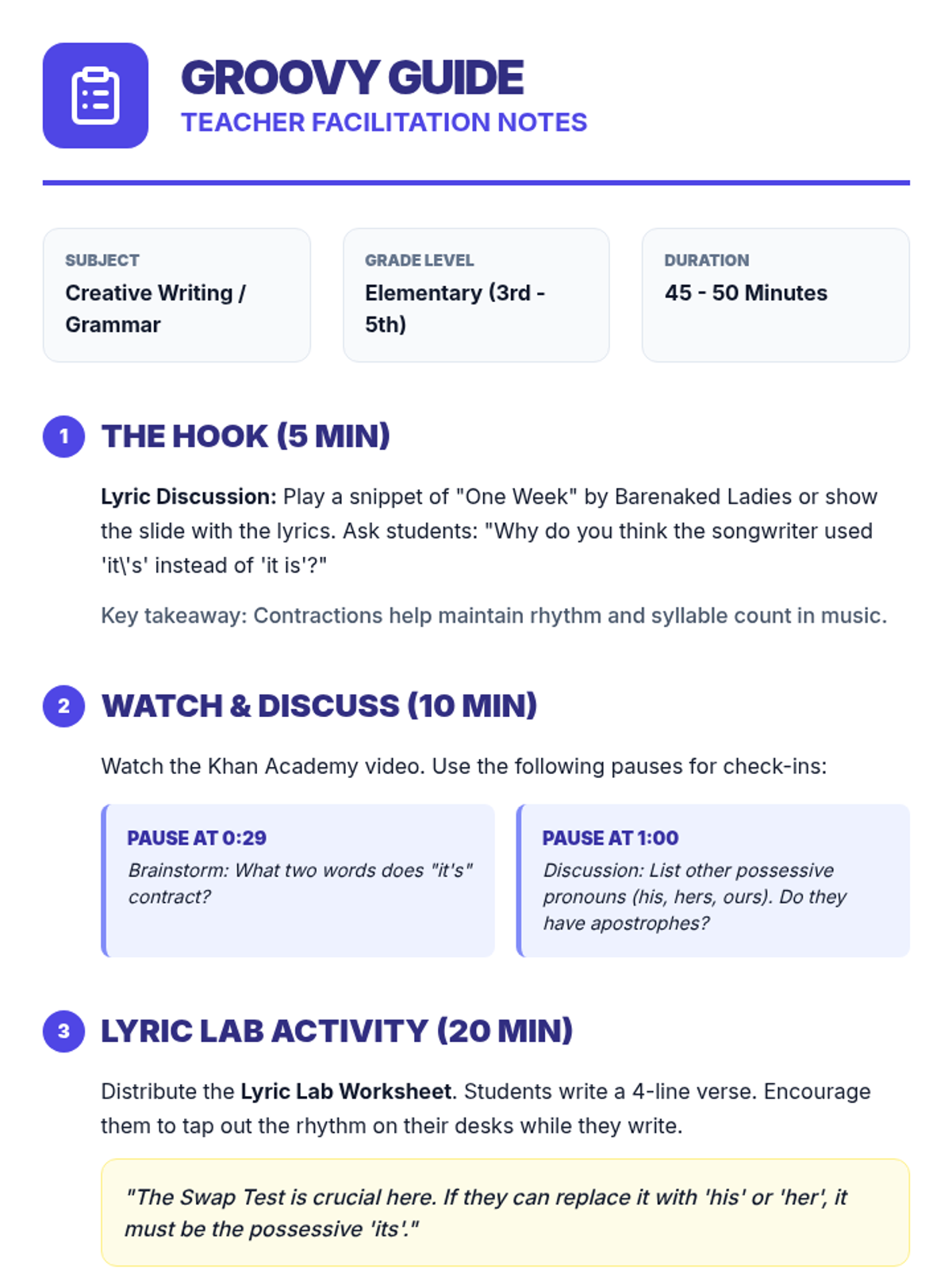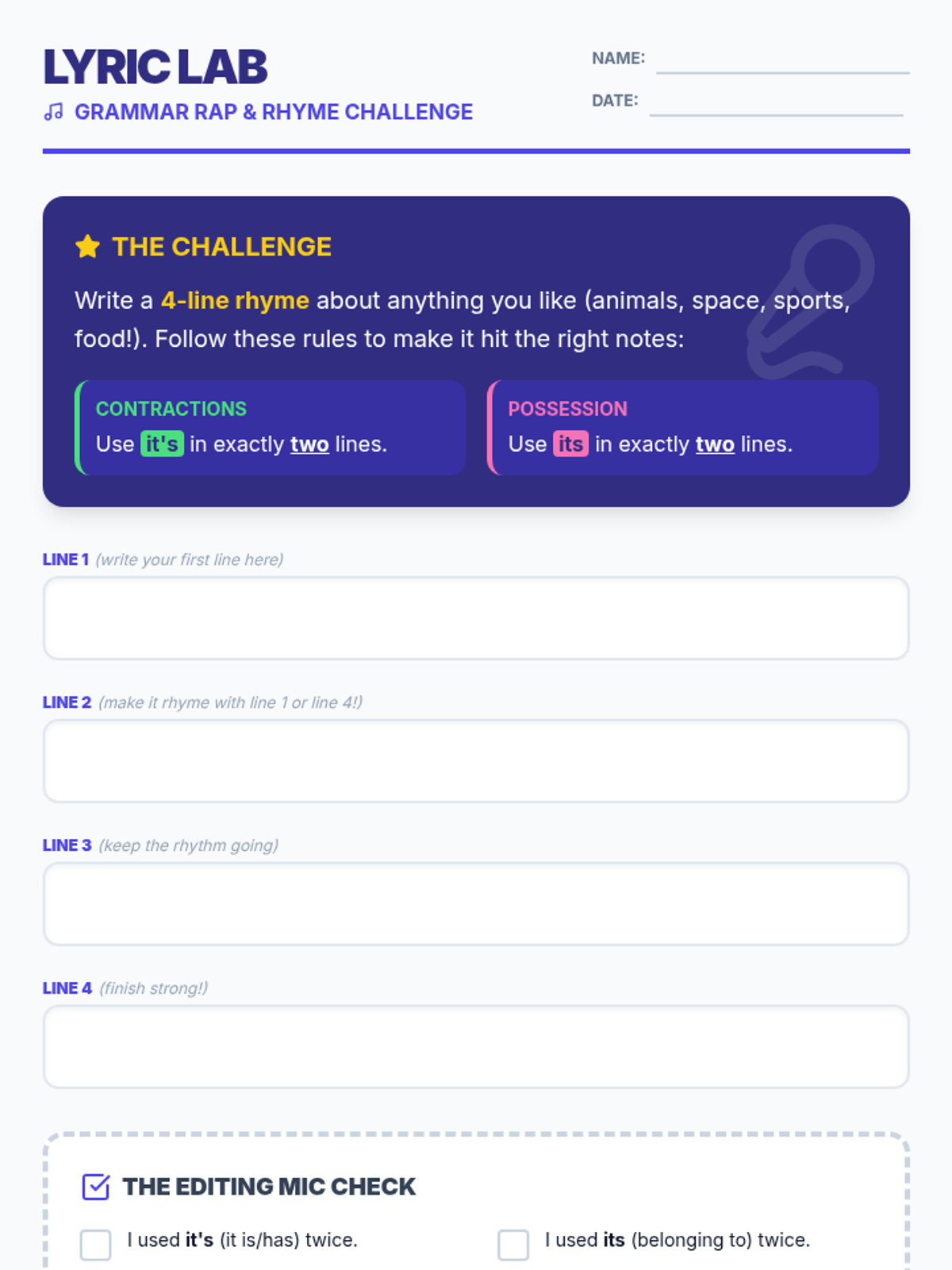 A creative writing lesson for elementary students focusing on the difference between 'it's' and 'its' through songwriting and rhyming. Students learn to distinguish between contractions and possessive pronouns using a music-inspired theme.