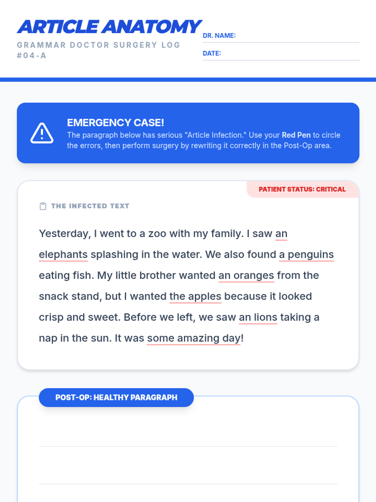A medical-themed grammar lesson where students act as 'Grammar Doctors' to diagnose and treat incorrect article usage with singular and plural nouns. Students use a Khan Academy video as their medical reference to perform 'surgery' on a paragraph riddled with errors.