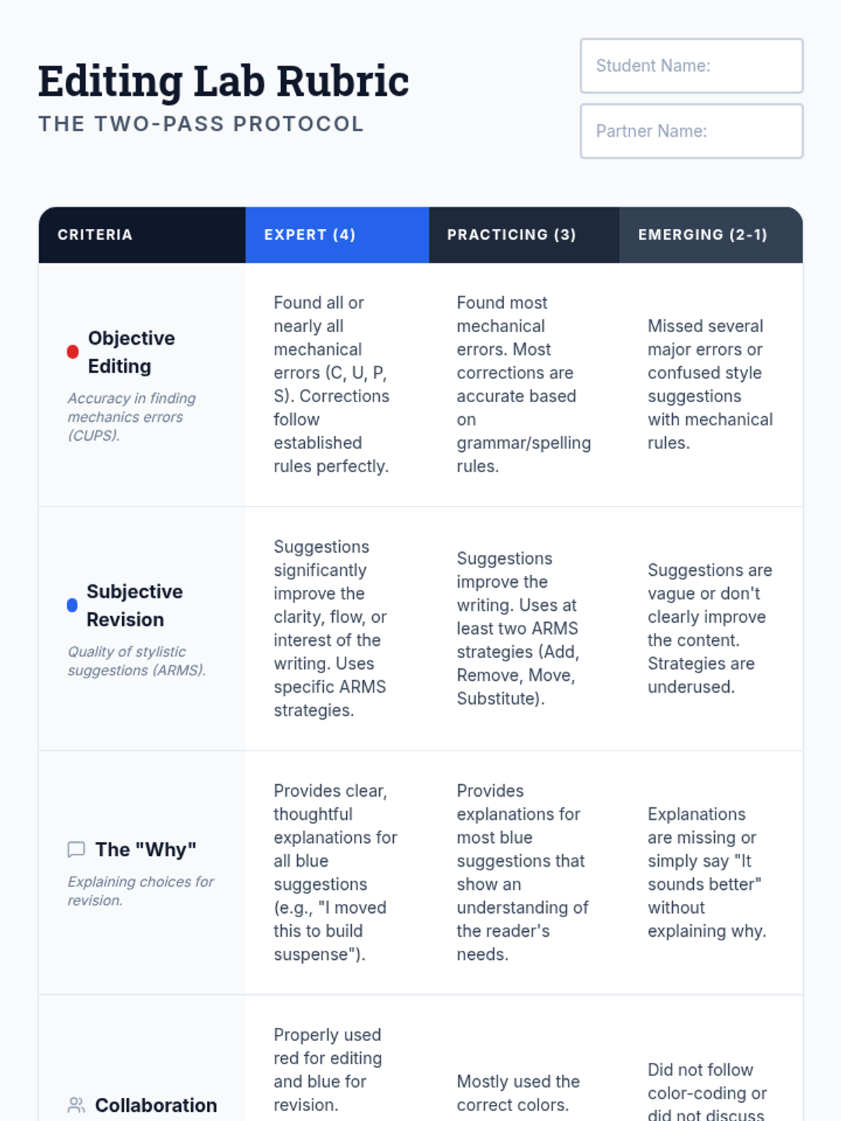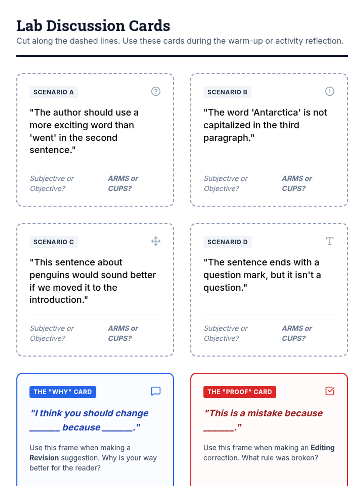 A comprehensive lesson for 5th-6th grade students to master the difference between subjective revision (style) and objective editing (mechanics) using the ARMS and CUPS strategies.