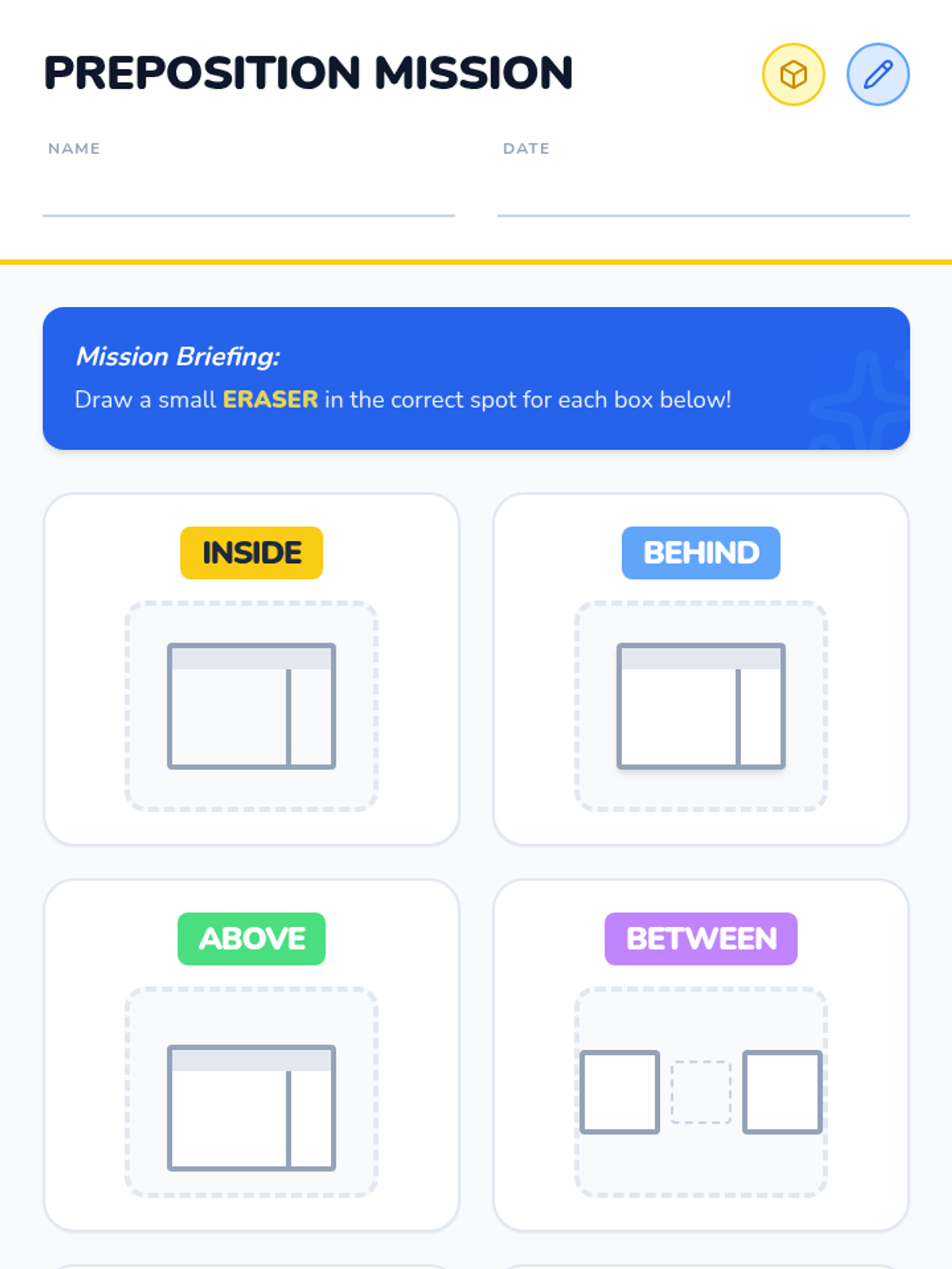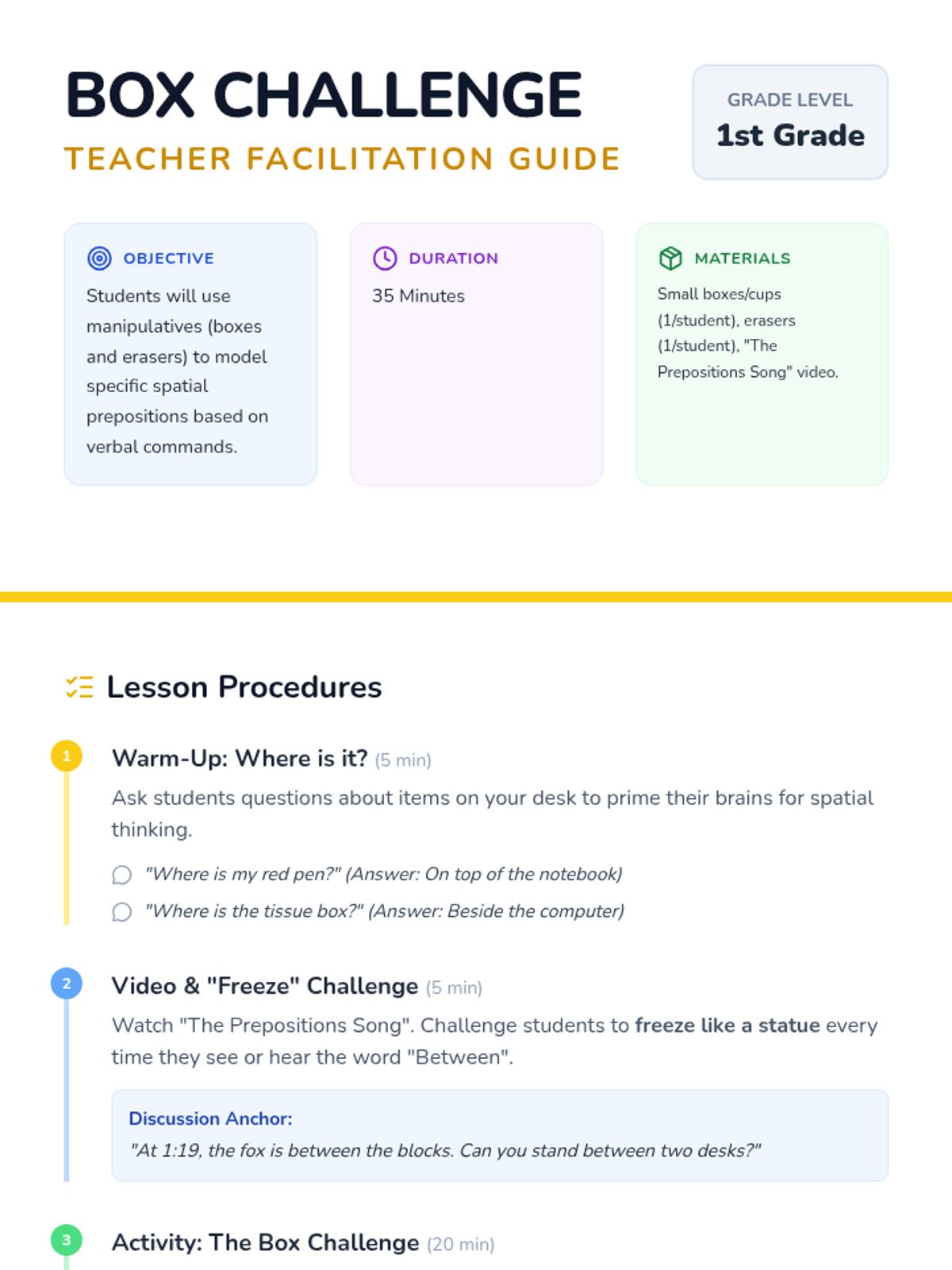 A hands-on 1st Grade lesson where students use manipulatives and a catchy song to master spatial prepositions like inside, behind, and between.