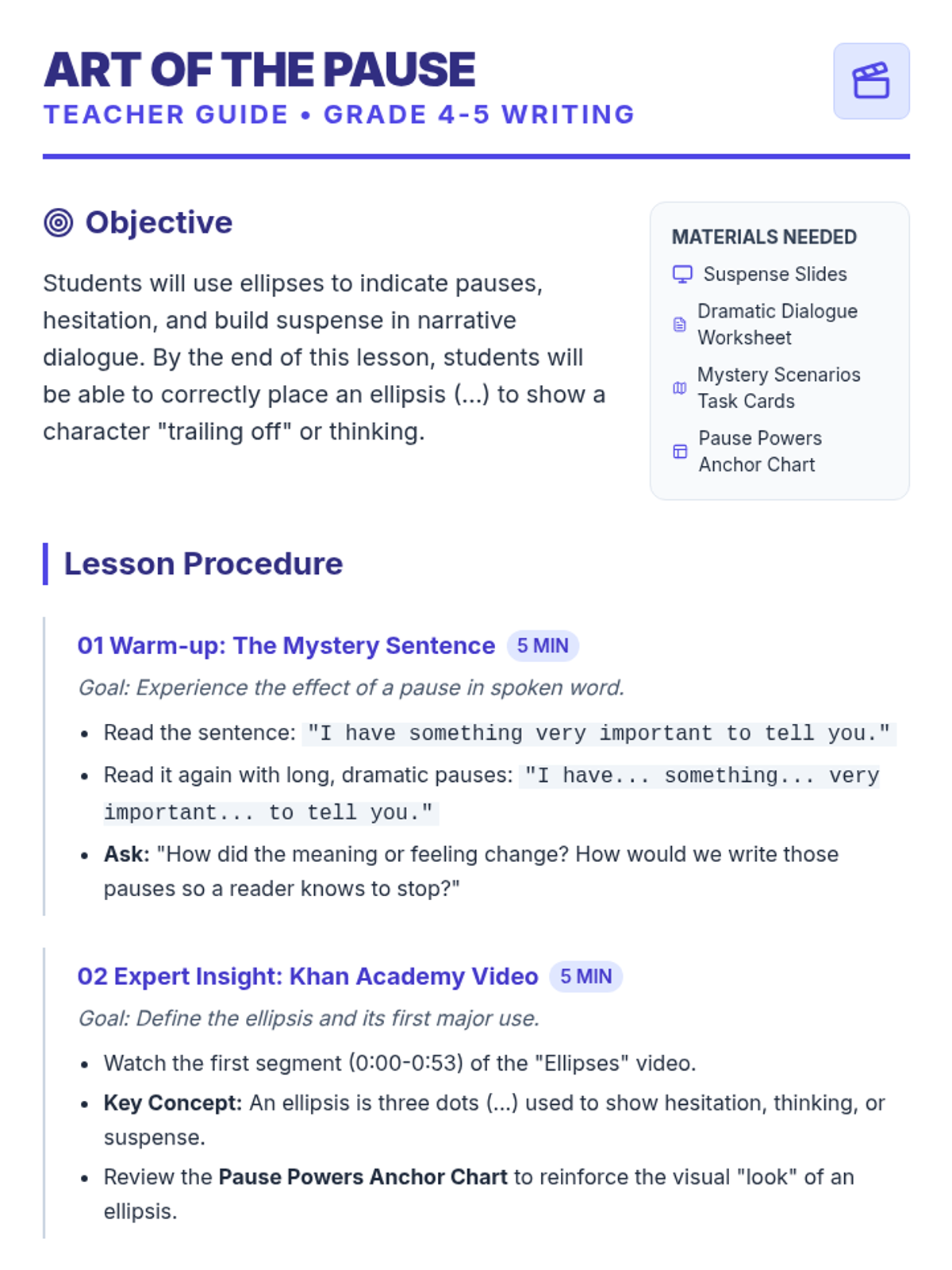 Students learn to use ellipses to indicate hesitation, thinking, and dramatic suspense in dialogue and narrative writing through a theater-themed exploration.