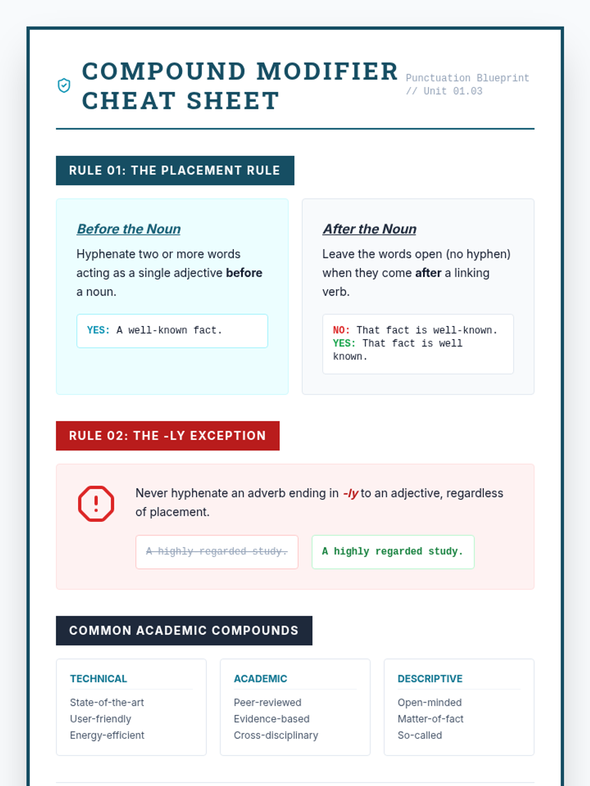 Master the punctuation rules for compound adjectives, focusing on the use of hyphens before and after nouns in academic writing.