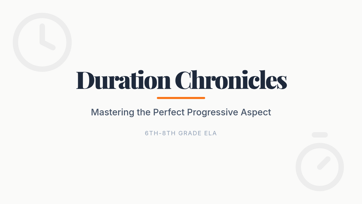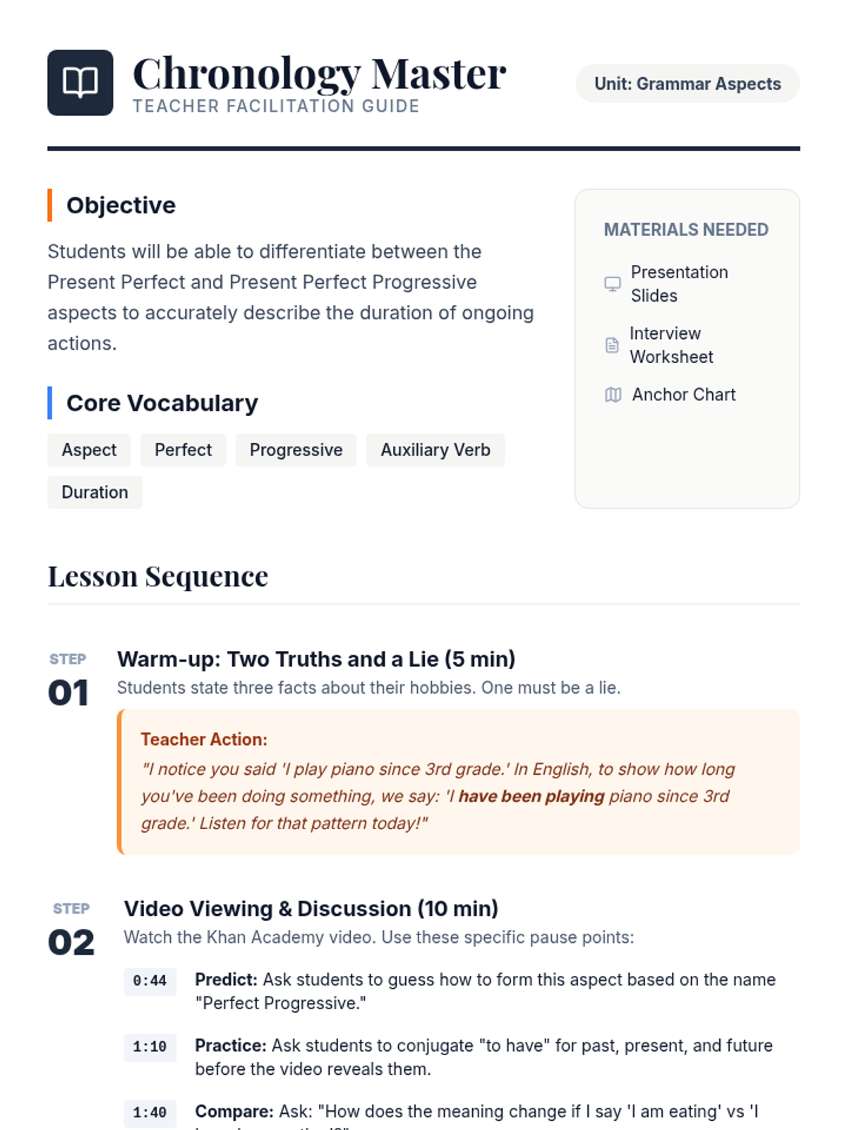 A middle school ELA lesson focused on mastering the Present Perfect Progressive aspect to describe duration, featuring a Khan Academy video, an interview activity, and a visual anchor chart.