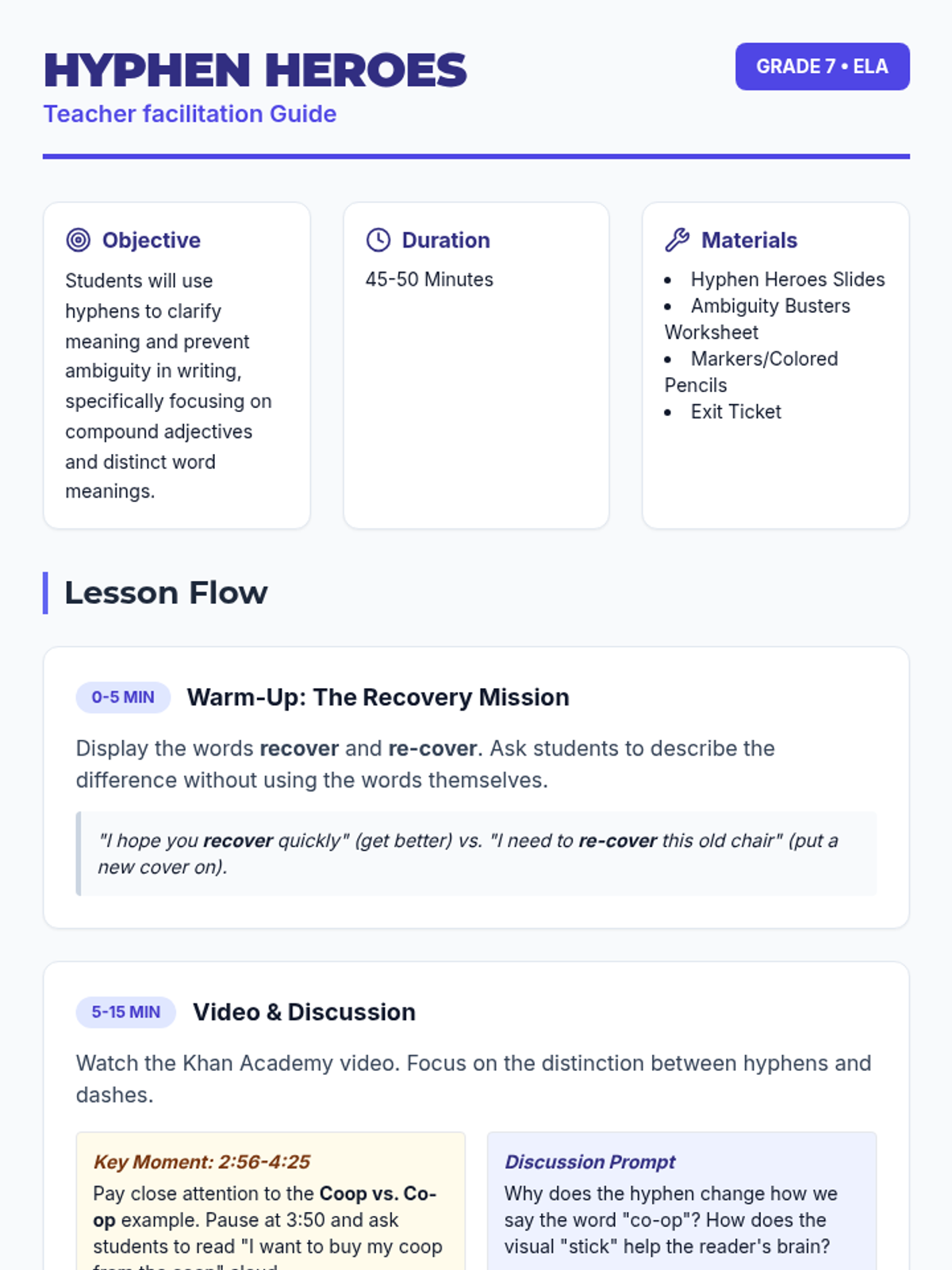 A 7th-grade lesson focused on using hyphens to clarify meaning, eliminate ambiguity, and distinguish between similar-looking words. Students will explore the 'coop vs. co-op' example and engage in creative illustration to see how a single 'little stick' changes everything.