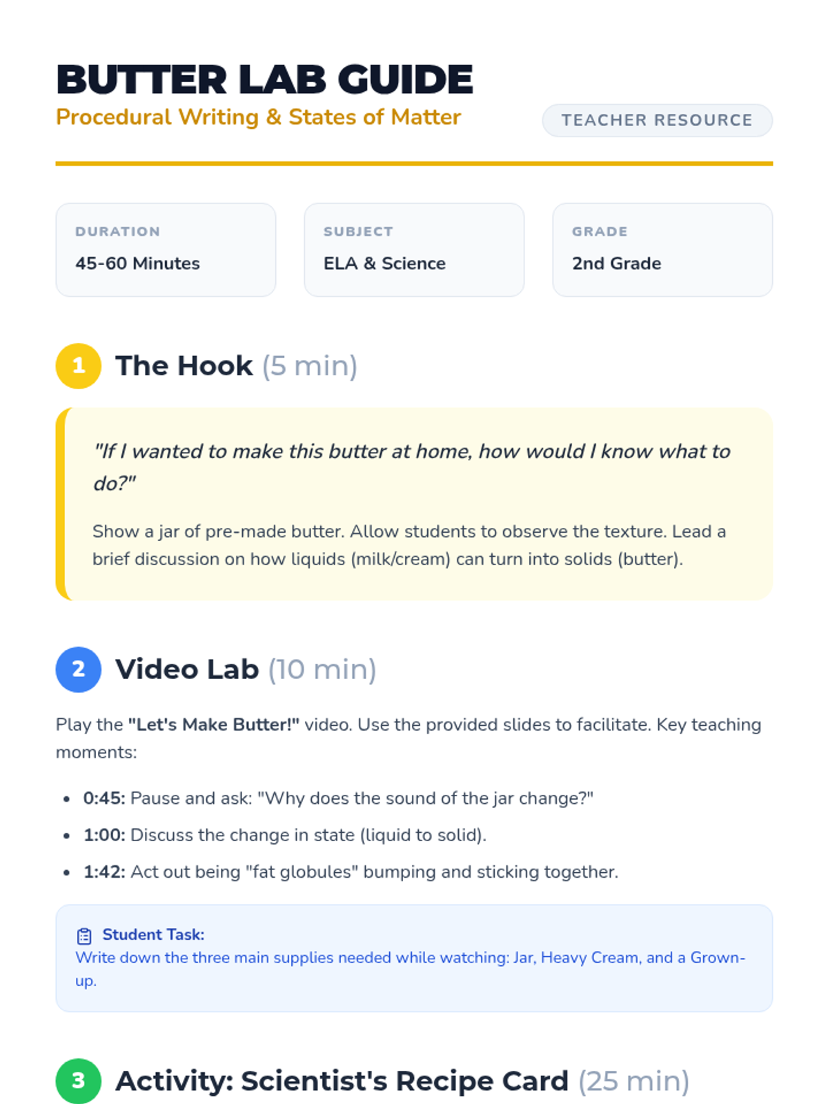 A 2nd-grade science and writing lesson where students watch a video about making butter and then write a formal procedural text, explaining both the steps and the science behind the change in state.
